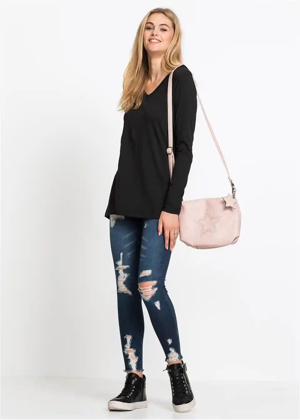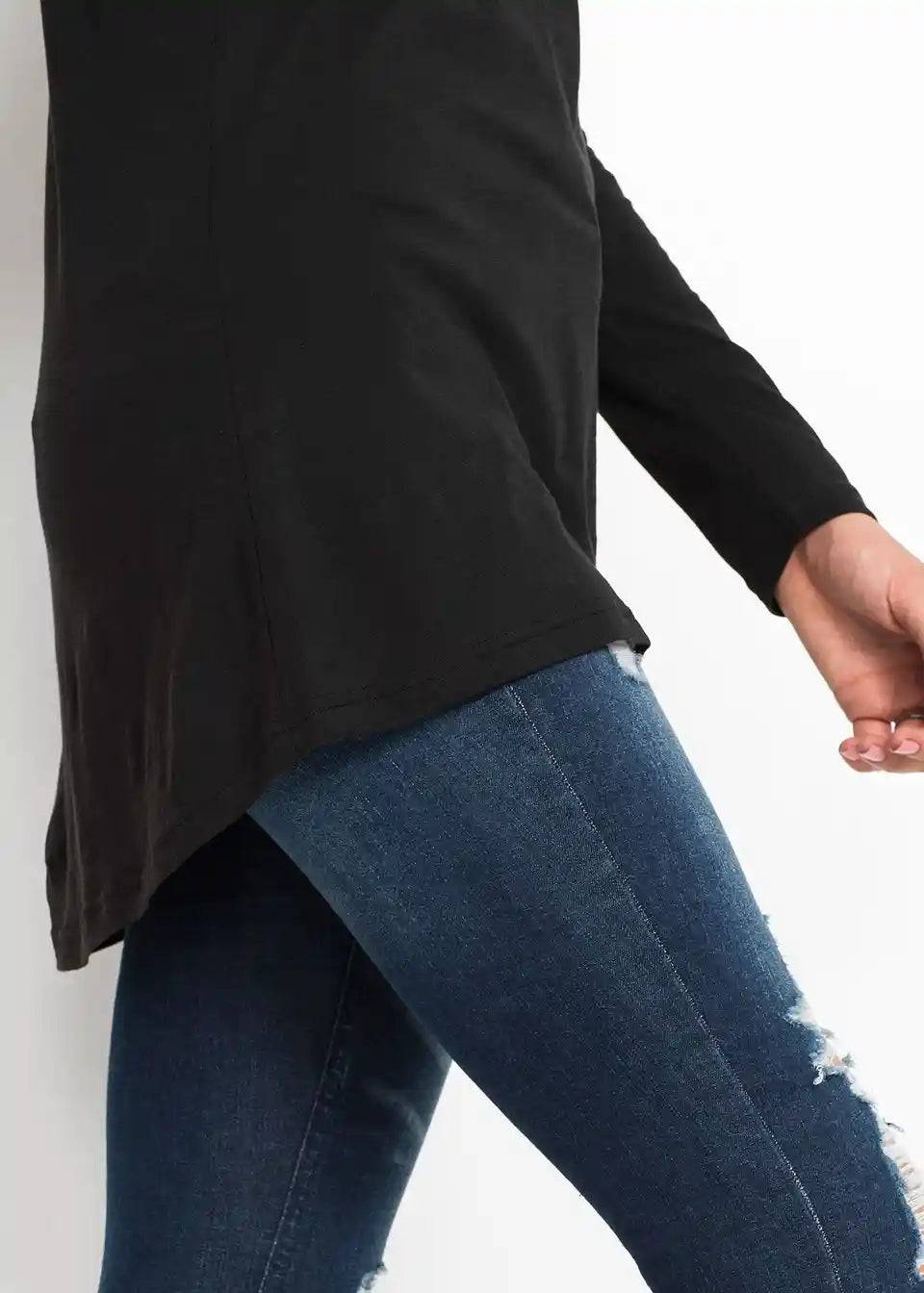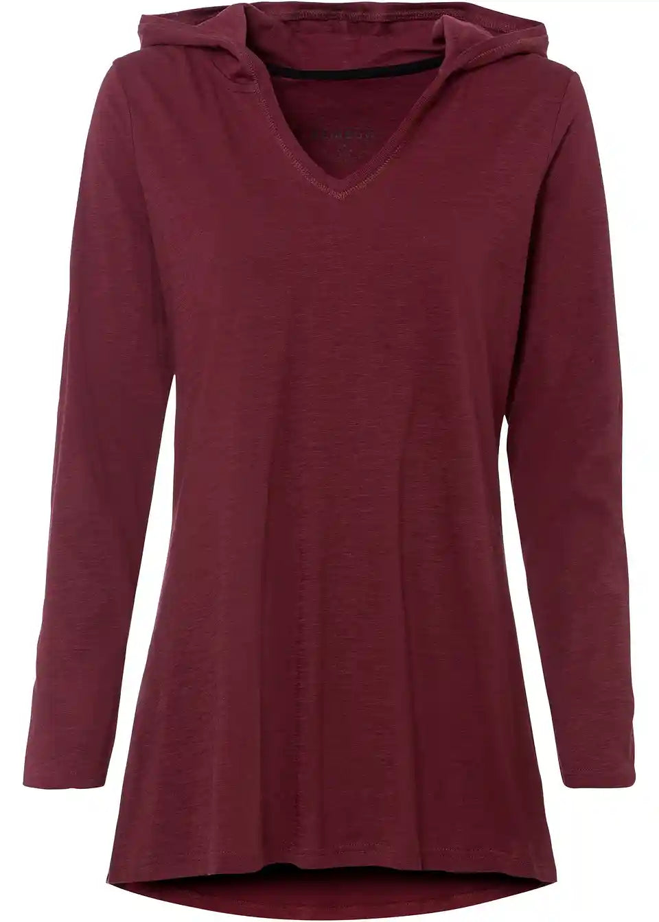 S svojo posebno sproščenostjo prepriča ta majica s kapuco, krojena v lahkotni O-liniji. Modni detajli so velik srčast V-izrez ter okrasni in robni trak. Hrbtni del z zaobljenim robom je nekoliko daljši od sprednjega dela. Model z umirjenim videzom je idealen za kombiniranje z ozkimi spodnjimi deli, a izgleda odlično tudi kot trendna mini obleka.