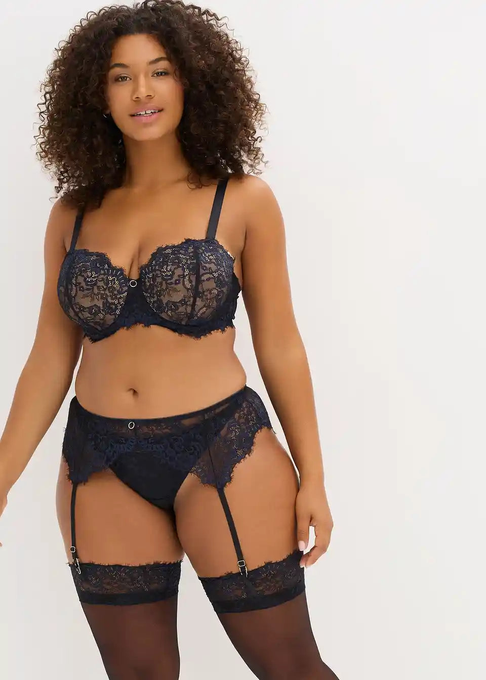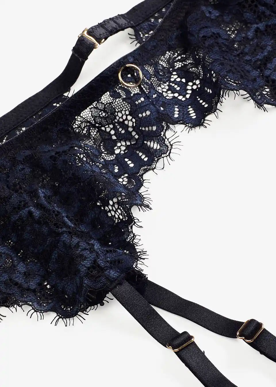 Pas z držkami za nogavice iz prefinjene čipke z resastim robom in recikliranim poliamidom.
