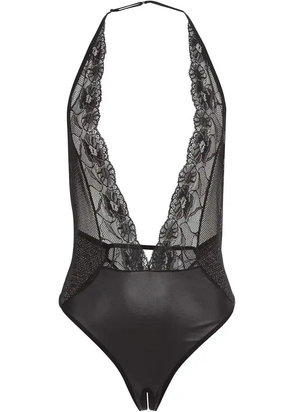 S tem prosojnim stringbodyjem ouvert boste zagotovo presenetili svojega partnerja. Zelo globok izrez omogoča zapeljive poglede, čipkasti vložek pa izžareva erotiko. Na zadnji strani je string okrašen z vznemirljivim bleščečim dodatkom, mednožje pa skriva odprto skrivnost.