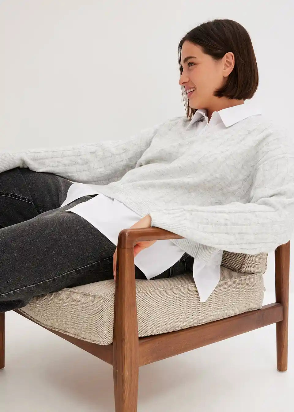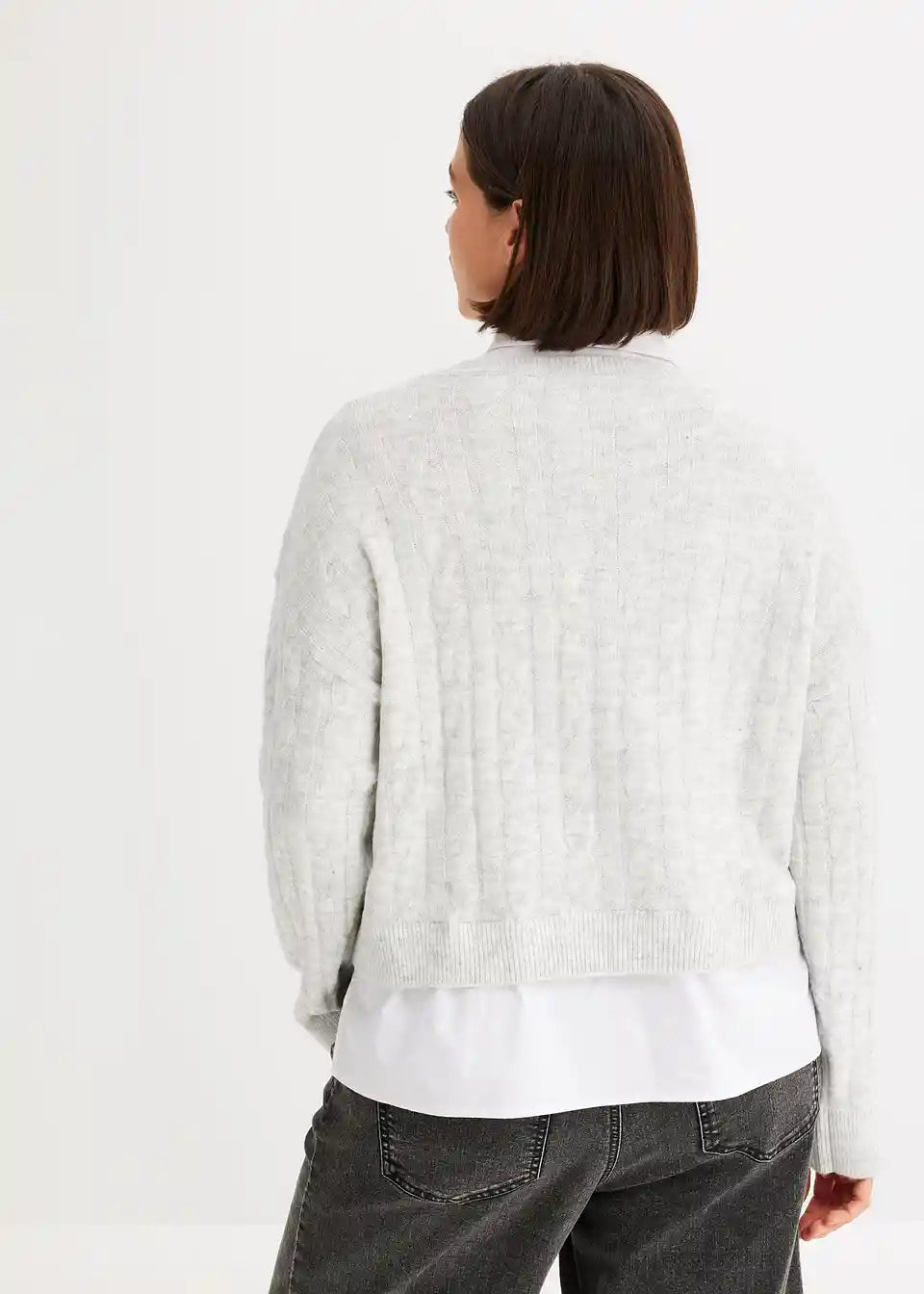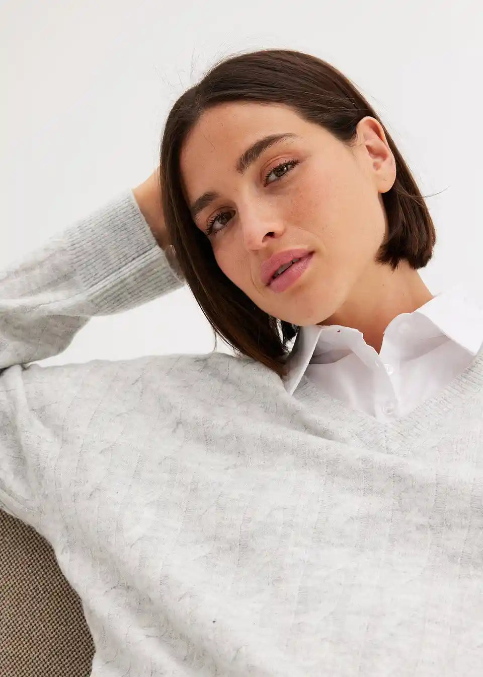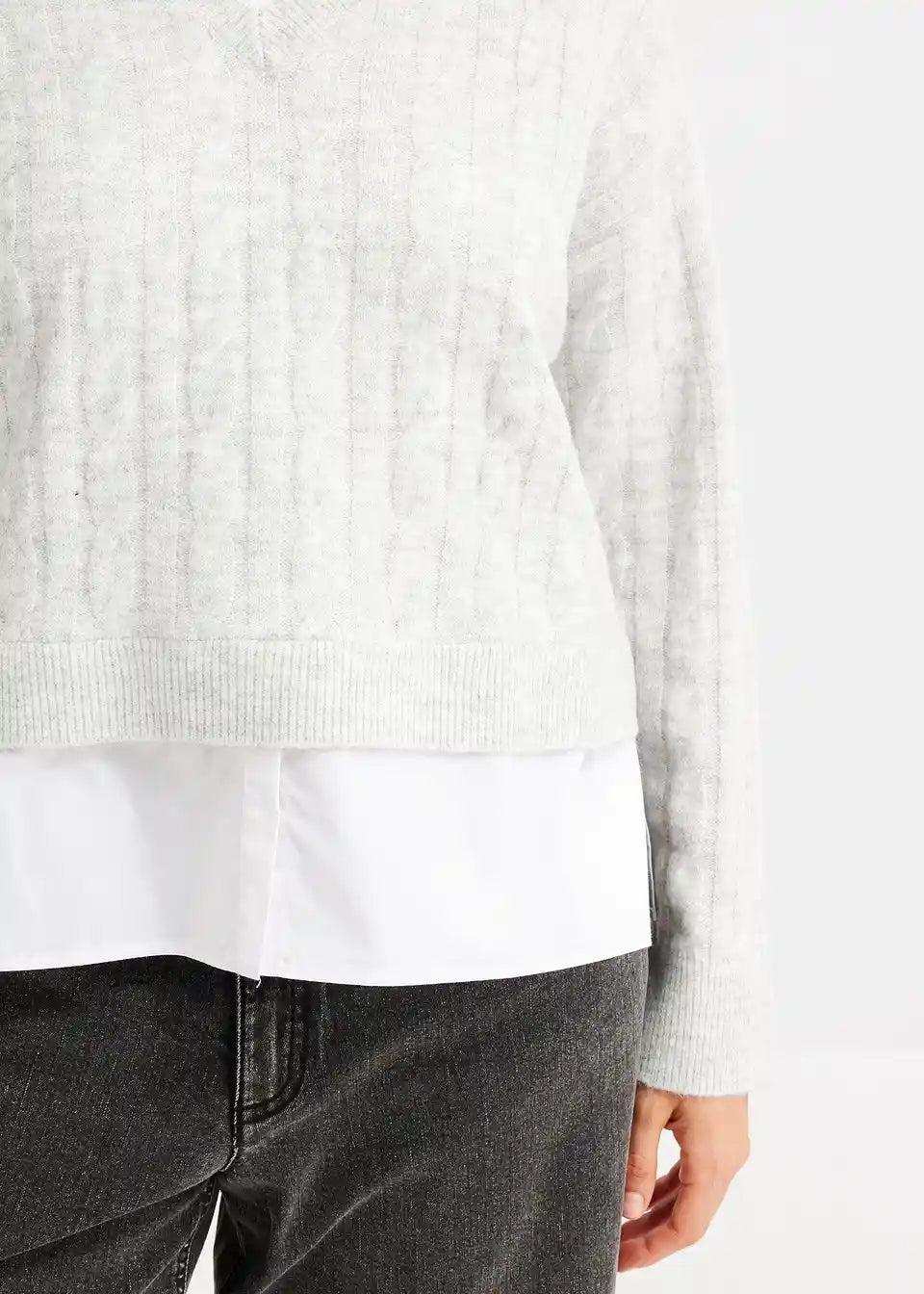 ženstveni pulover z bluznim vložkom in pletenim vzorcem