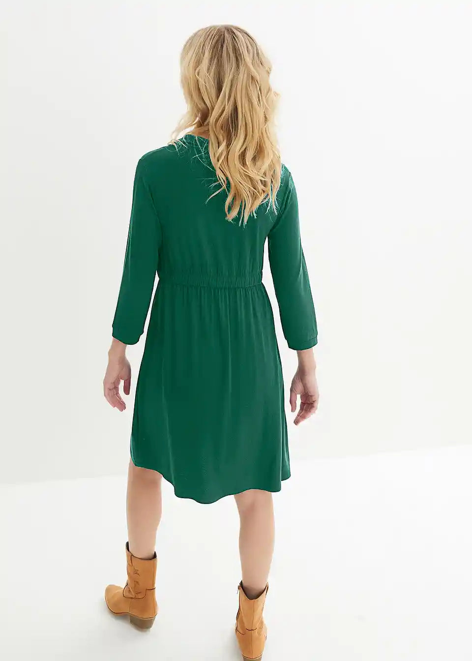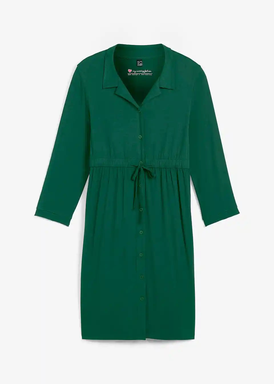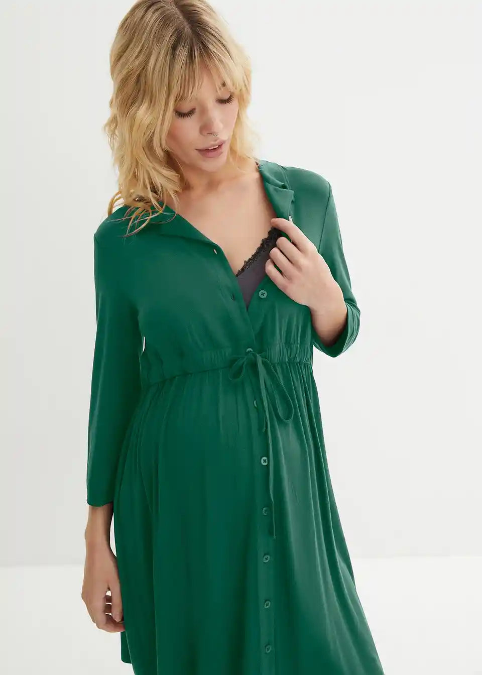 Bluzasta obleka iz mehkega viskoznega džersija iz trajnostne pridelave. S ovratnikom in 3/4 rokavi. Celotno zapenjanje z gumbi omogoča enostavno dojenje in olajša oblačenje ter slačenje. Z elastičnim vezalnim pasom pod prsmi.