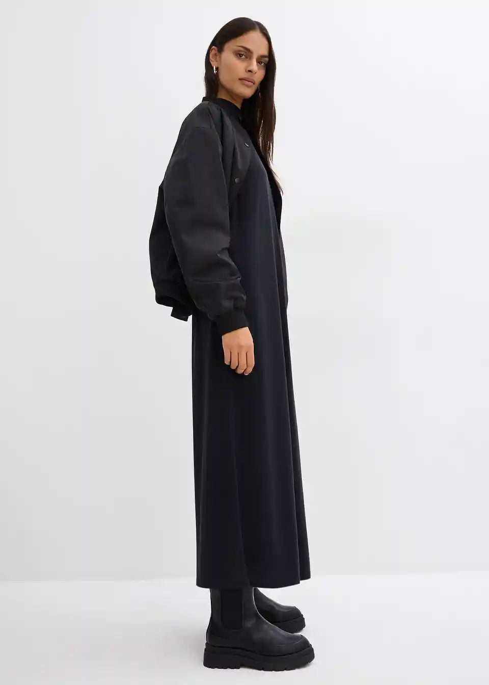 Široka majica-obleka iz mehkega modalnega mešanice z visokim ovratnikom in šivanim detajlom na sredini hrbta