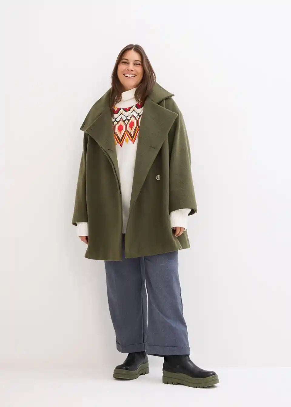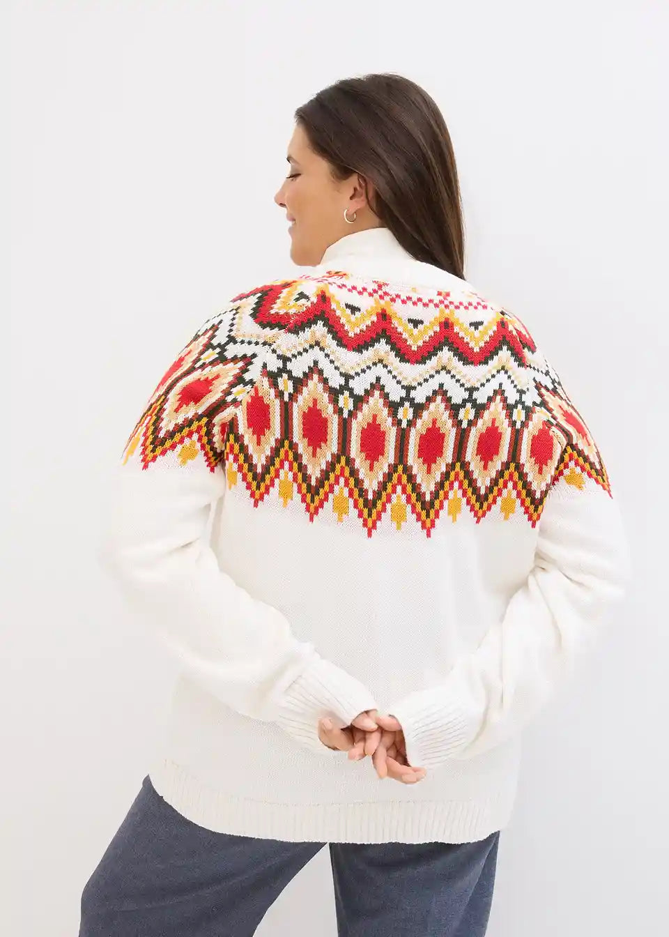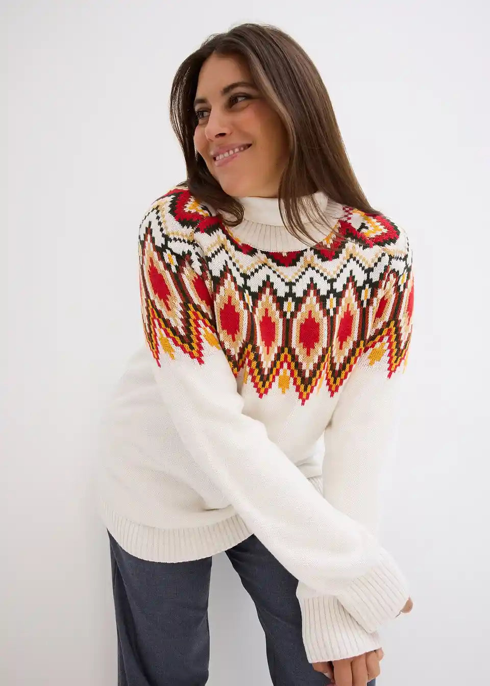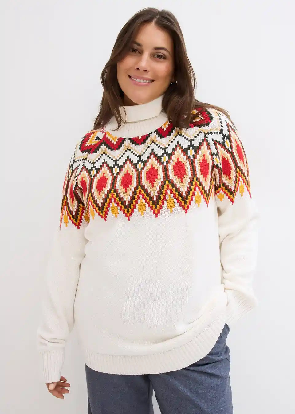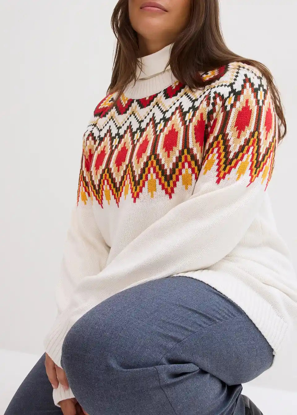 Ohlapen norveški pulover, ki nežno objame postavo