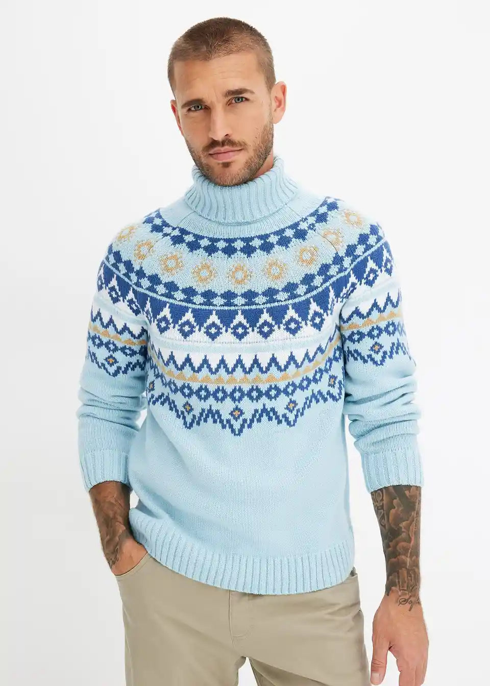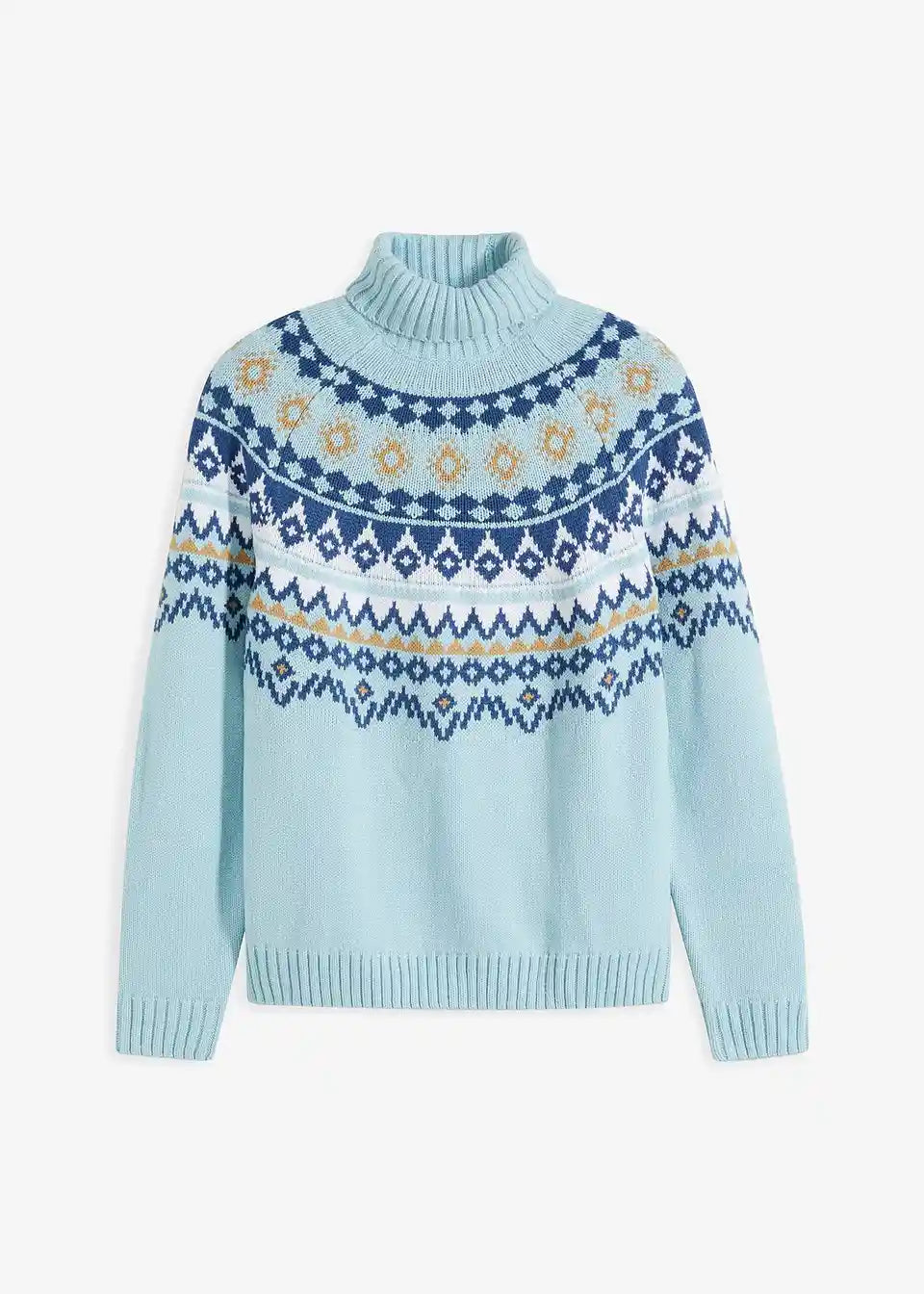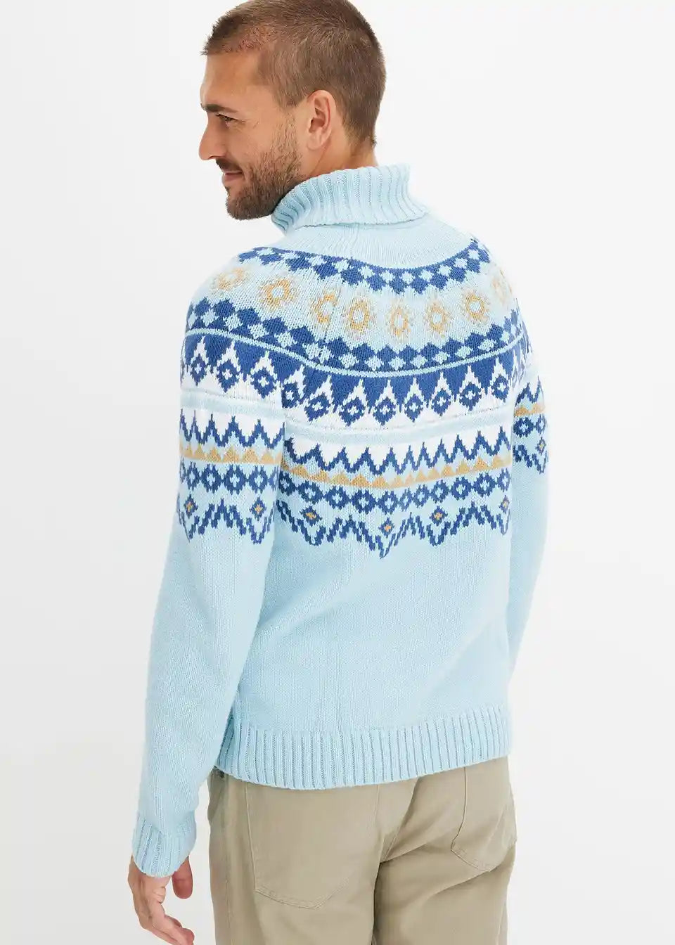 lep pulover z rolko in norveškim motivom ter rebrastimi patenti na robu ter rokavih