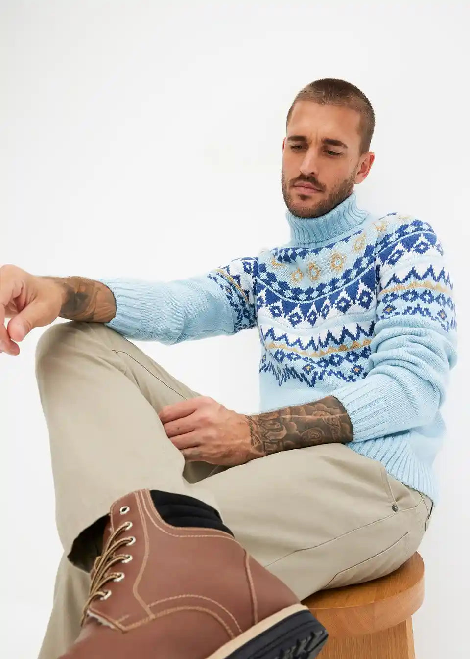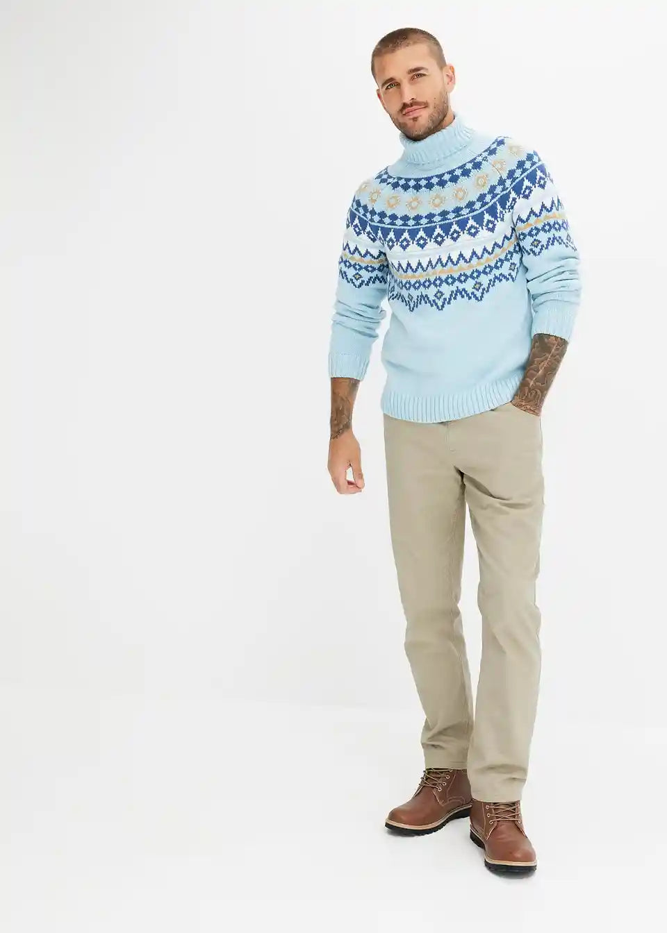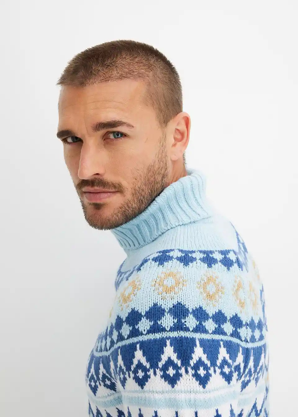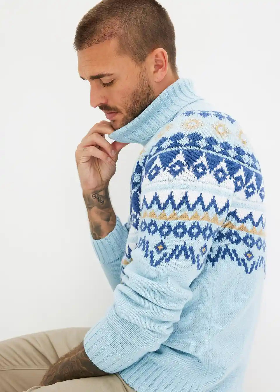 lep pulover z rolko in norveškim motivom ter rebrastimi patenti na robu ter rokavih