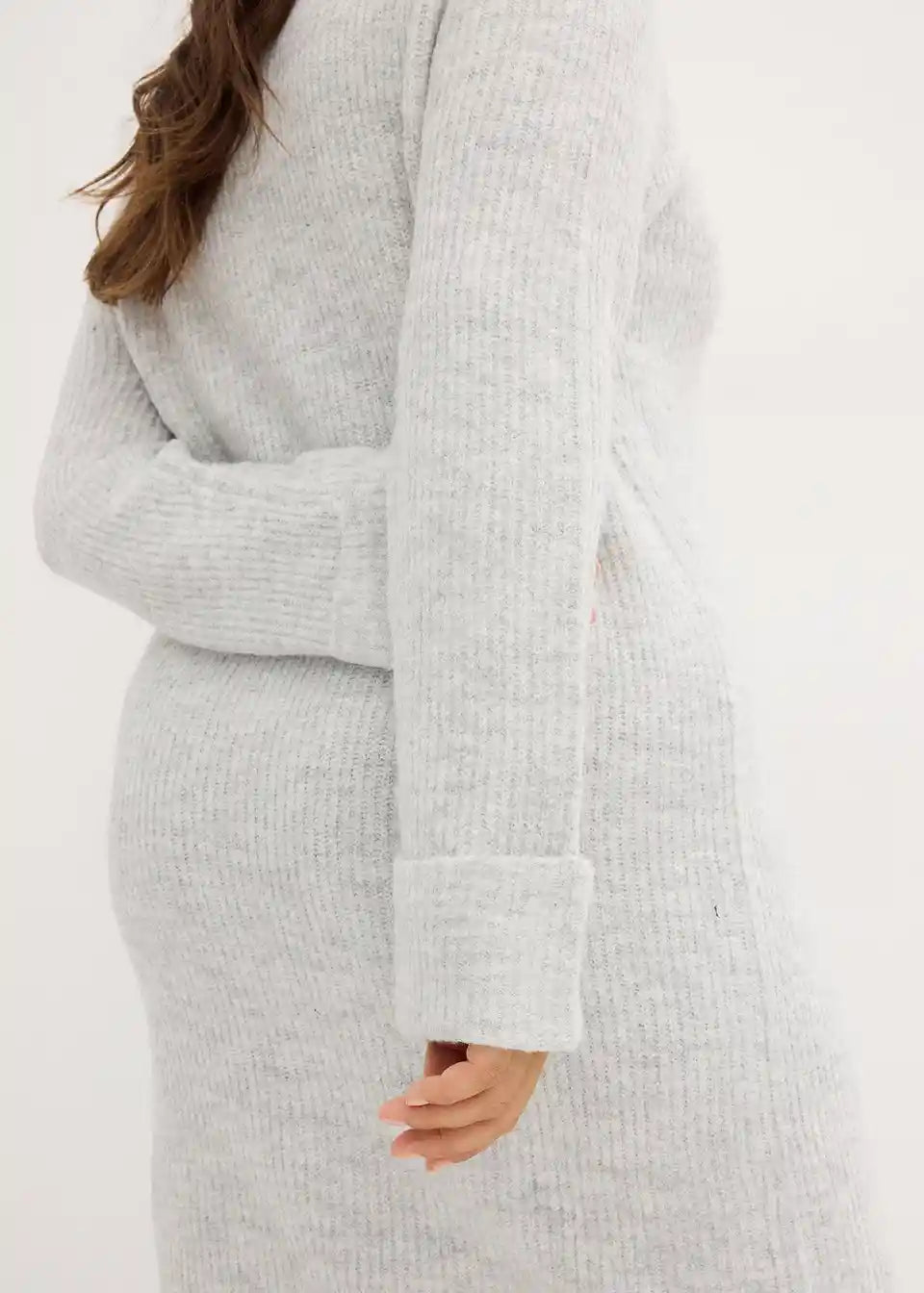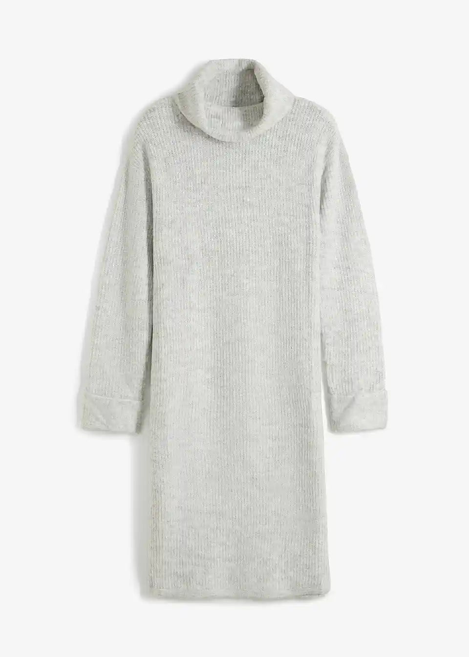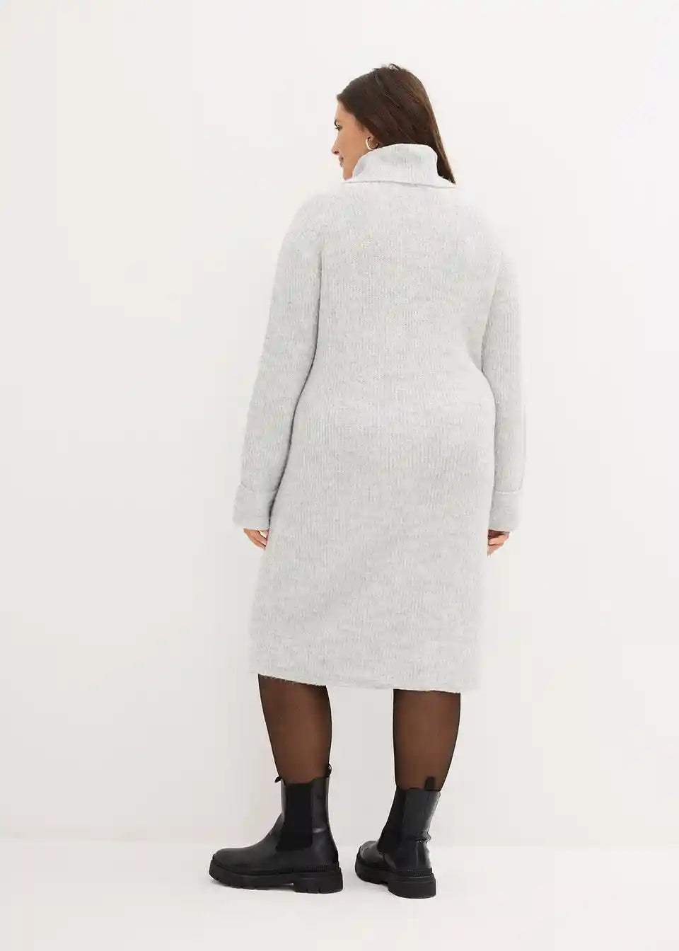 Prilegajoča pletena obleka objame vrat z visokim ovratnikom iz rebraste tkanine