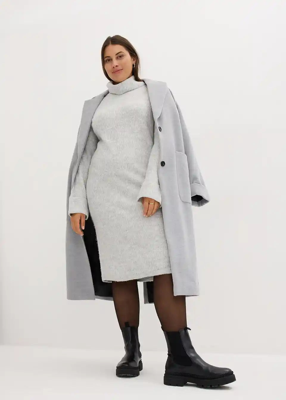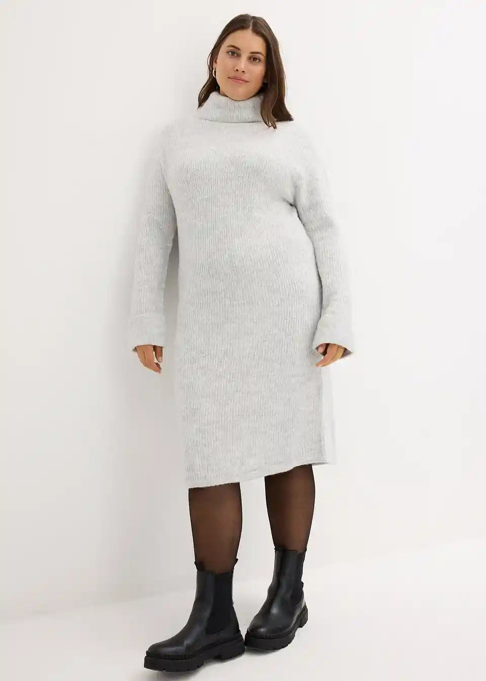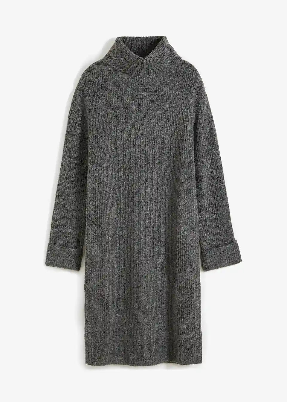 Prilegajoča pletena obleka objame vrat z visokim ovratnikom iz rebraste tkanine