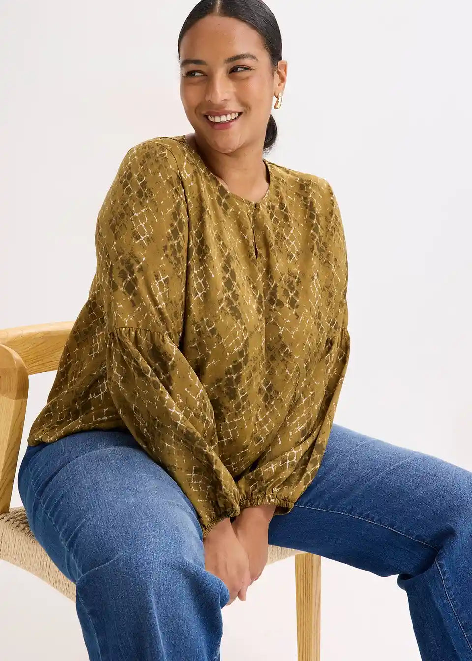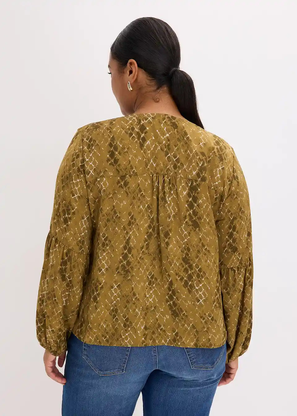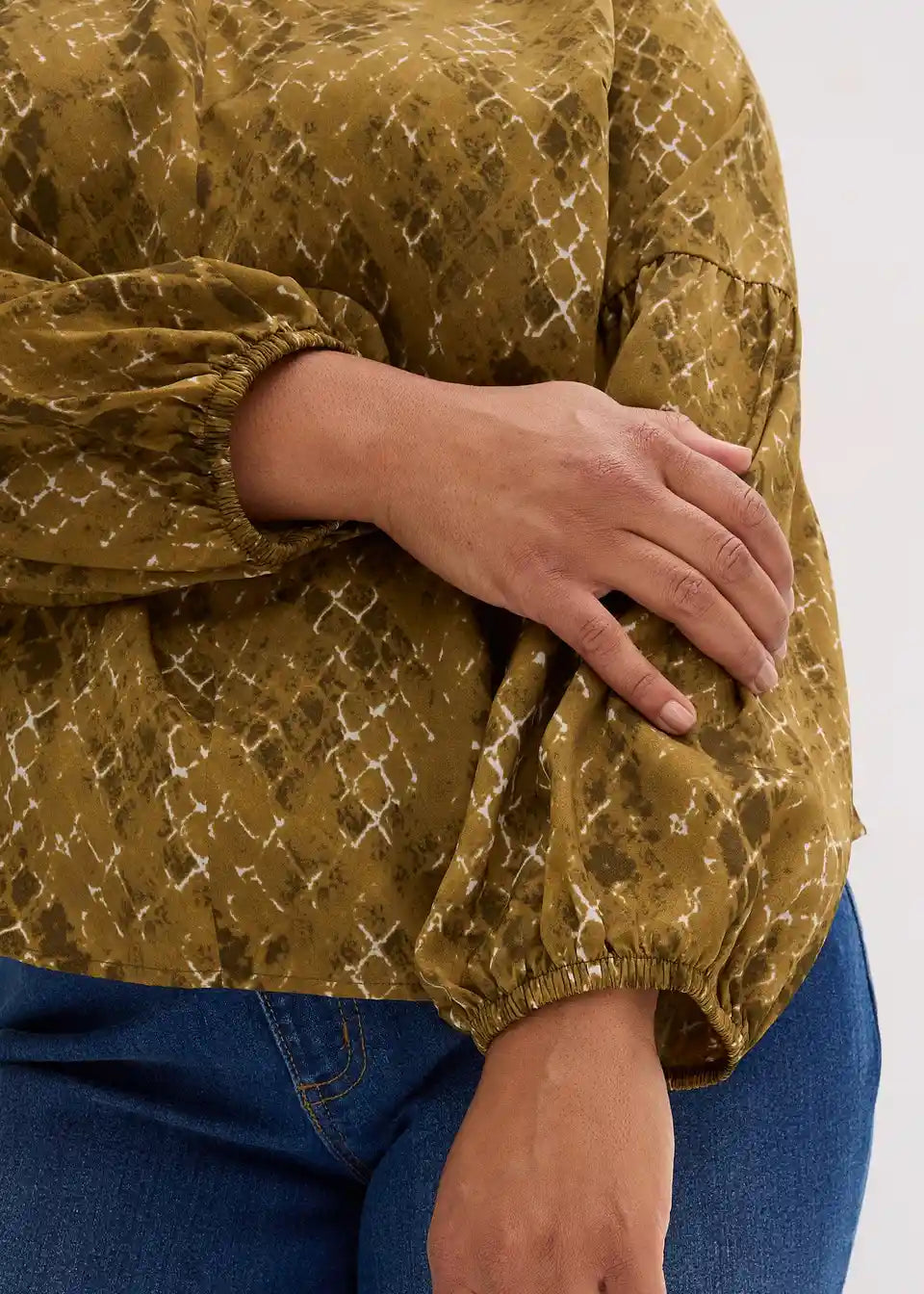 Bluzna tunika z ozkim pokončnim ovratnikom in napihnjenimi rokavi, ki so vse širši proti robu