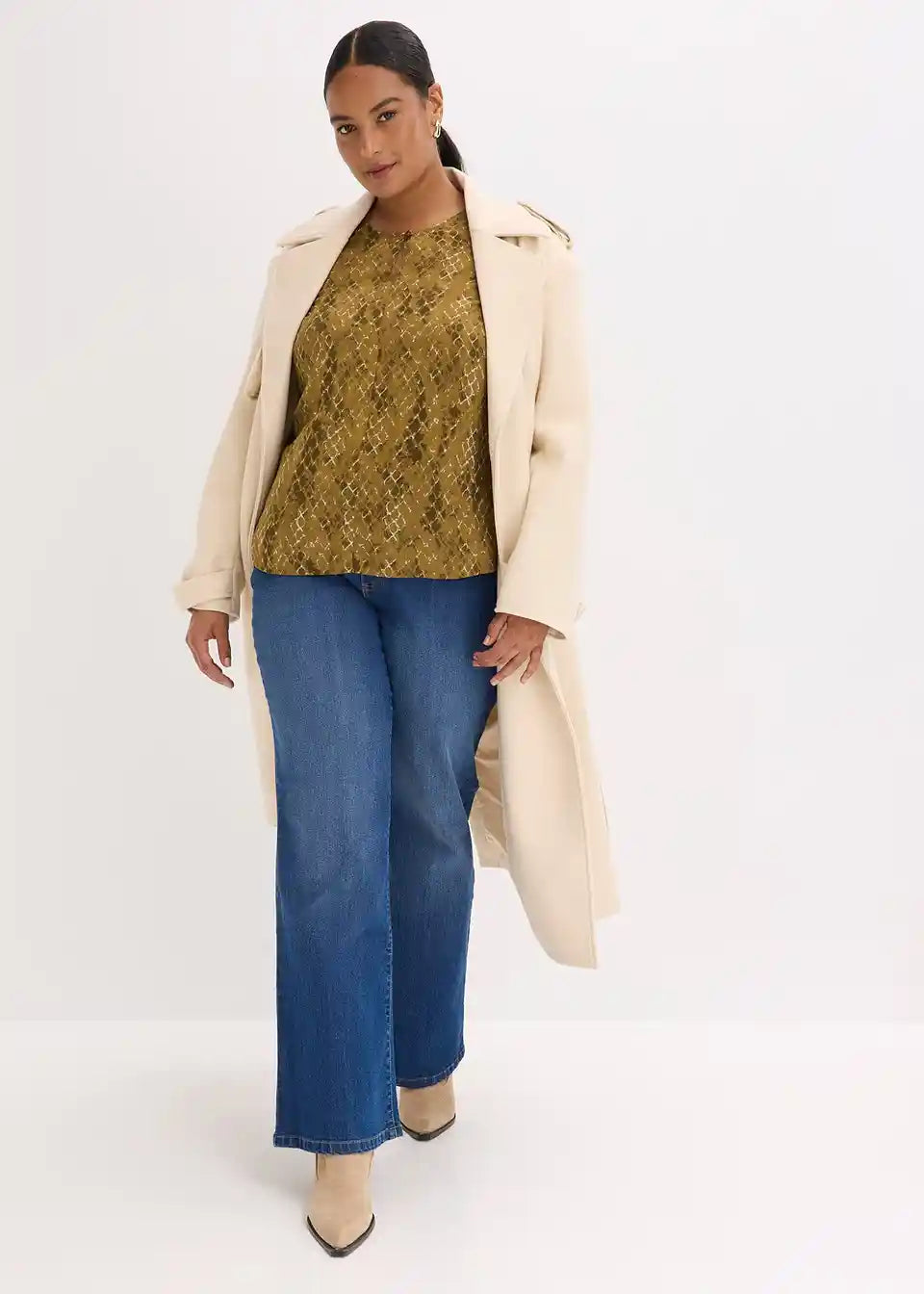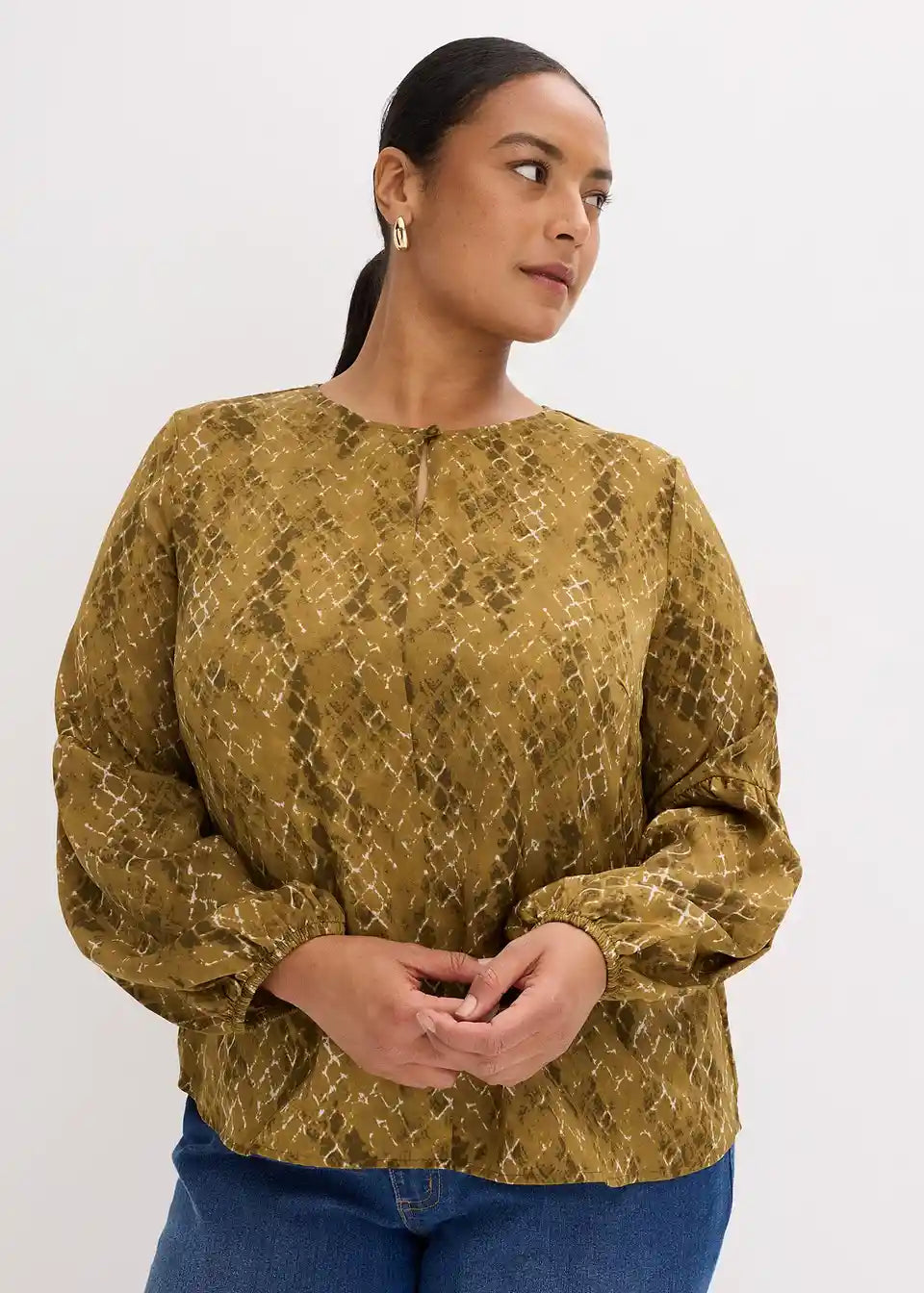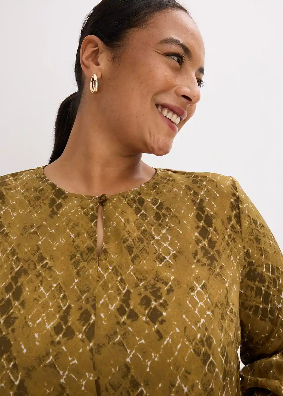 Bluzna tunika z ozkim pokončnim ovratnikom in napihnjenimi rokavi, ki so vse širši proti robu