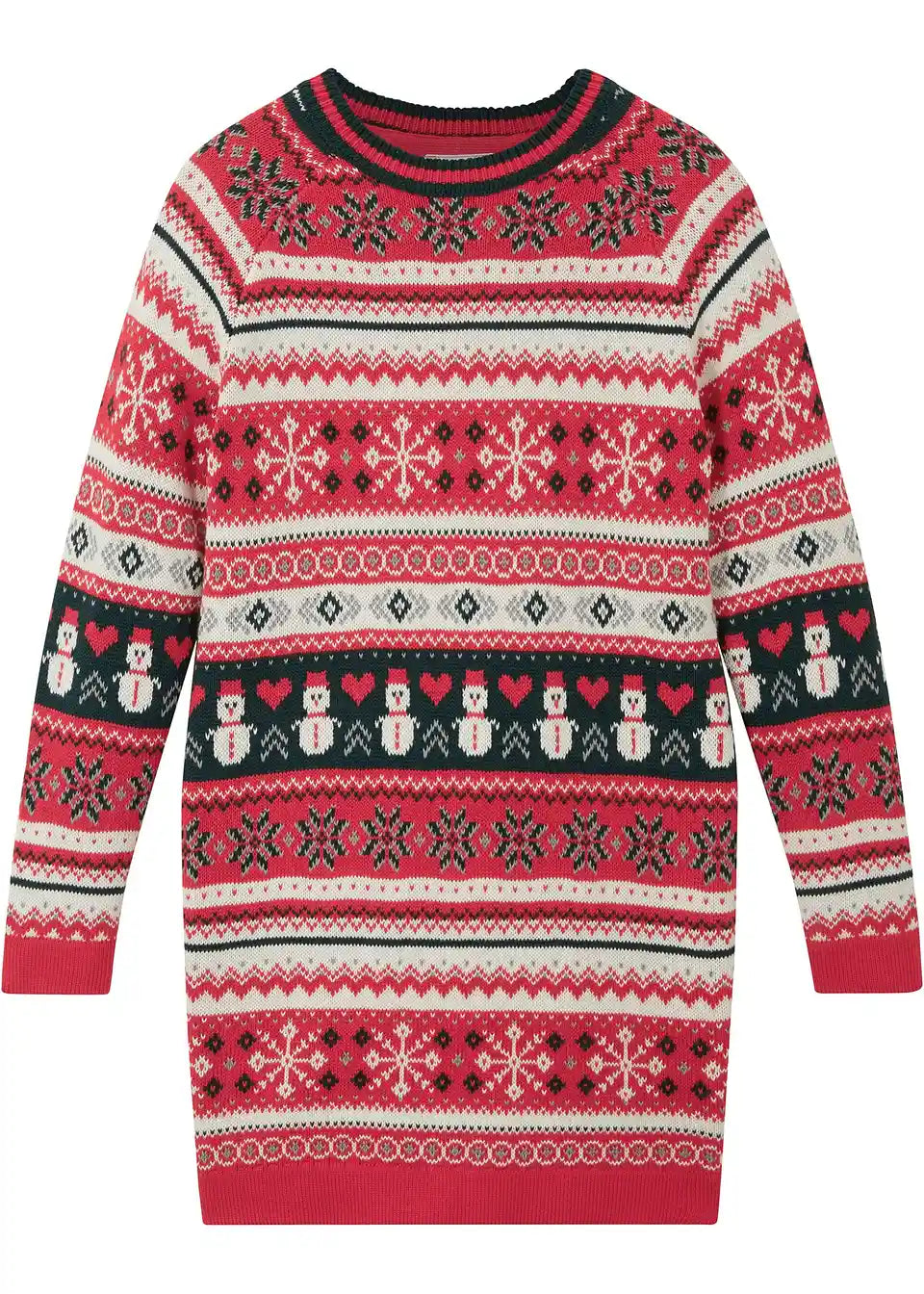 Ta pletena obleka z zimskimi motivi je čudovit poudarek. Izjemno širok rob v rebrasti izvedbi lepo zaključi model za deklice. Tudi zaključki rokavov in okrogel izrez so oblikovani v tem dizajnu. Mehek tanek pleten material in sproščena oblika zagotavljata odlično udobje.