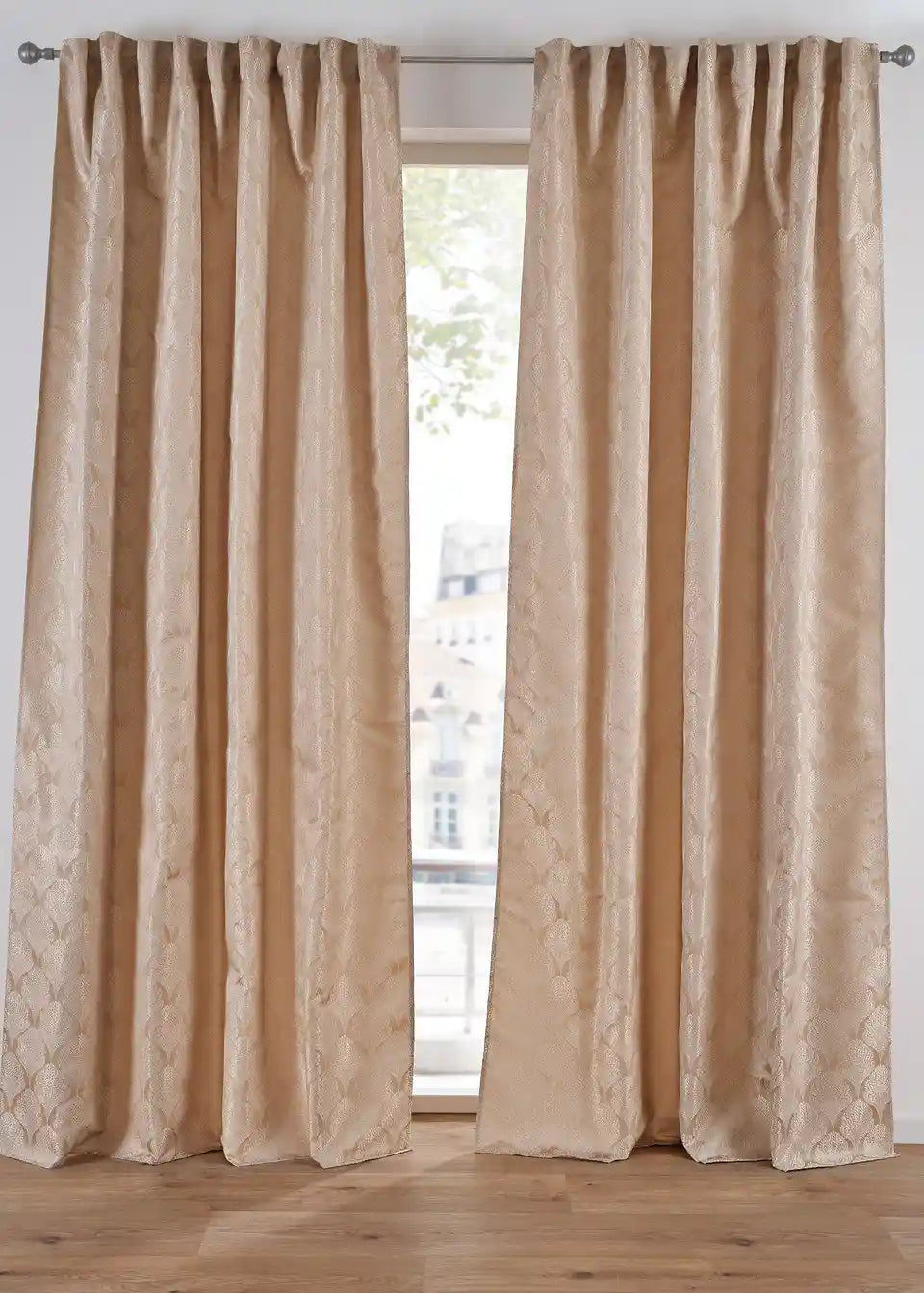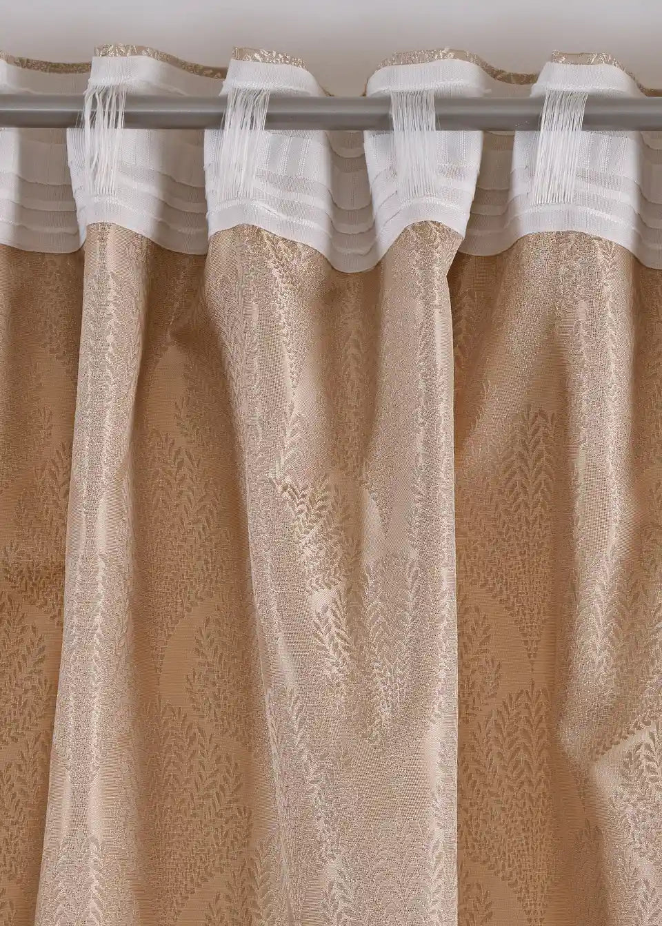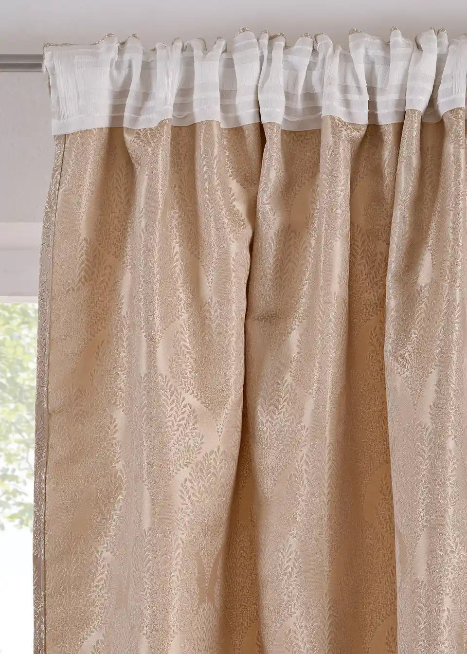 Zelo eleganten in prefinjen zastor iz visokokakovostne Jacquard tkanine. Zastor je v toplem odtenku peska in ima rahlo sijaj.