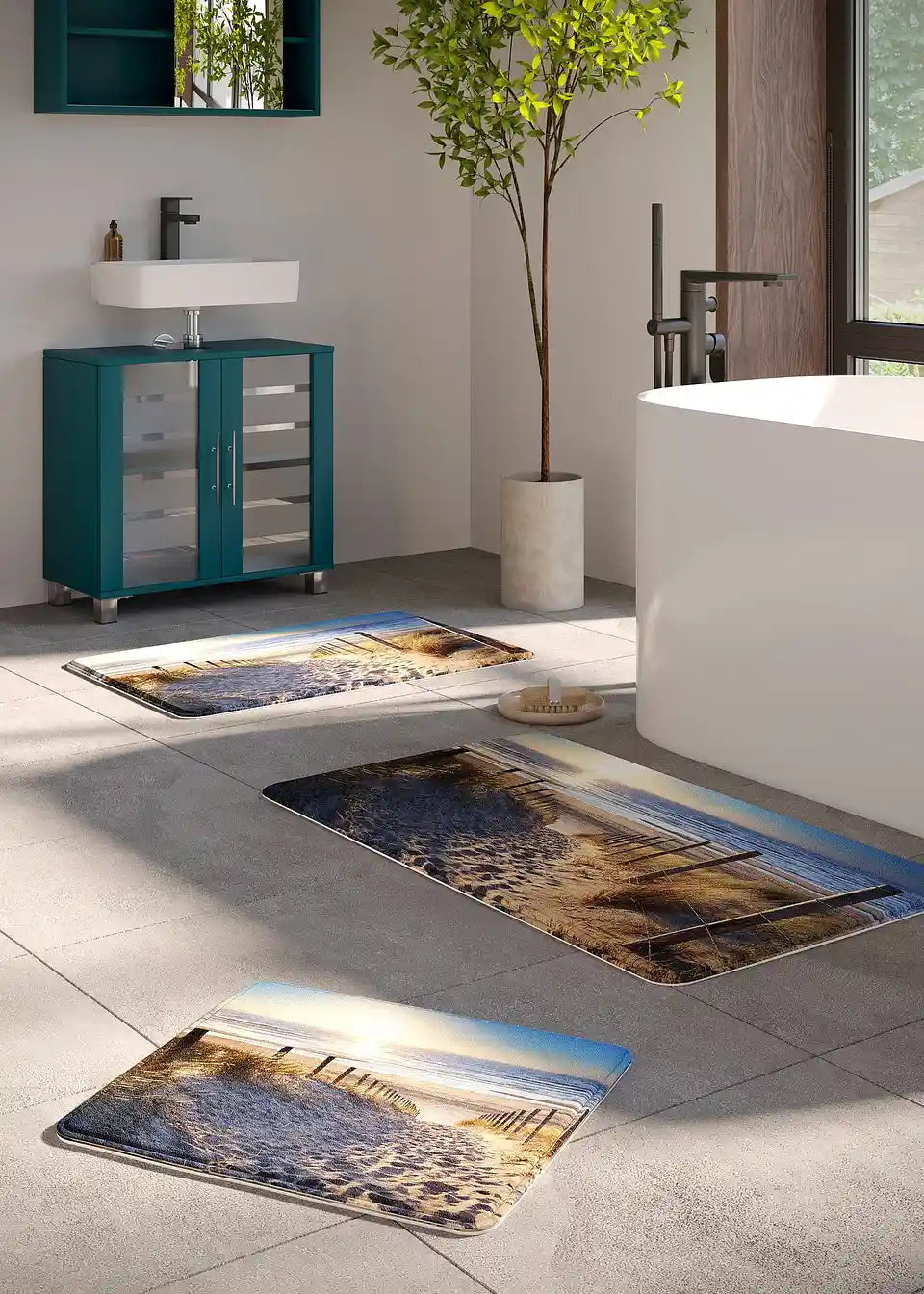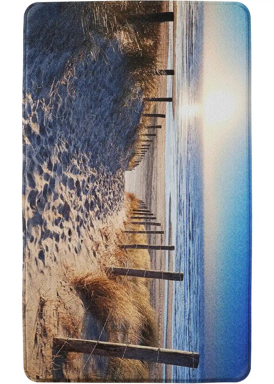 Tiskana kopalniška preproga z morskim motivom, izjemno mehka in hitro sušeča, z Memory peno. Izjemno vpojna