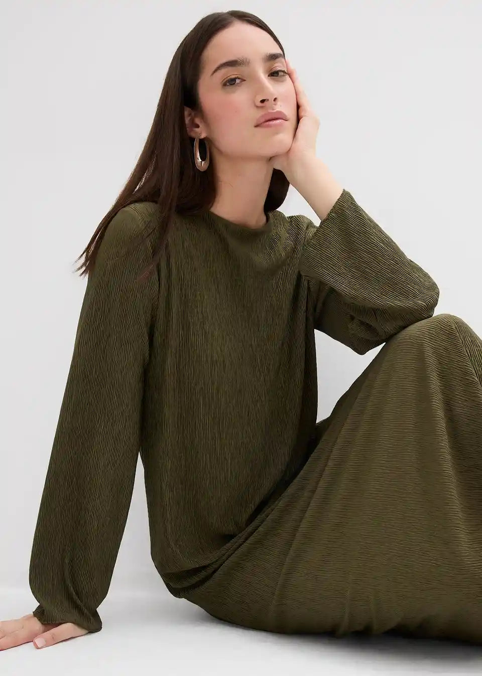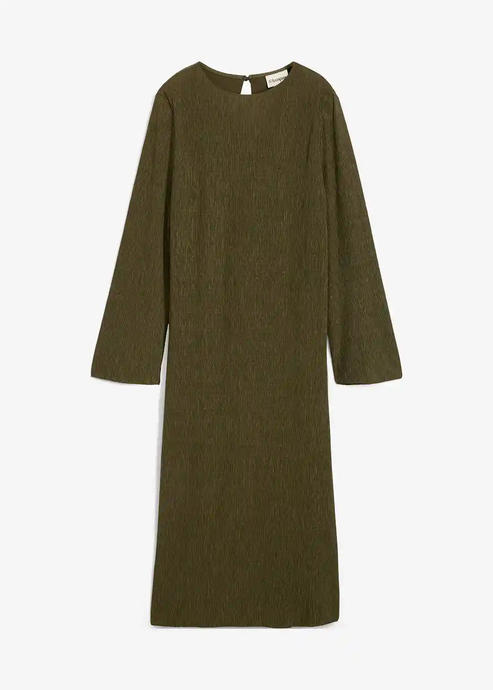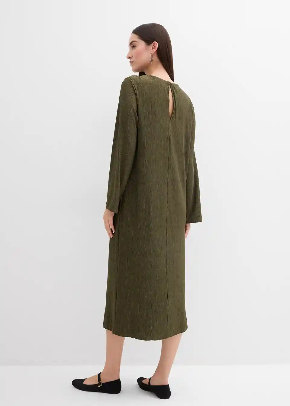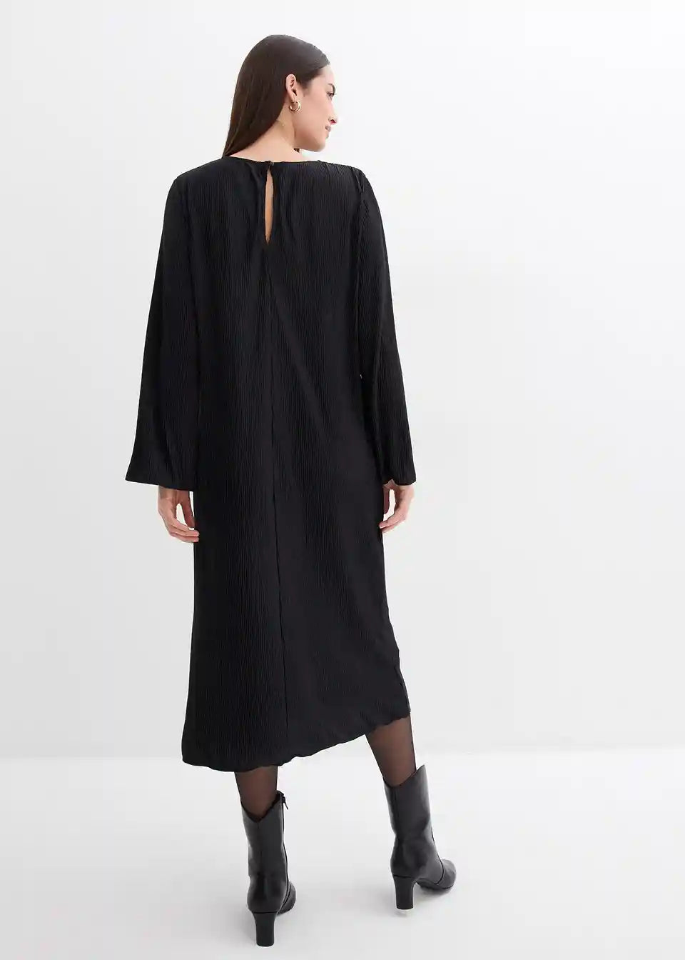 Ravno krojena obleka z dolgimi rokavi in odprtino v obliki kapljice za zapenjanje zadaj iz mečkanke