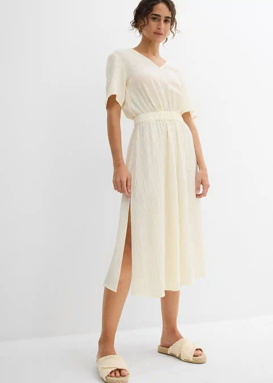 Obleka z razporki na obeh straneh in V-izrezom