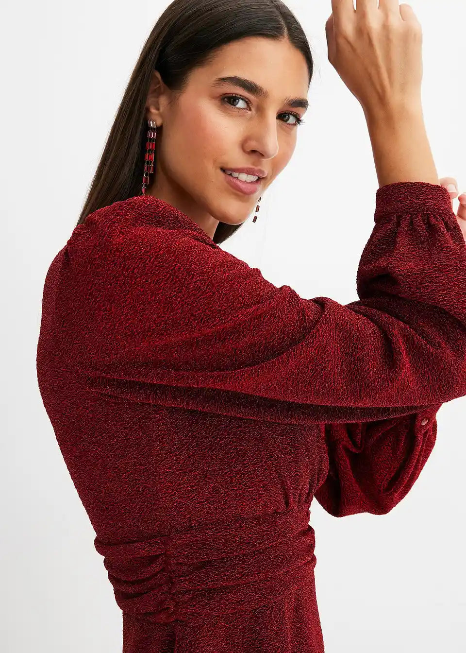 Moderno in ženstveno: Razširjena mini obleka iz bleščečega materiala z ovijalnim videzom, balon rokavi in poudarkom v pasu