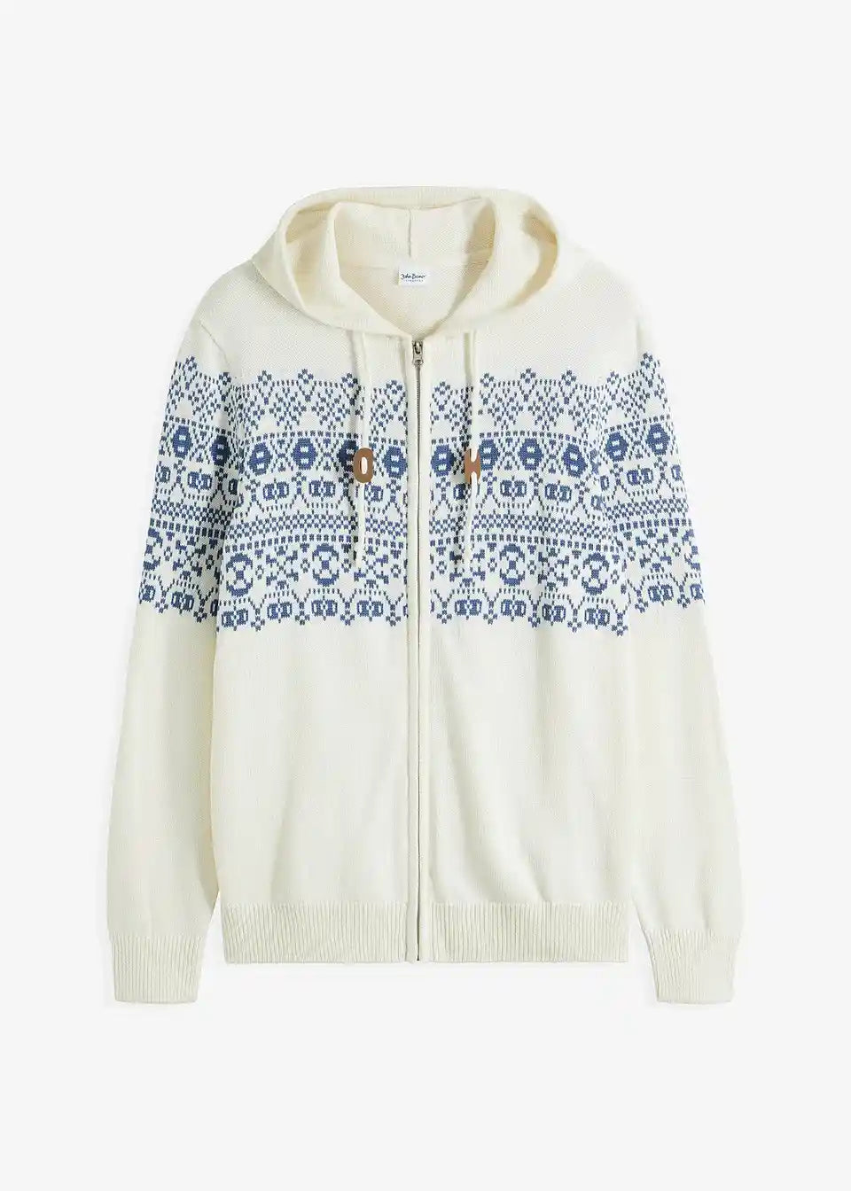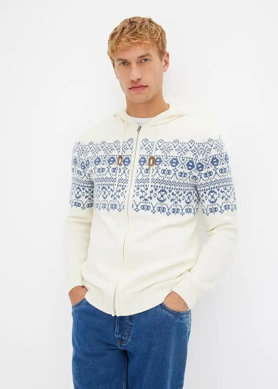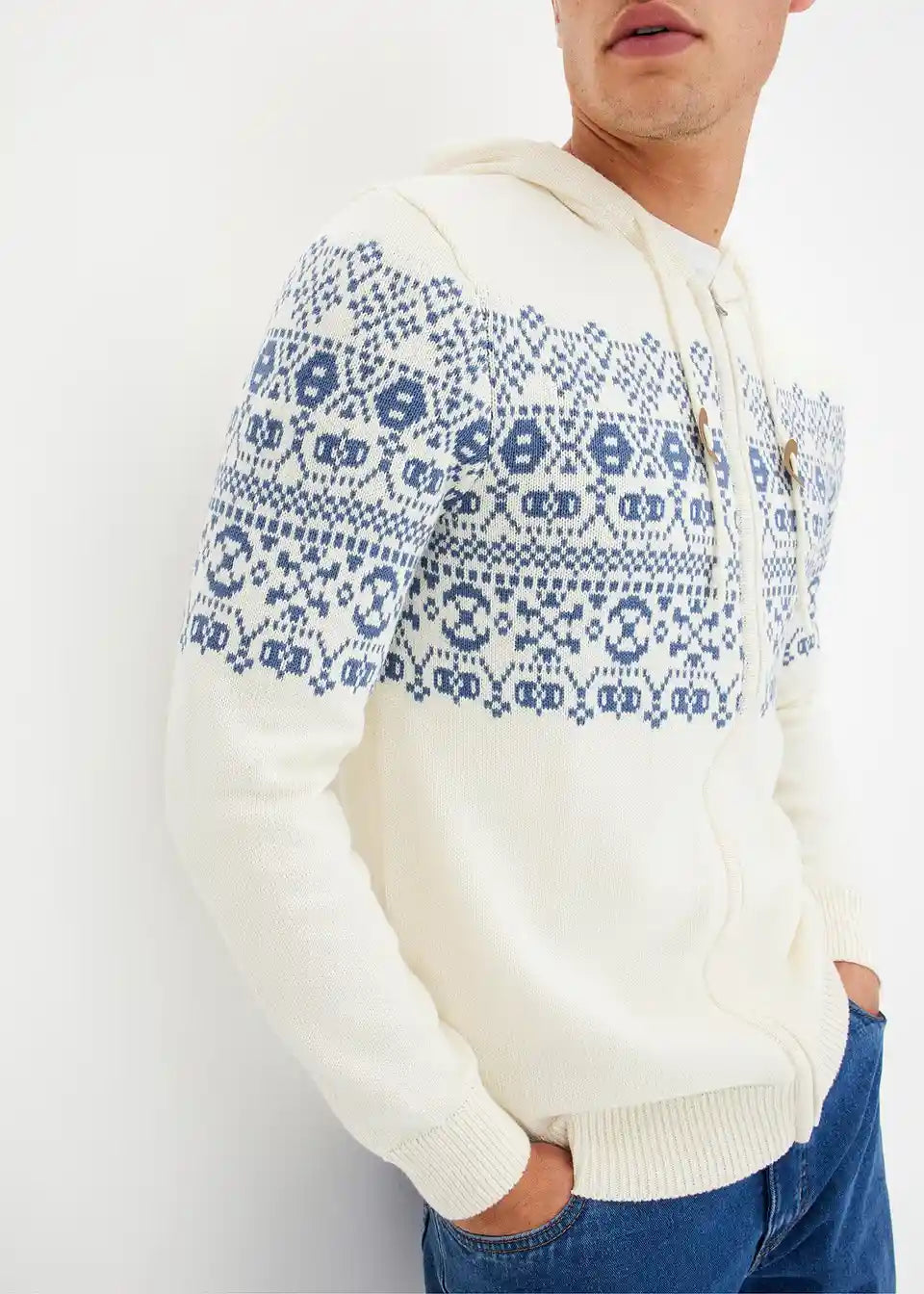 Norveška pletena jopa s kapuco v udobnem kroju z bombažem