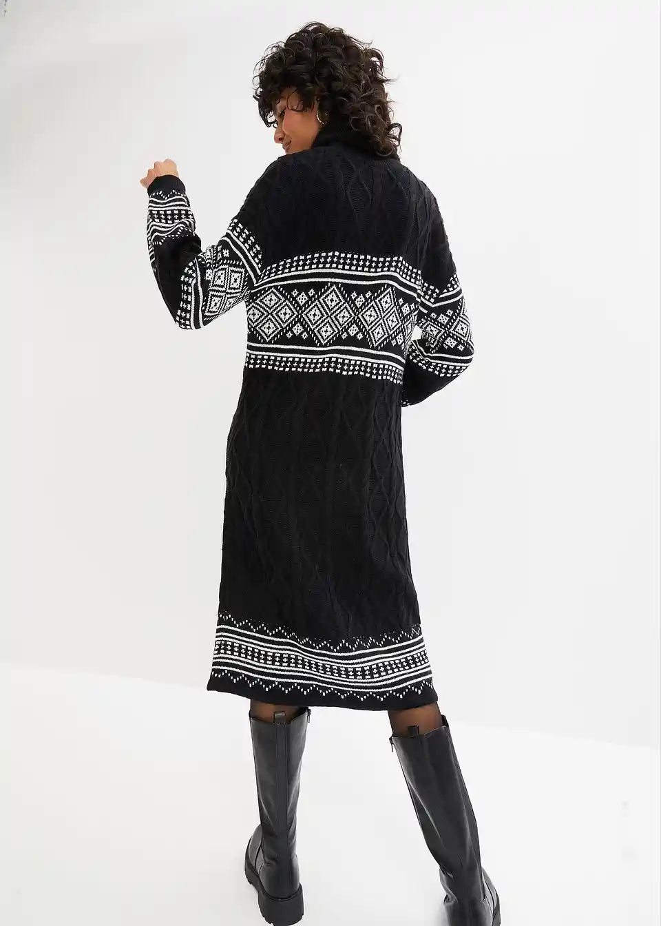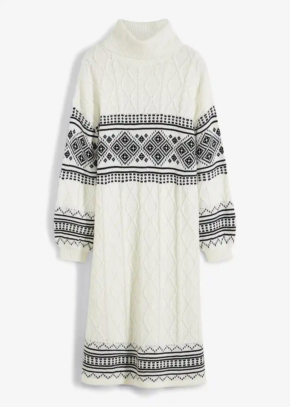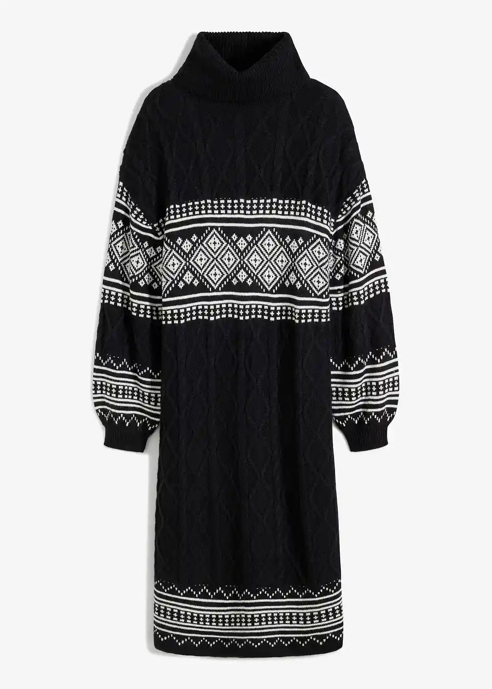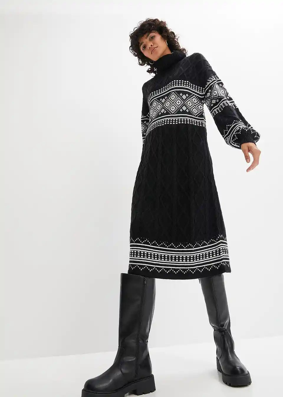 Pletena obleka z norveškim vzorcem in balonastimi rokavi