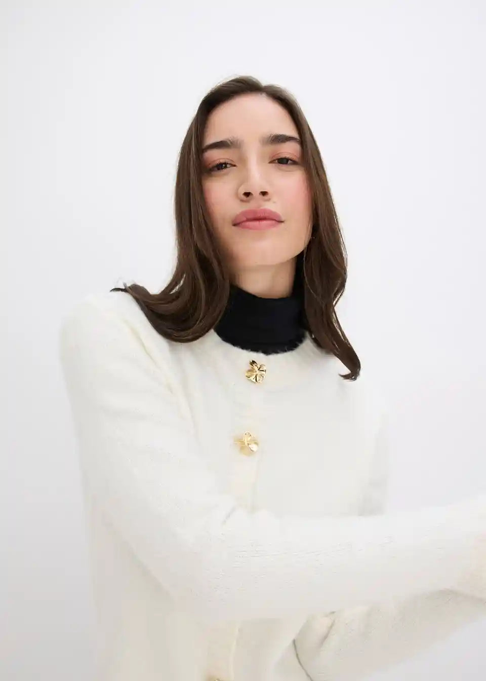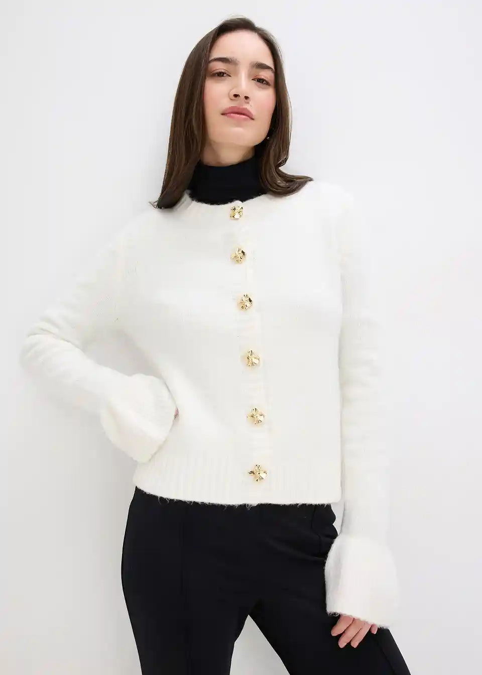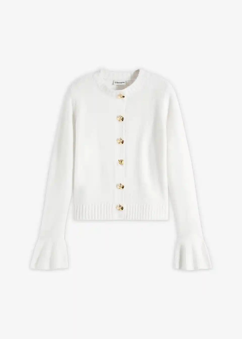Ženstvena pletena jopa z okrasnimi gumbi in volani na robu rokavov