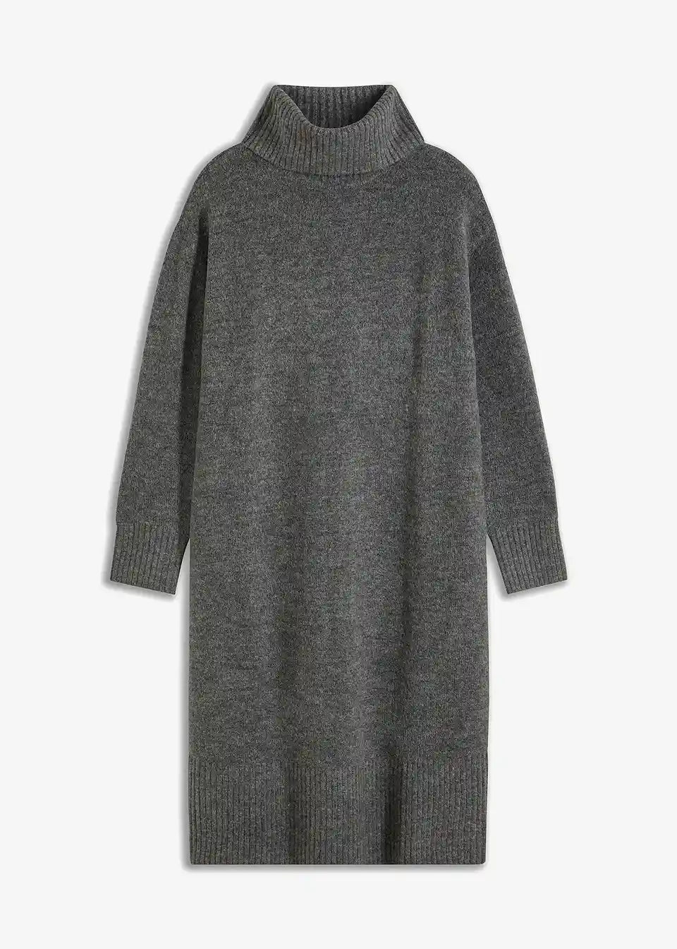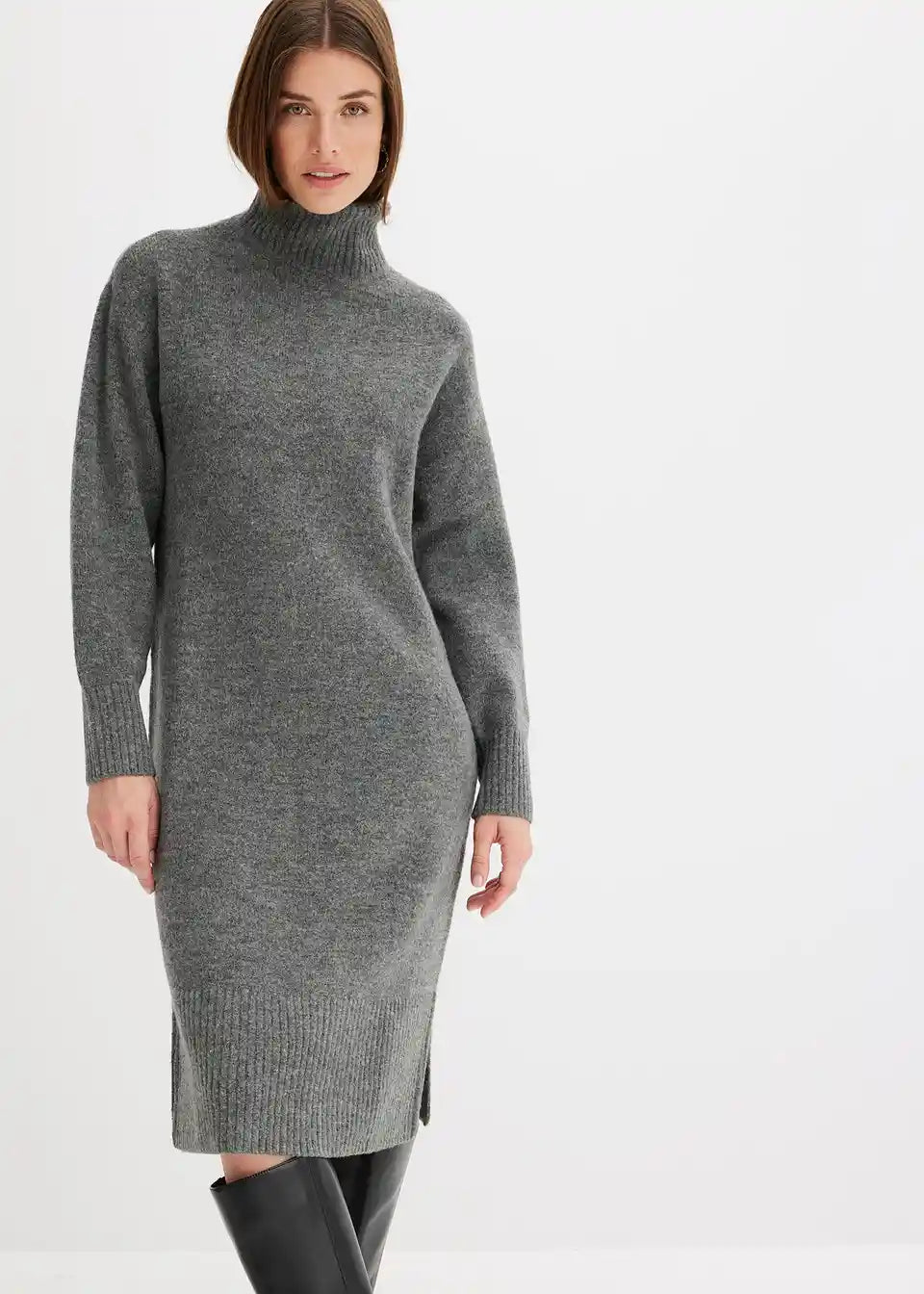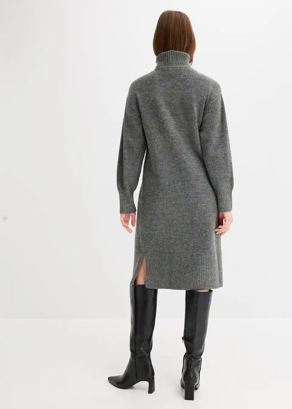 Lepa pletena obleka v midi dolžini s pokončnim ovratnikom in razporkom