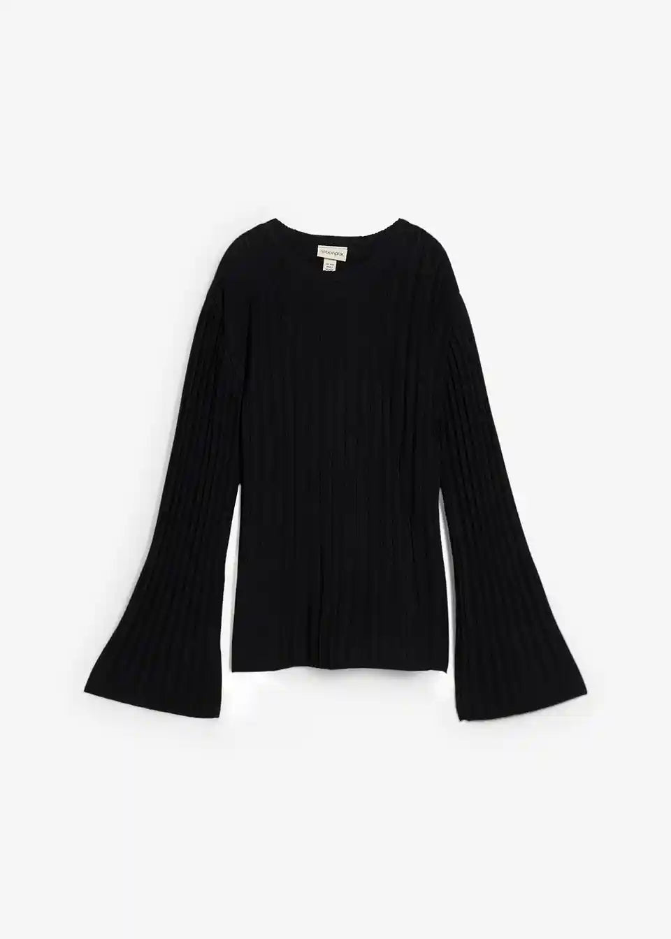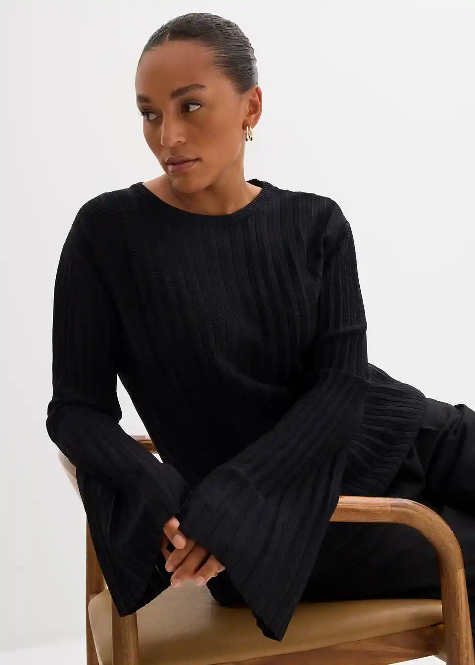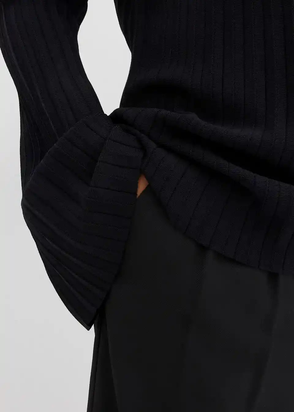 Plisiran fino pleten pulover z okroglim izrezom in trobentastimi rokavi