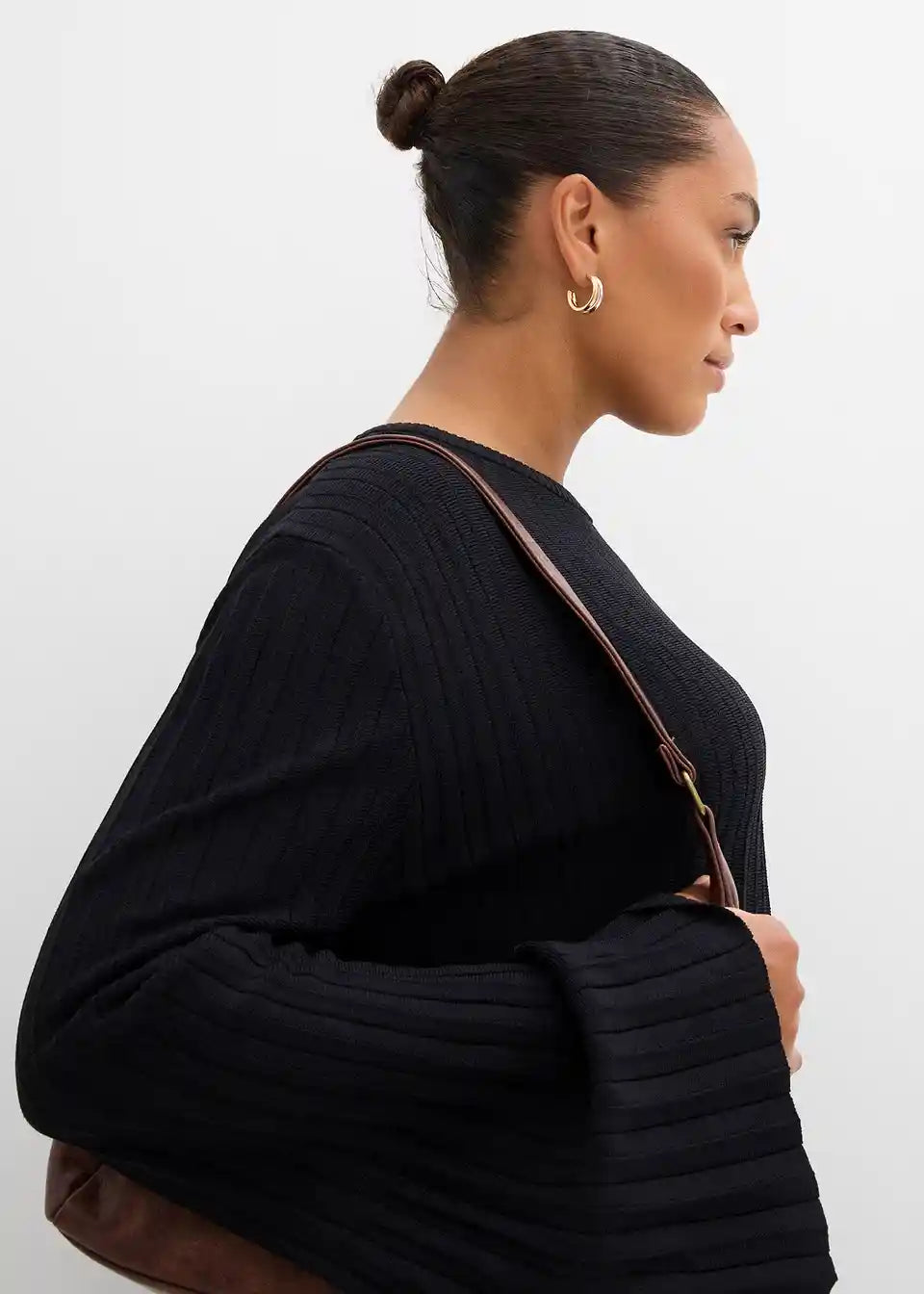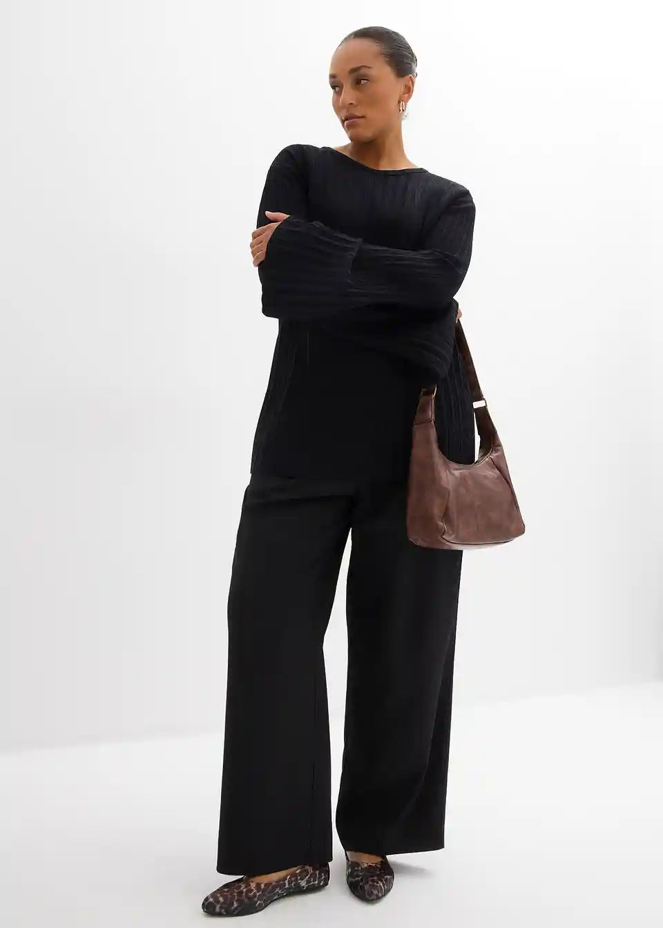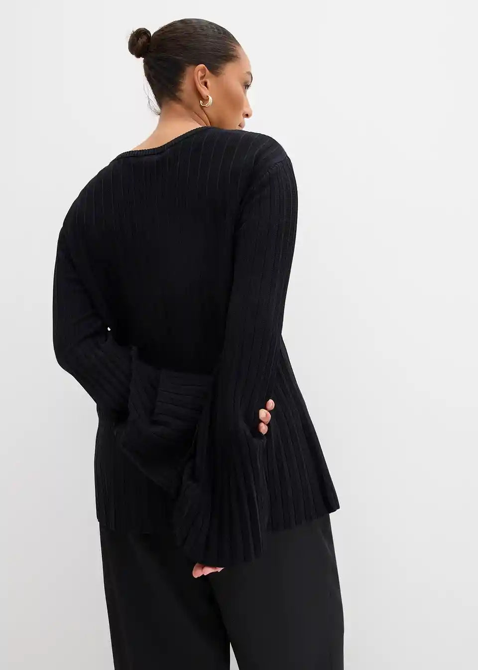 Plisiran fino pleten pulover z okroglim izrezom in trobentastimi rokavi