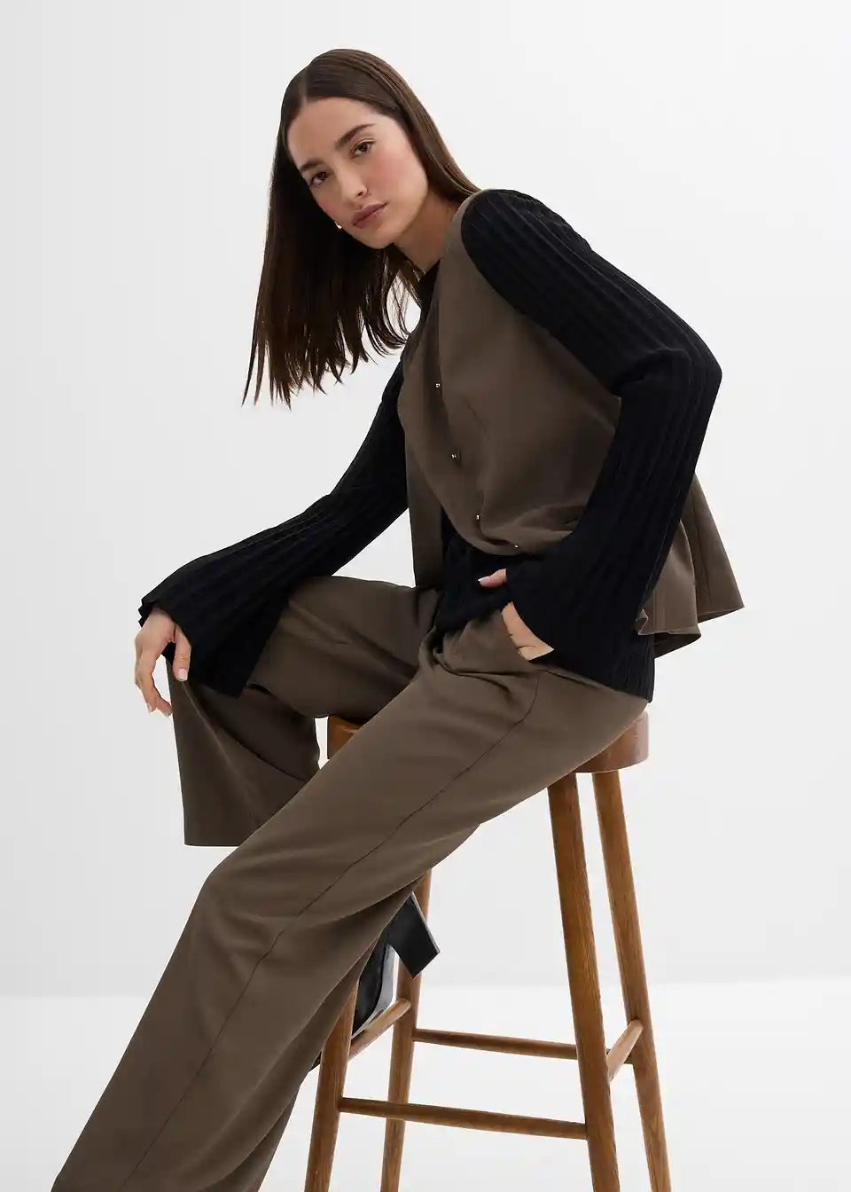 Plisiran fino pleten pulover z okroglim izrezom in trobentastimi rokavi