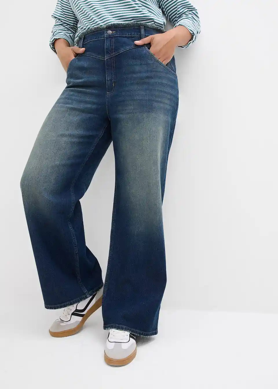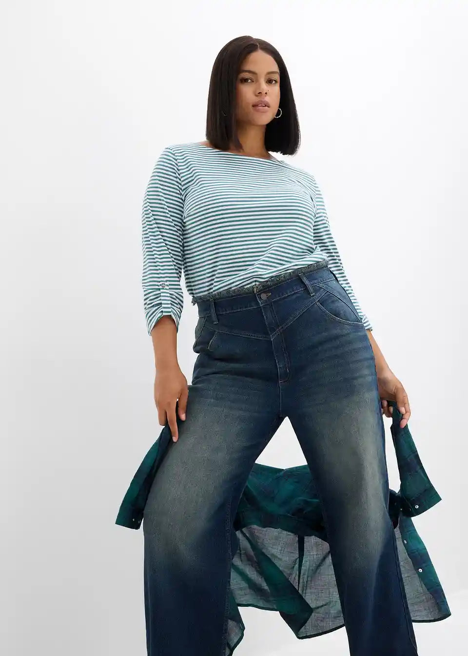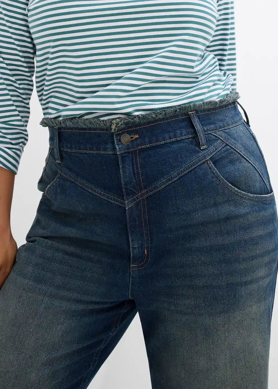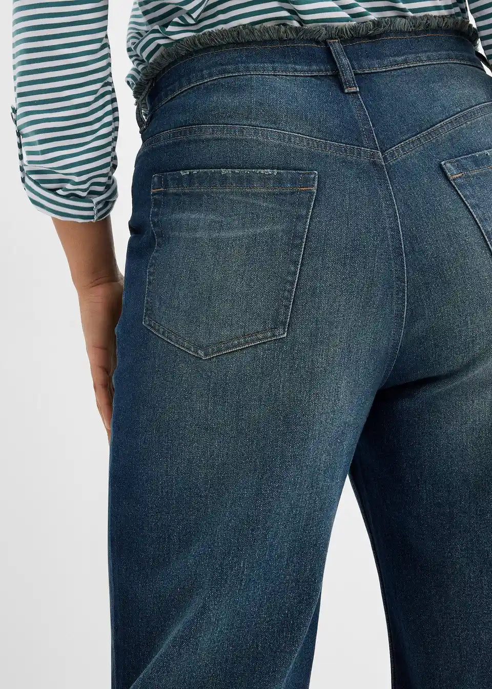 Ravne 5-žepne kavbojke iz trpežnega bombažnega denima, ki je sprva nekoliko tog in s pogostim nošenjem postane mehkejši in bolj sproščen. Visok pas z zapiranjem na zadrgo in gumb. Dolga dolžina, tako da nastane rahlo nabiranje pri stopalu. Te kavbojke imajo zaradi spranega videza sodoben efekt uporabljenega videza. Značilno je rahlo puščanje barve med nošenjem in pranjem. Notranja dolžina hlačnice pri št. 42 ca. 78,5 cm, strojno pralno.