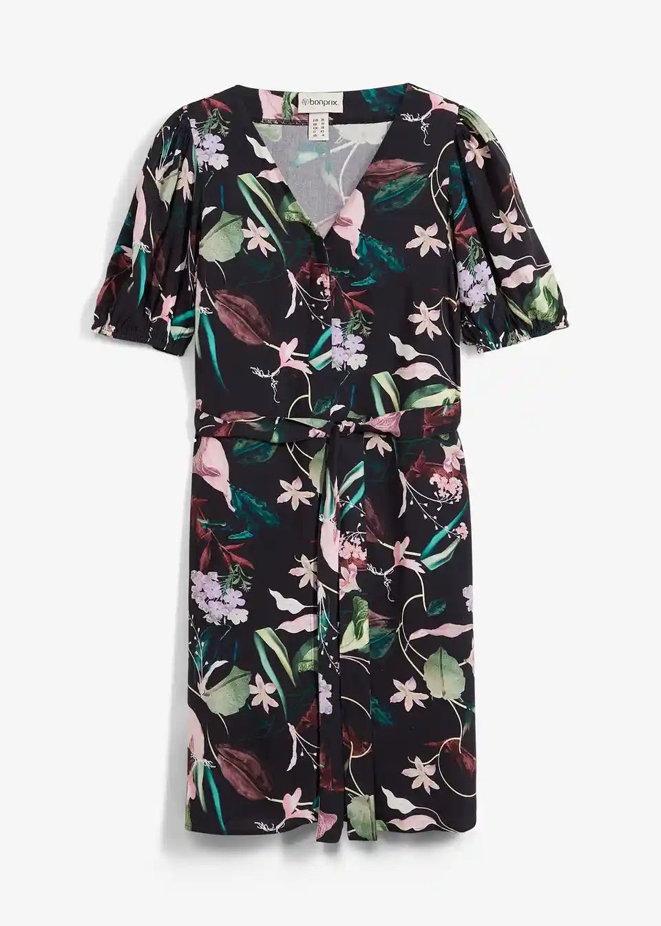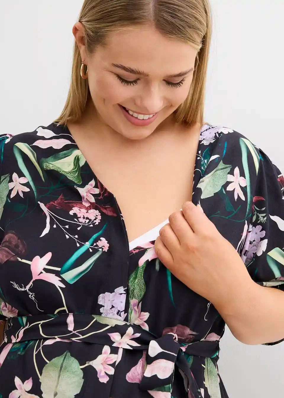 Padajoča tkana obleka z V-izrezom in skrito, neprekinjeno gumbno letvijo, ki omogoča udobno dojenje ter enostavno oblačenje in slačenje. Snemljiv zavezovalni pas pod prsmi omogoča prilagodljivo prileganje, lahki balonasti rokavi pa obleki dodajo moderen pridih.