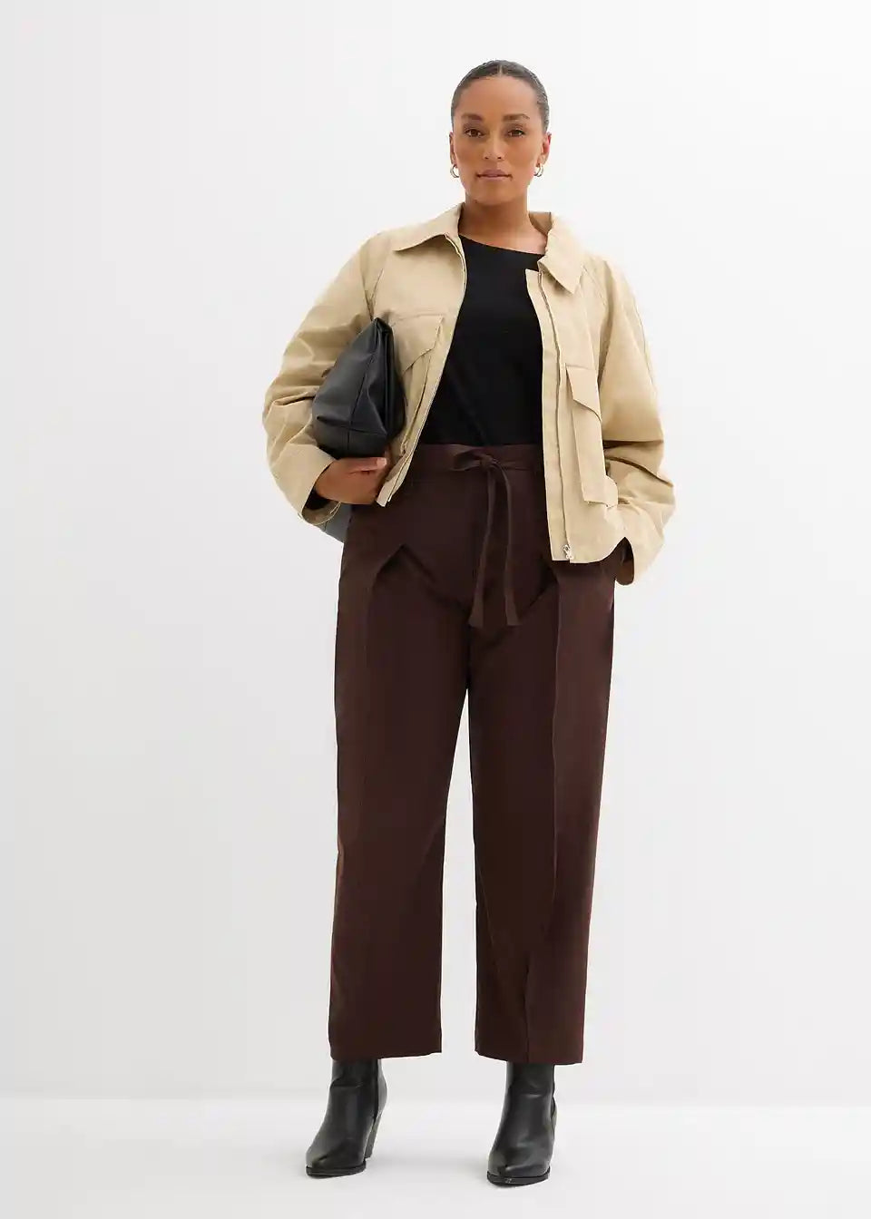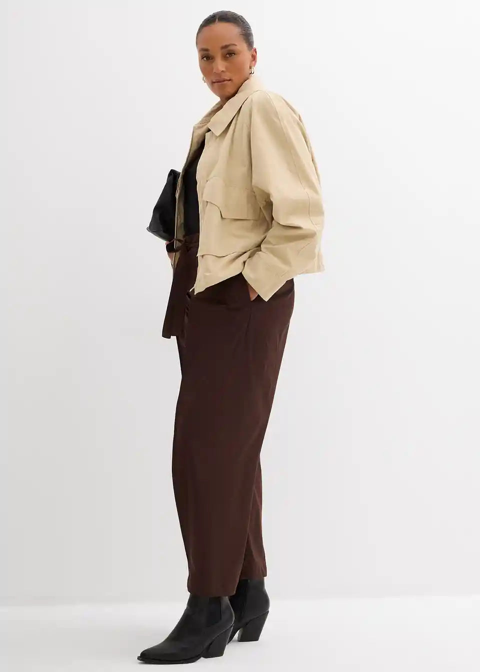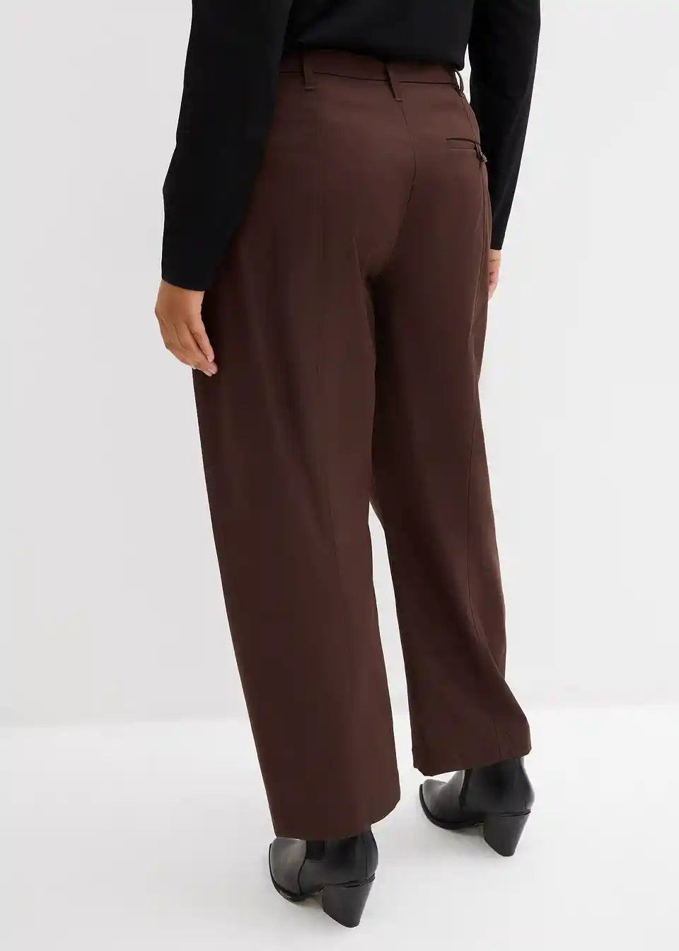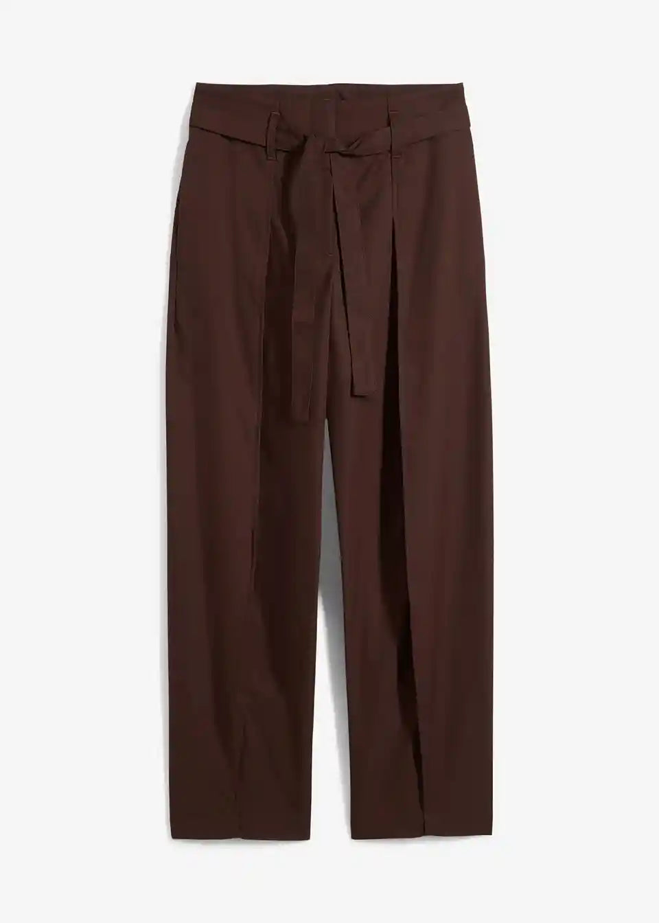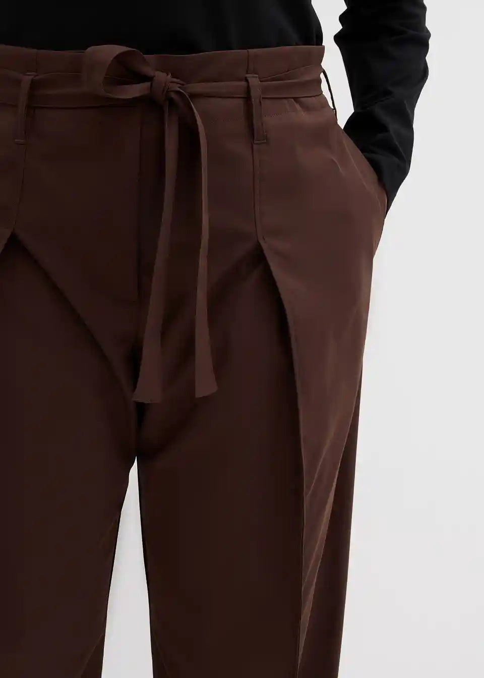 Ravno krojene hlače z gubami spredaj, z barvno usklajenim pasom v pasu ter s kljukico, prepono in zadrgo