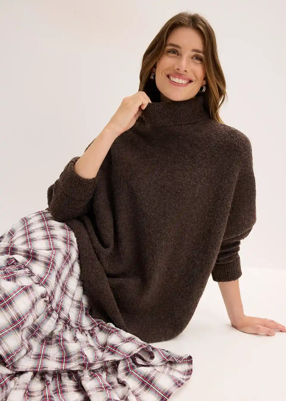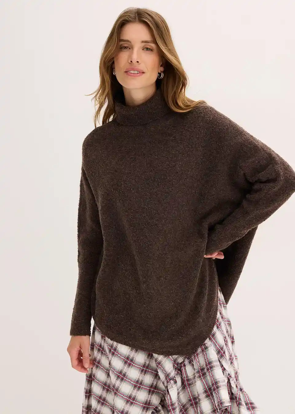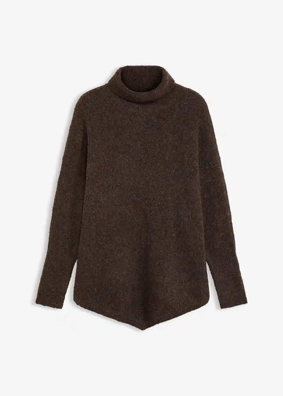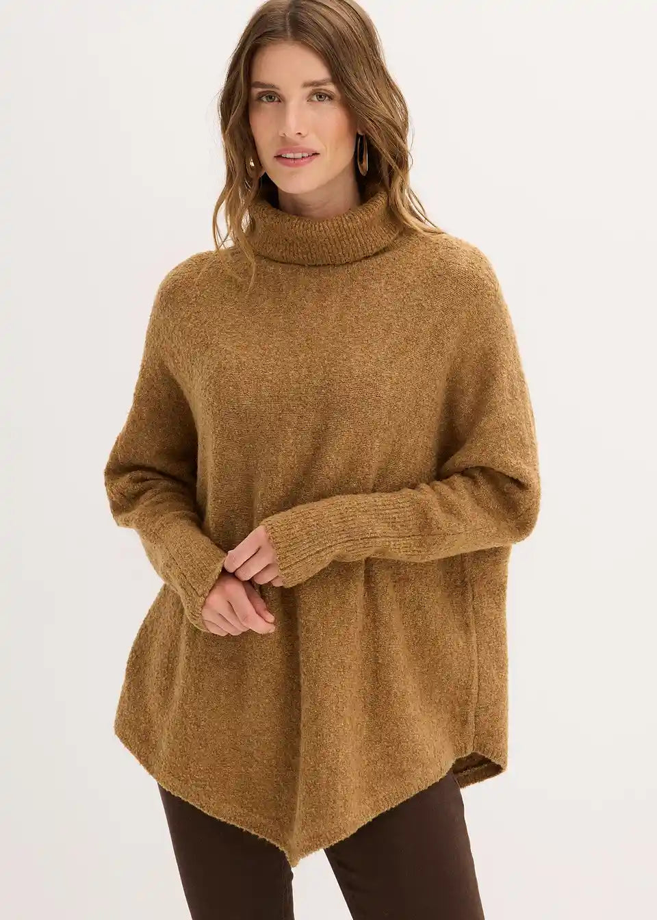 Široko krojen pončo-pulover z asimetričnim spodnjim robom in pokončnim ovratnikom