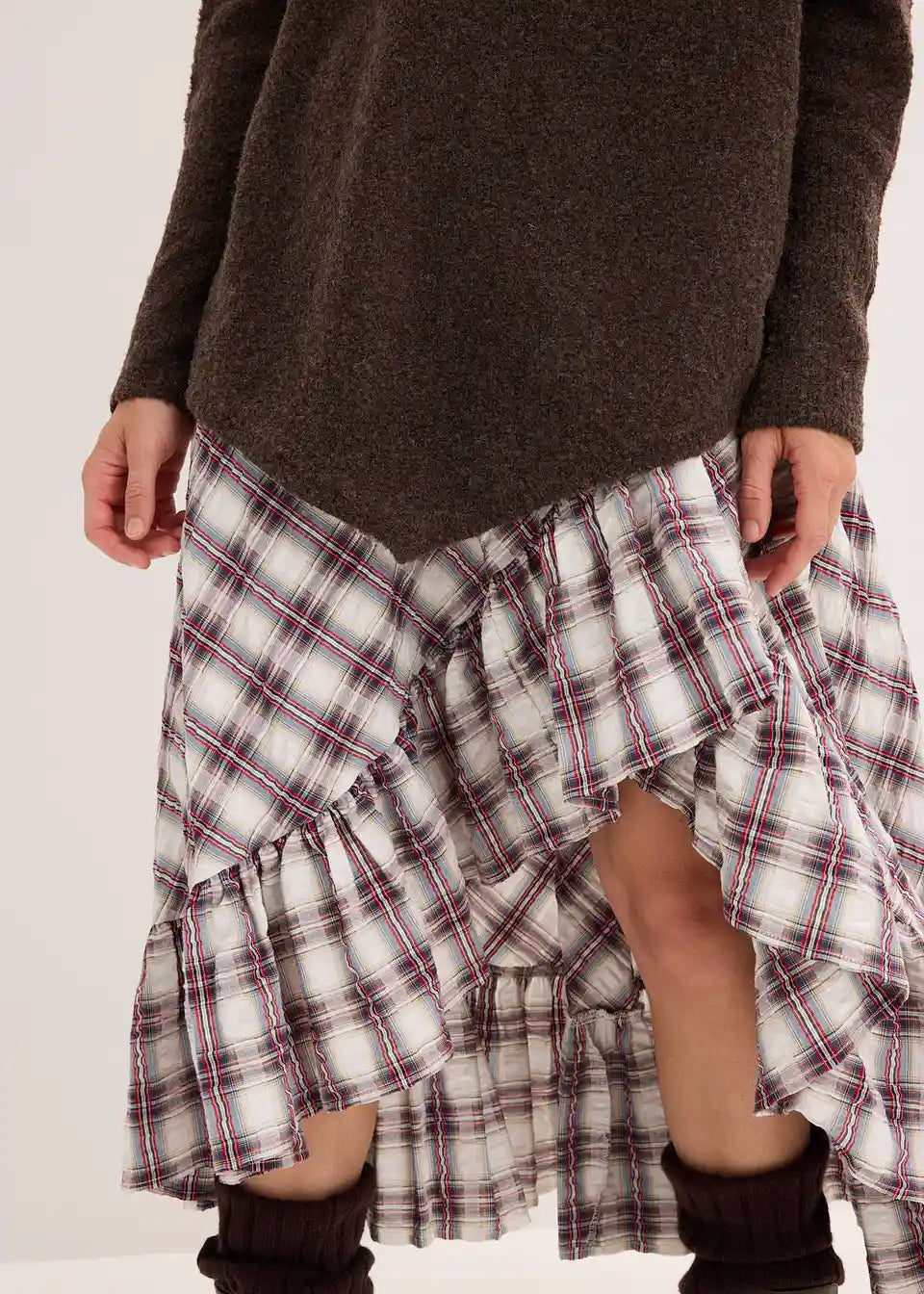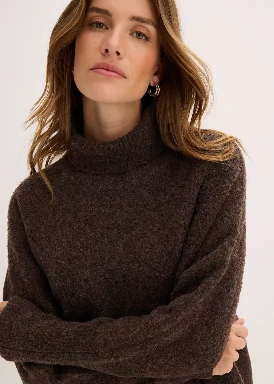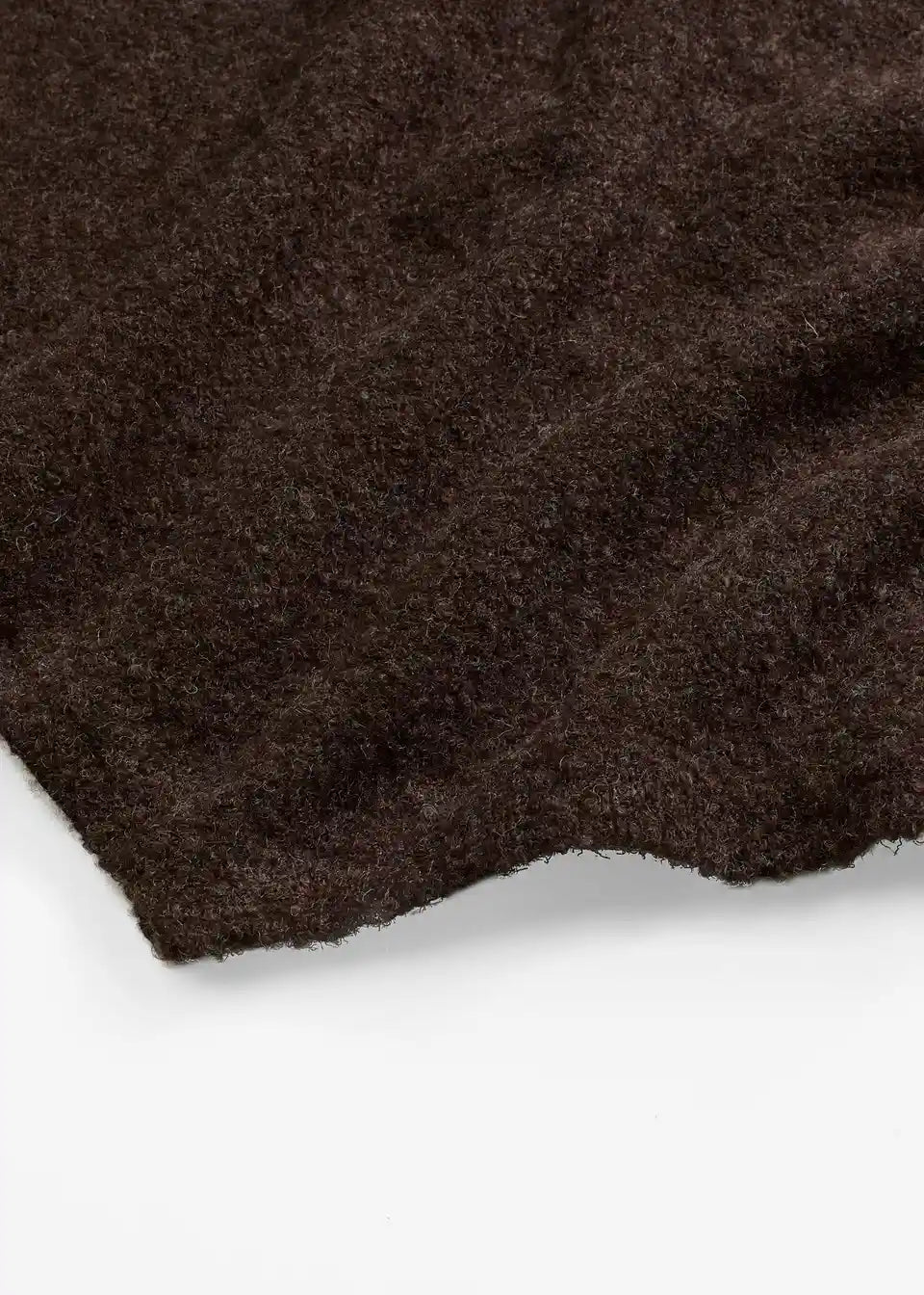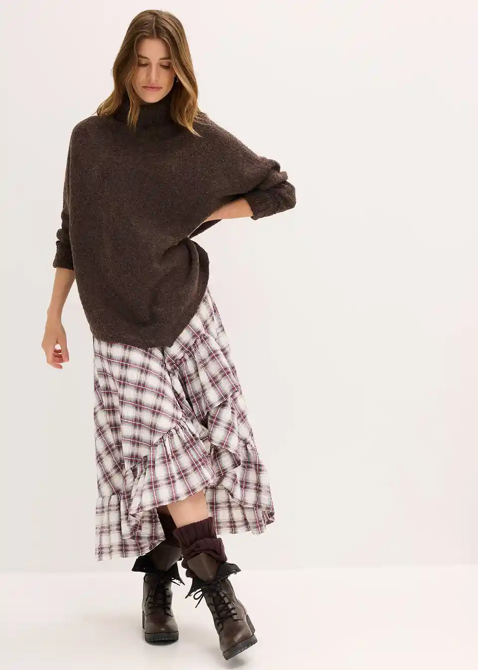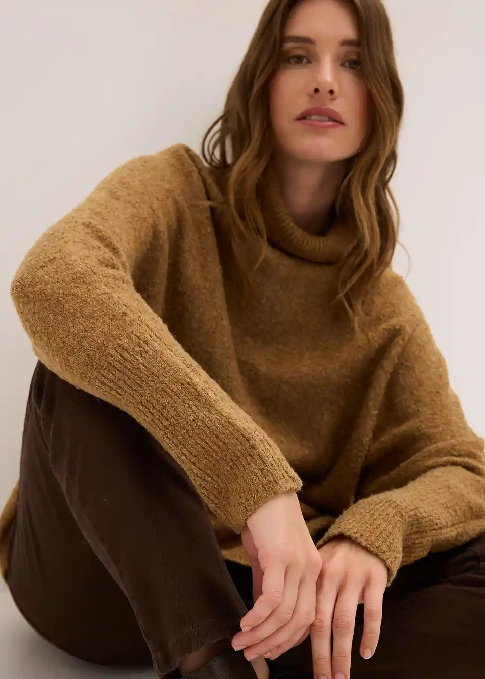 Široko krojen pončo-pulover z asimetričnim spodnjim robom in pokončnim ovratnikom