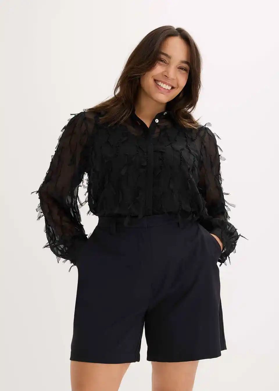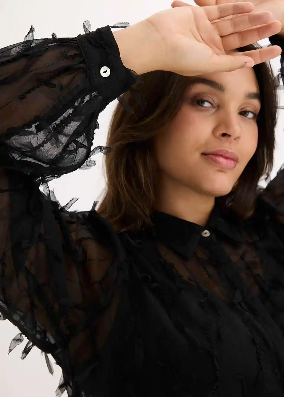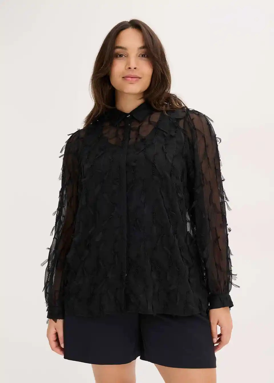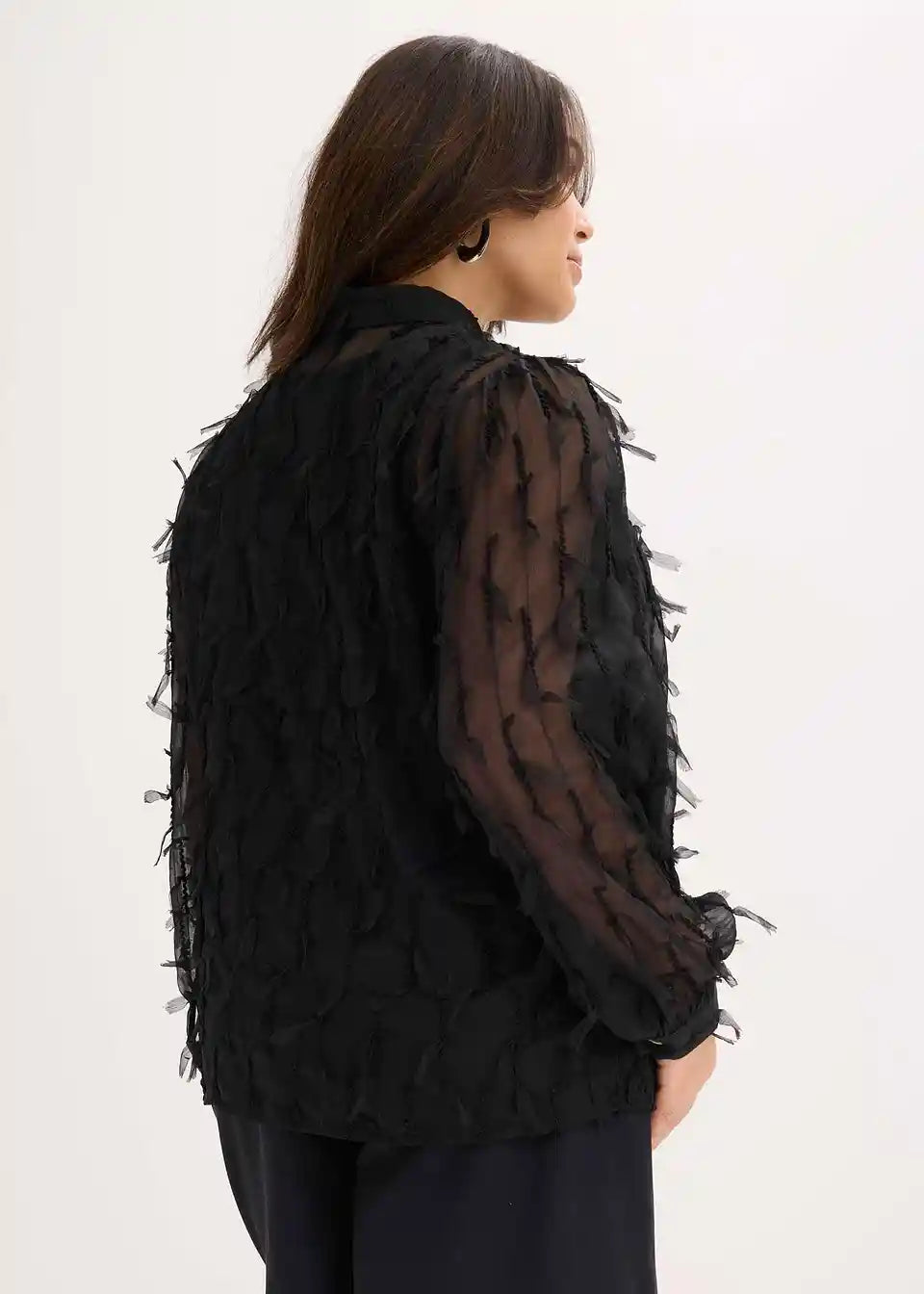 Rahlo prosojna modna bluza iz strukturiranega materiala z našitkom iz res.