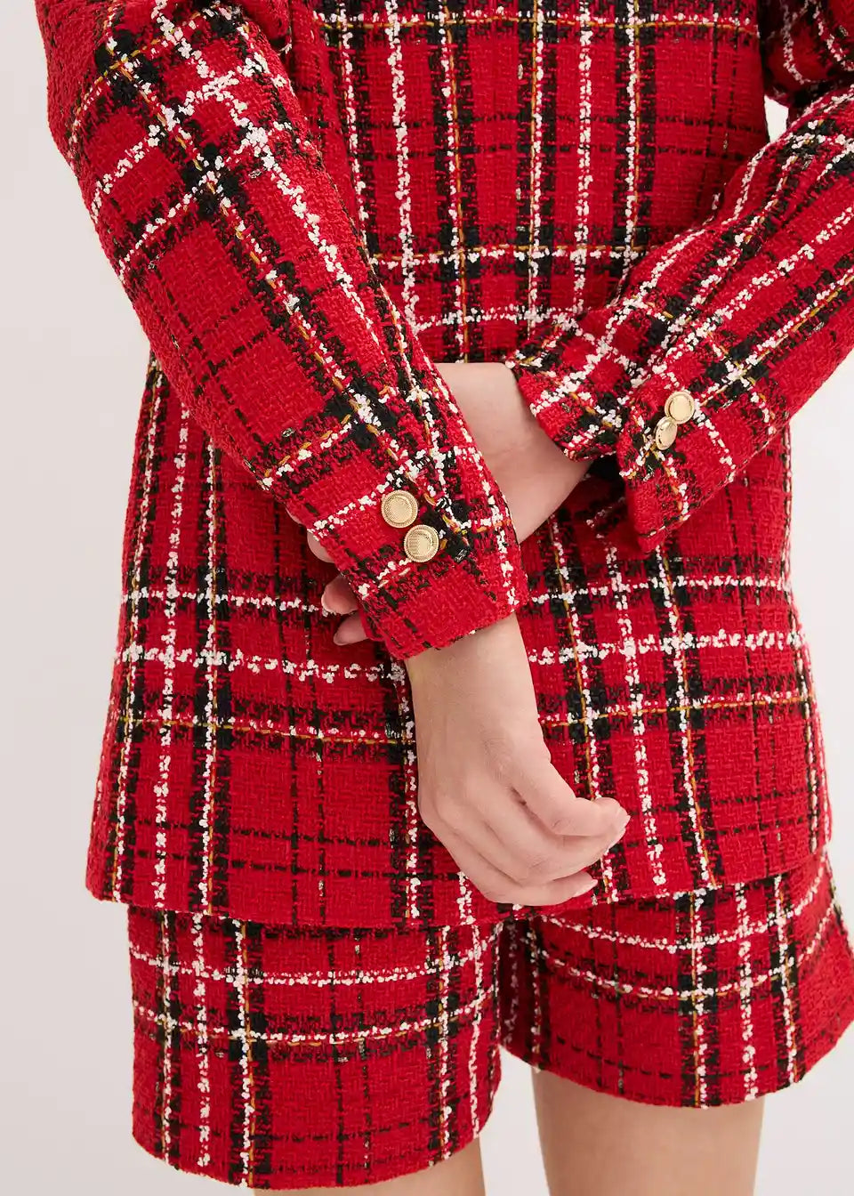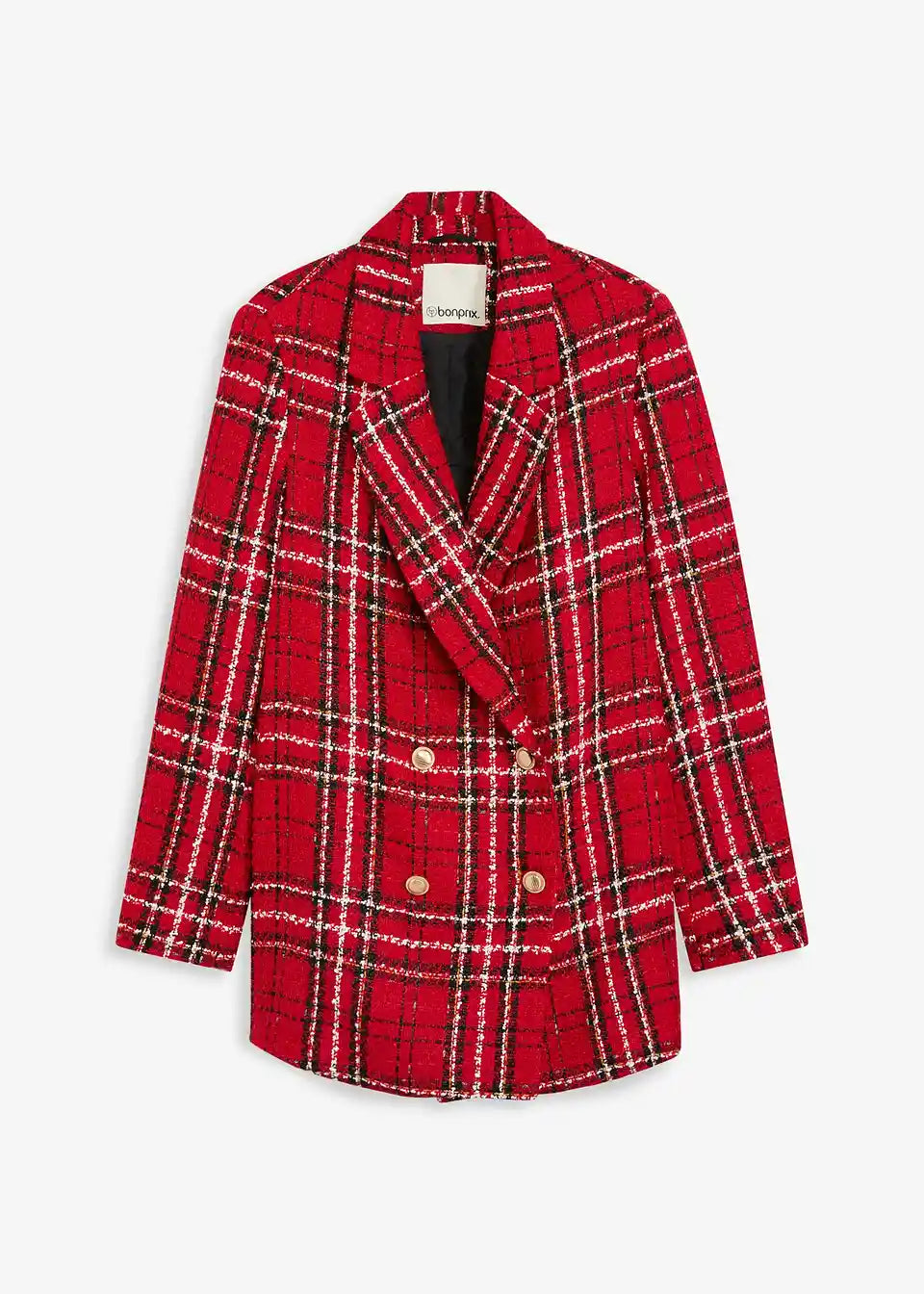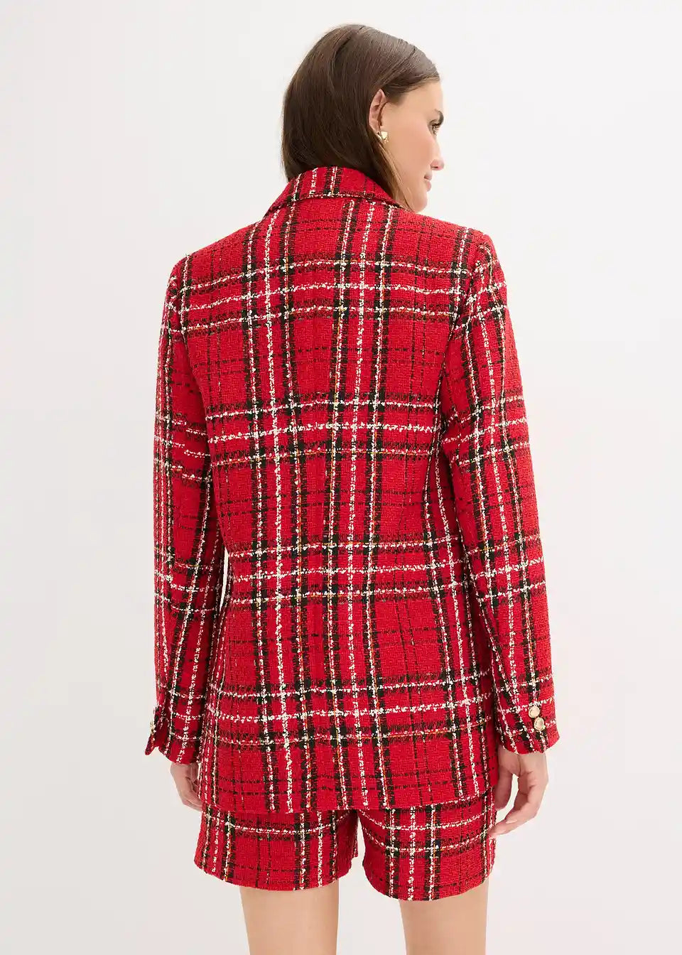 Moden dolg blazer iz bukleja z okrasnimi gumbi