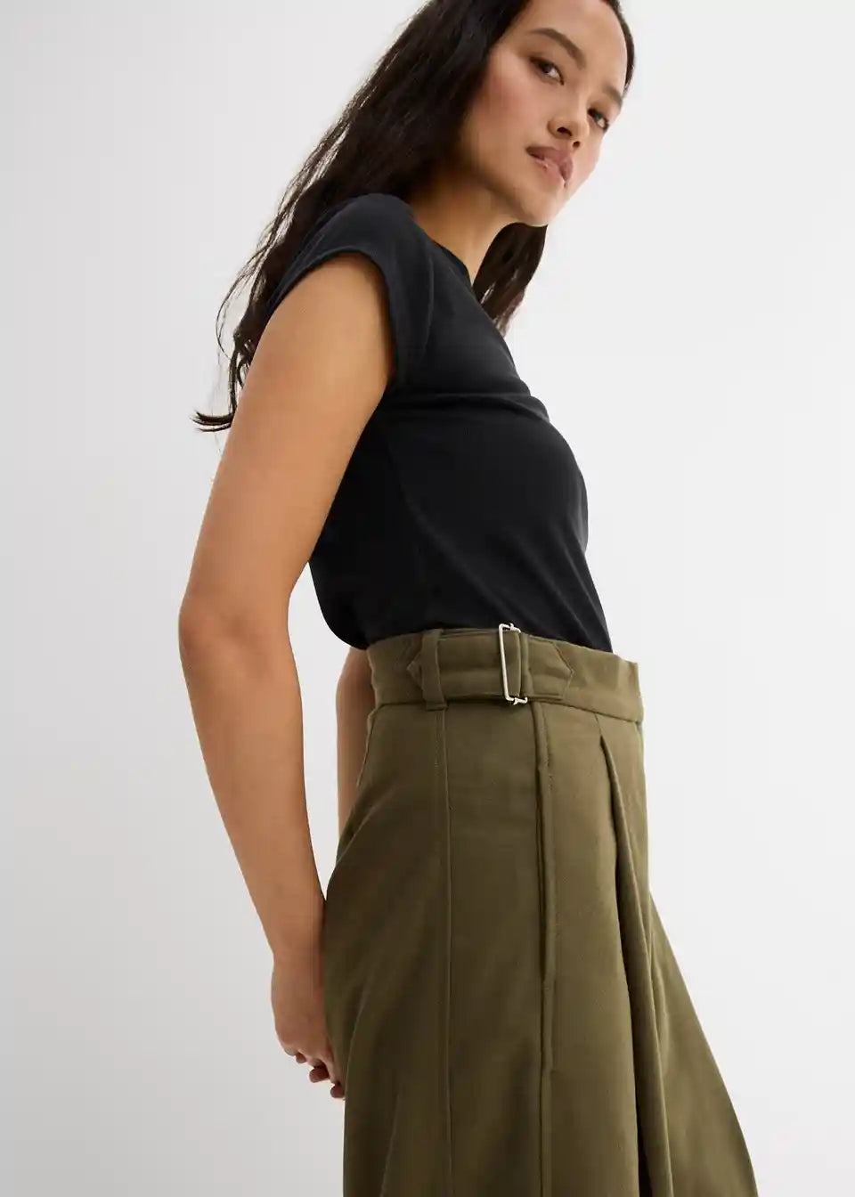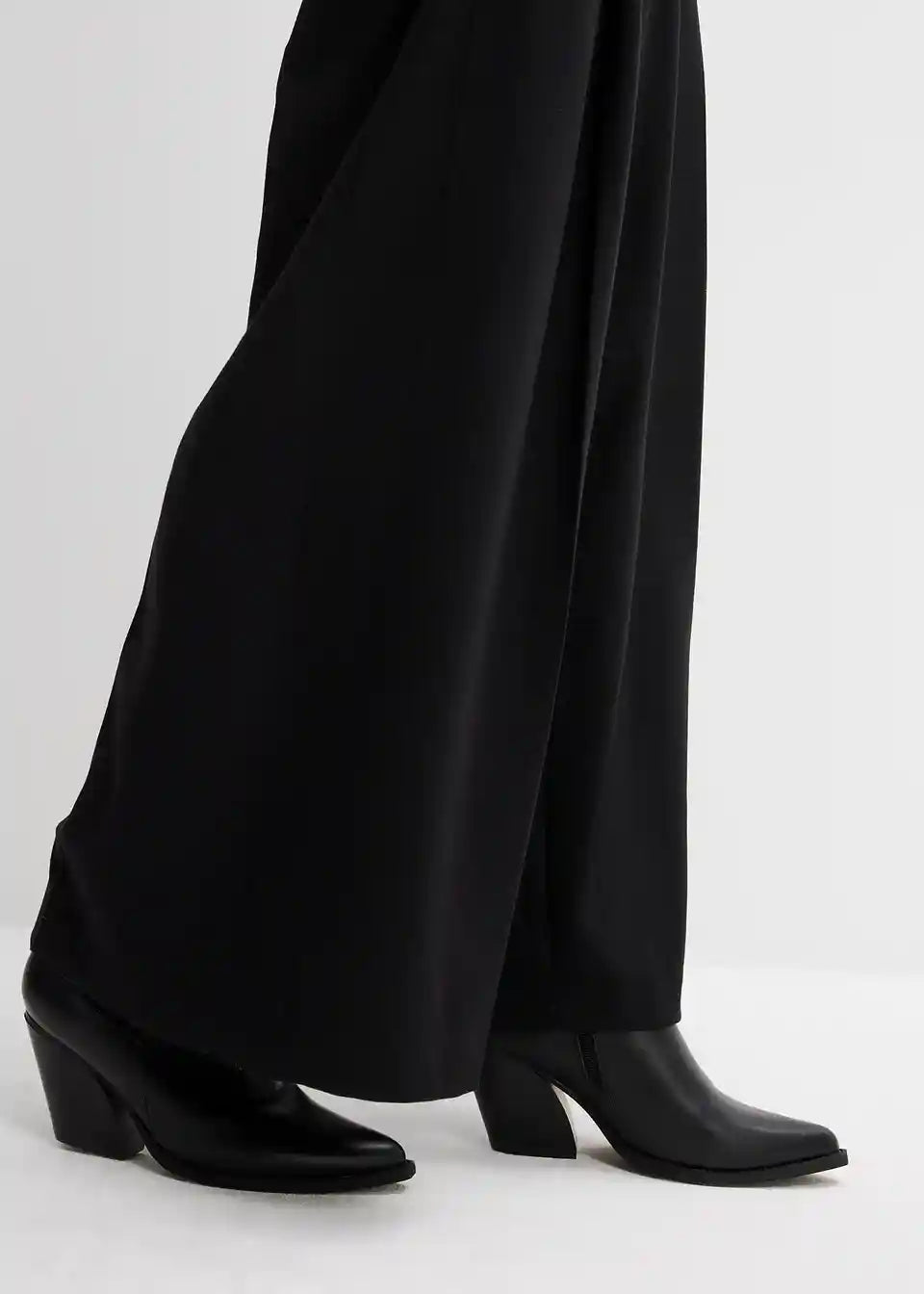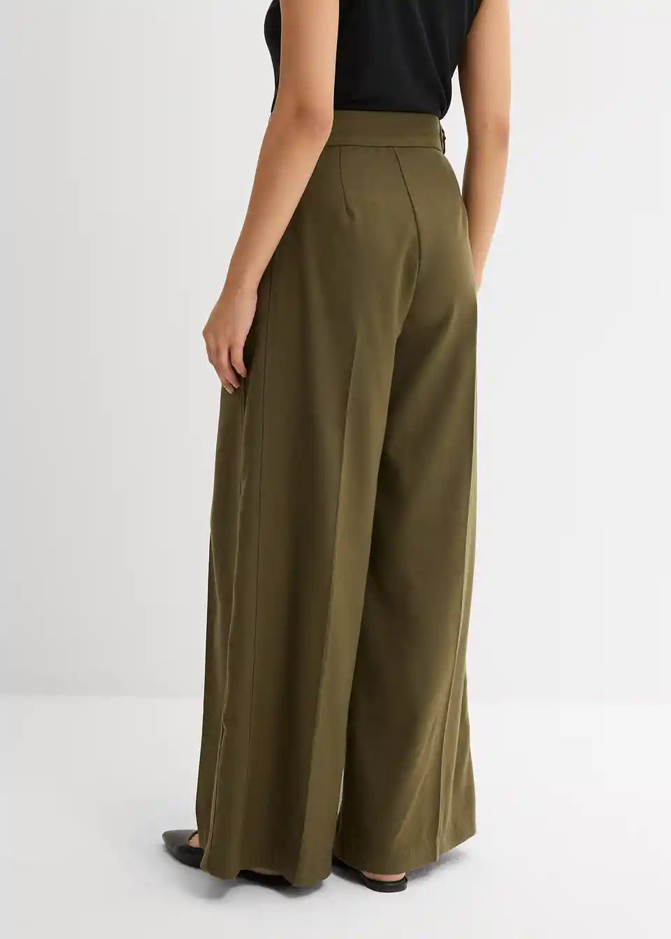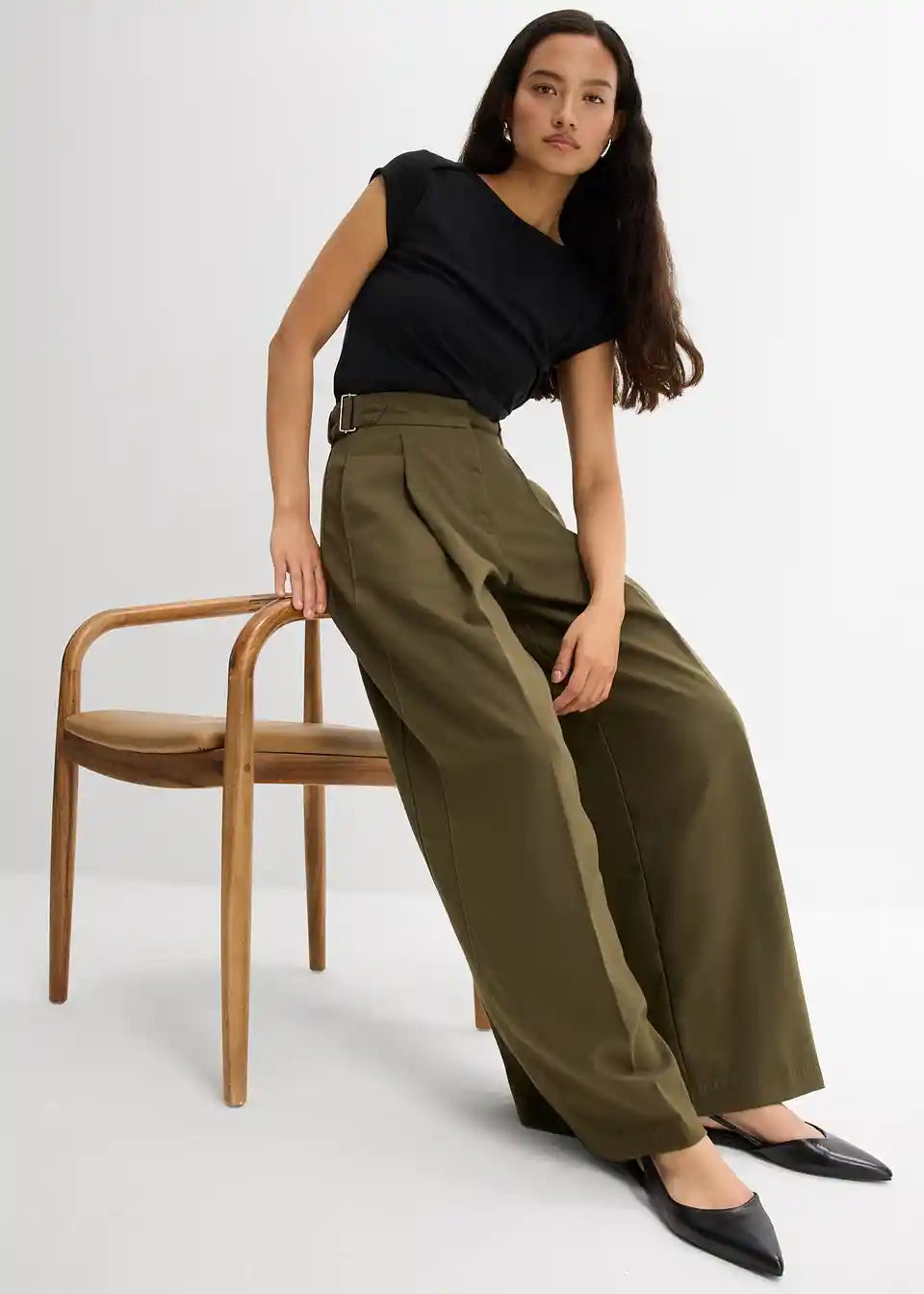 Ohlapno krojene hlače z gubami v pasu in zalikano črto spredaj in zadaj. Z diskretnimi stranskimi žepi in nastavljivo prepono s kovinsko zaponko na obeh straneh pasu.