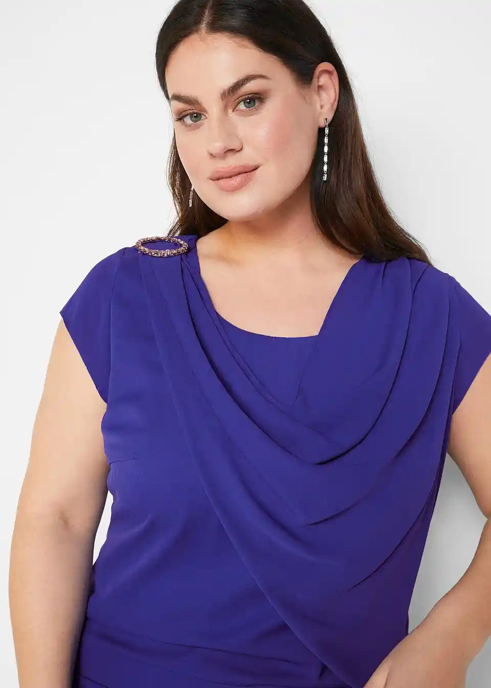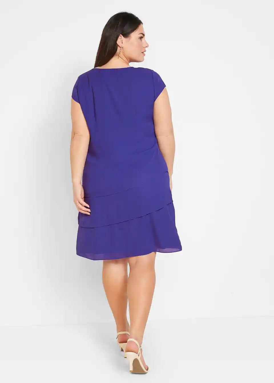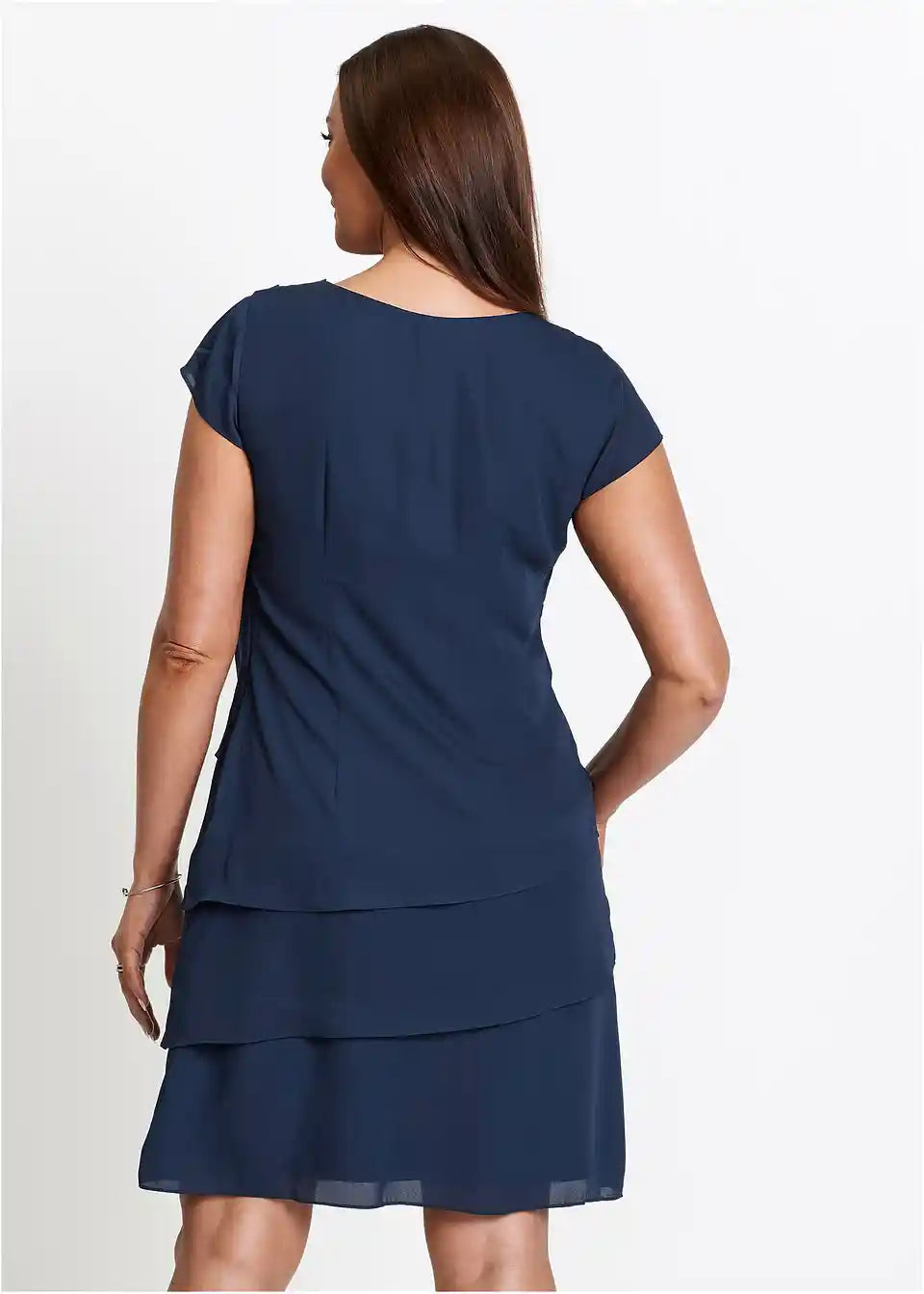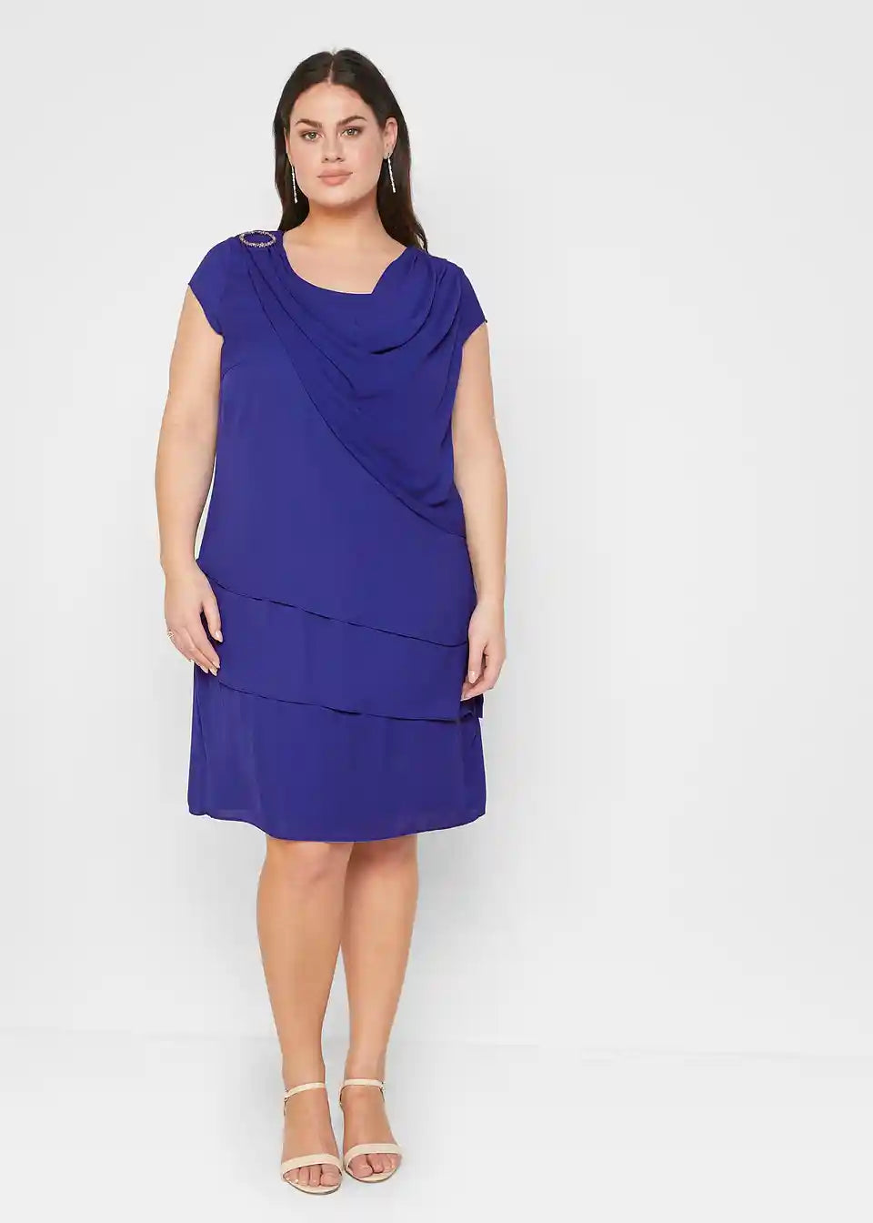 Sproščena, figuri prilagojena, z broško na desni rami, dolžina približno 98 cm (velikost 36) do približno 104 cm (velikost 54), primerna za pranje v pralnem stroju,