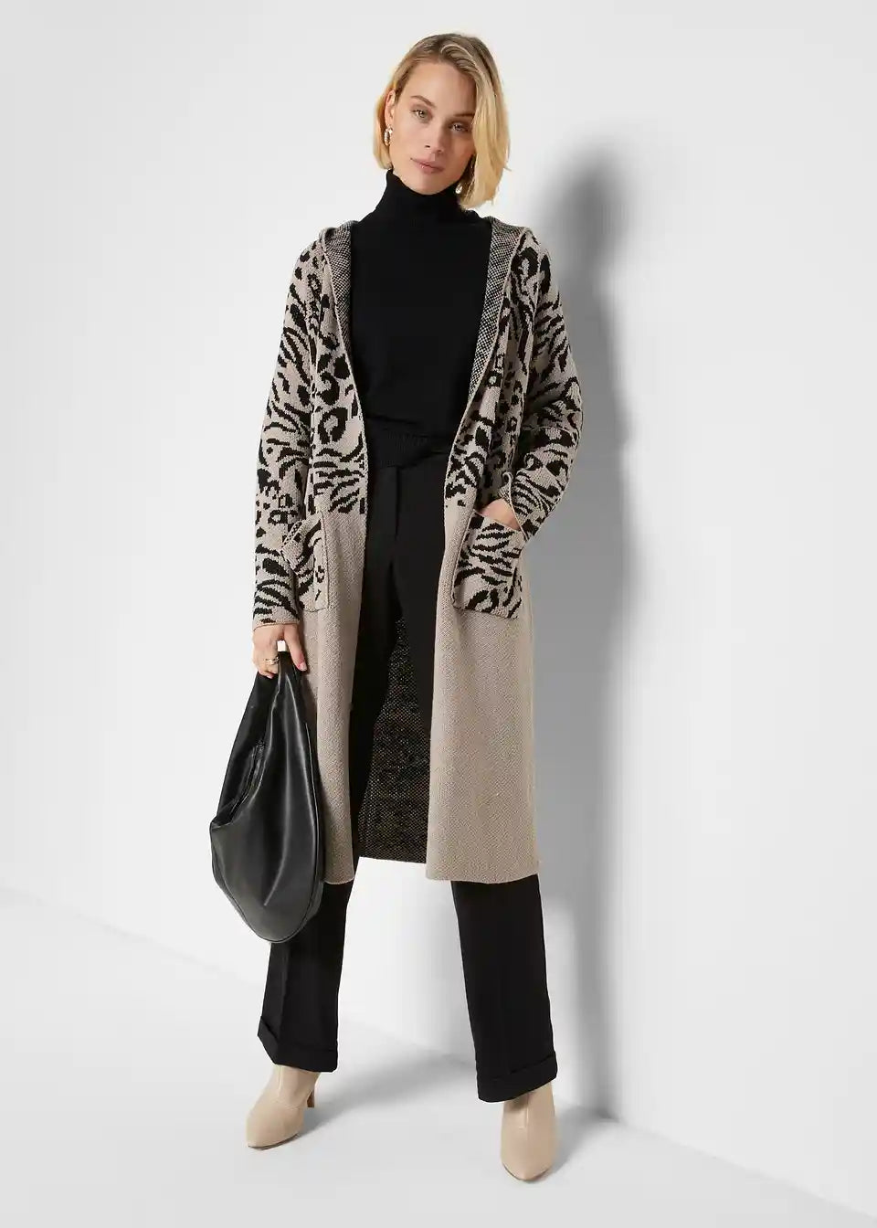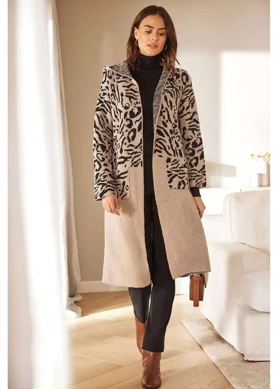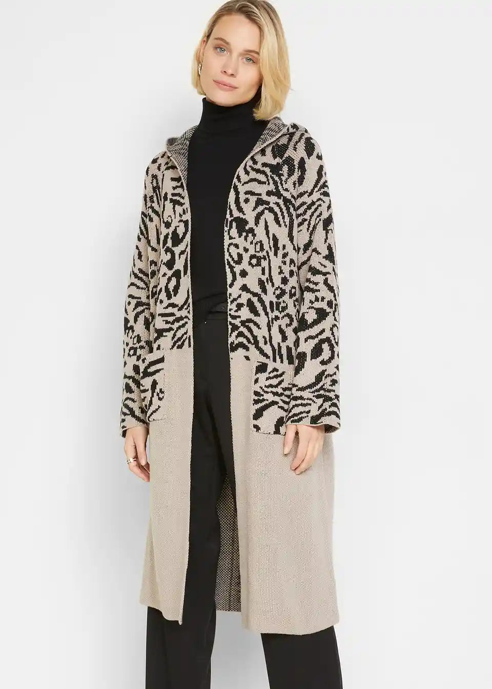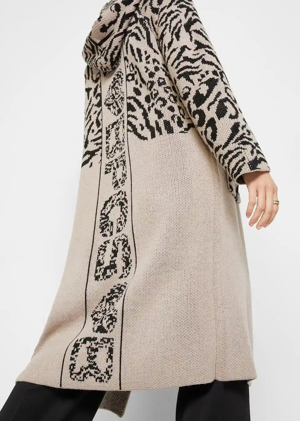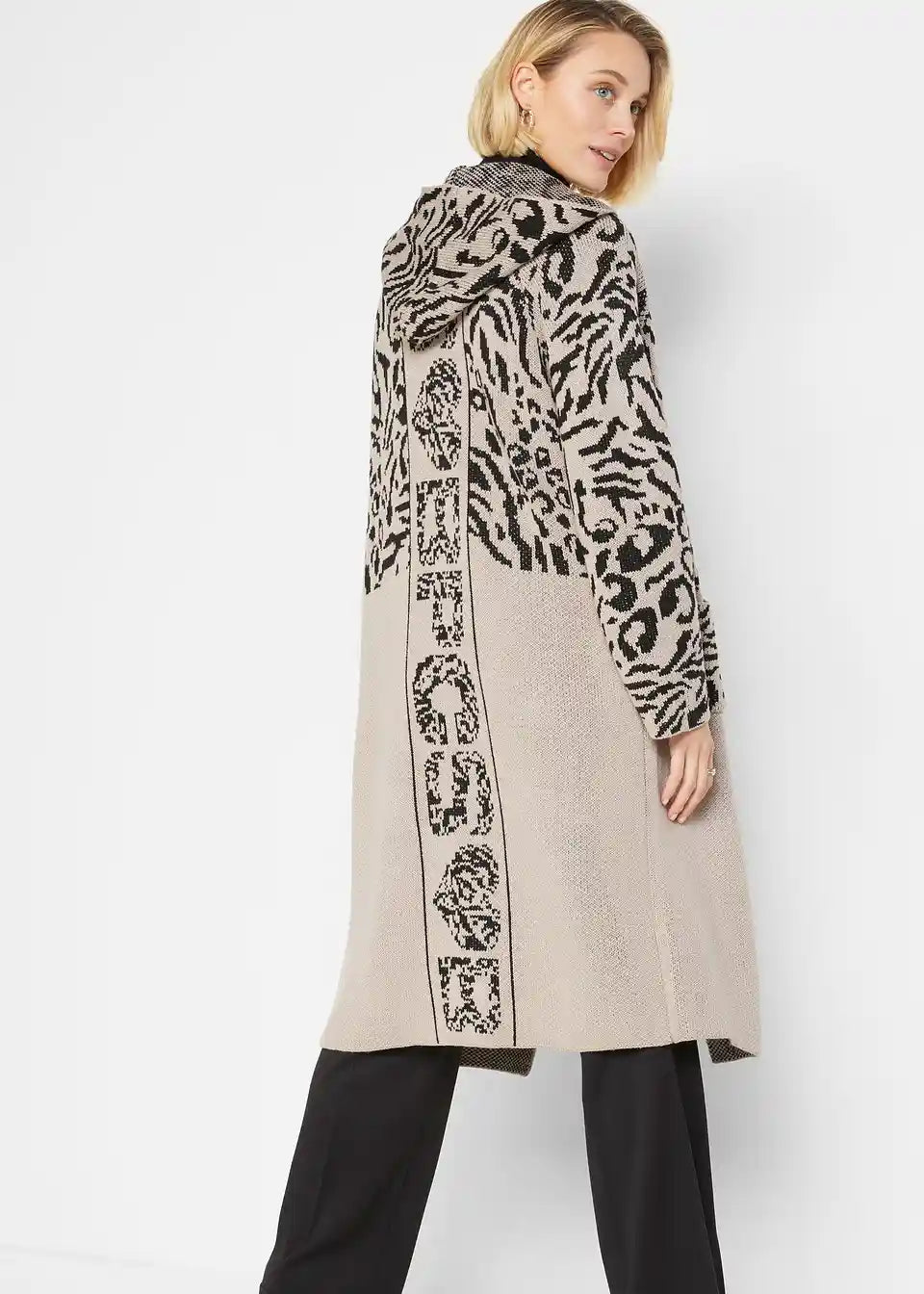 moderan pleteni plašč s kapuco z elementi živalskega vzorca