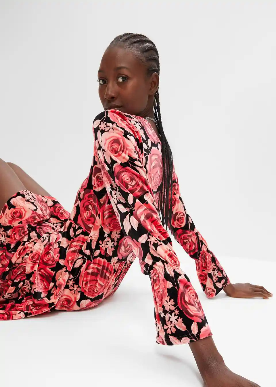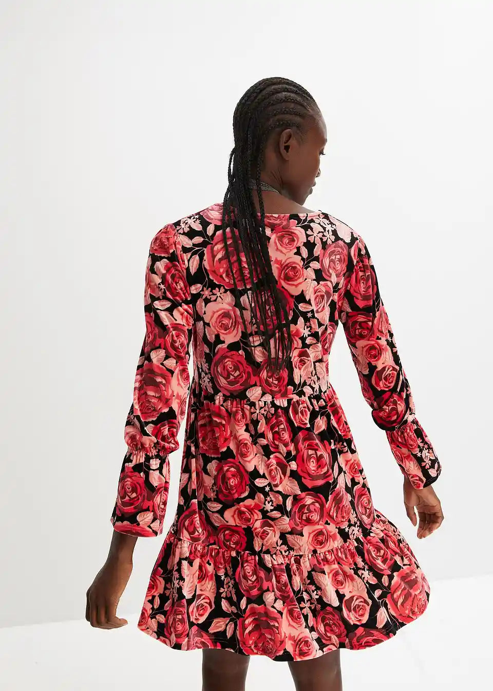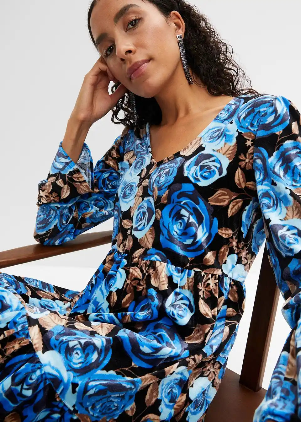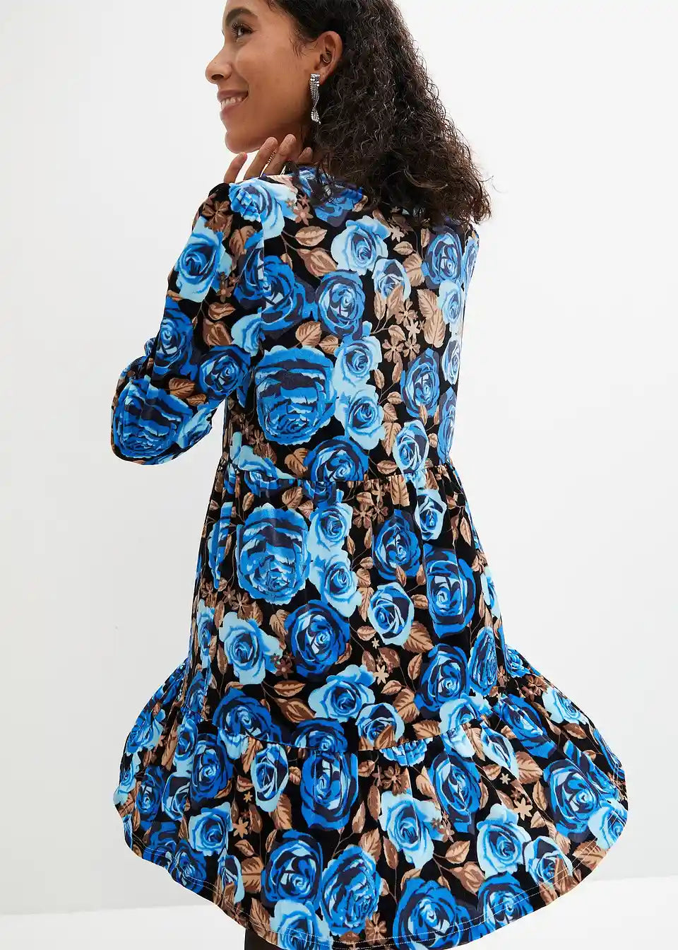 Žametna obleka s cvetličnim potiskom in dolgimi rokavi