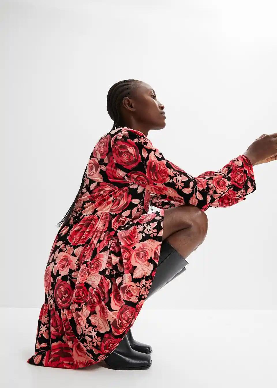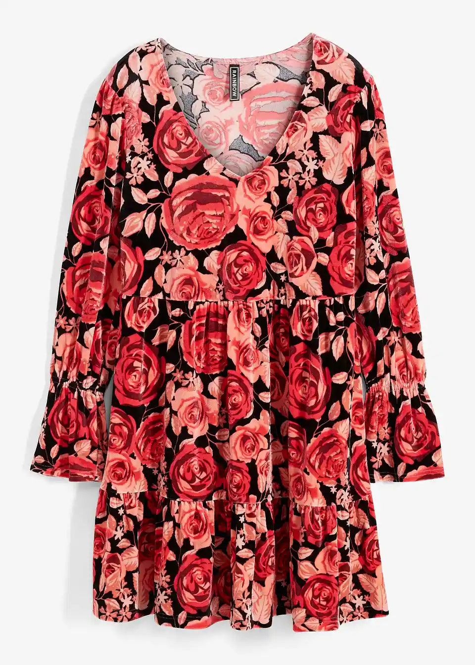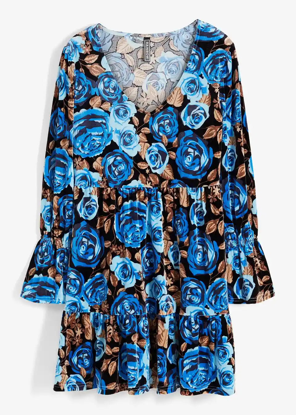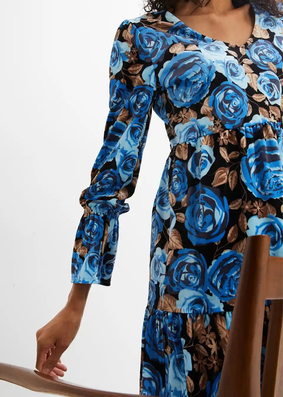 Žametna obleka s cvetličnim potiskom in dolgimi rokavi