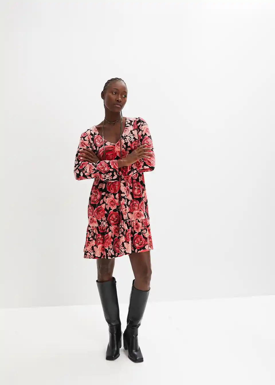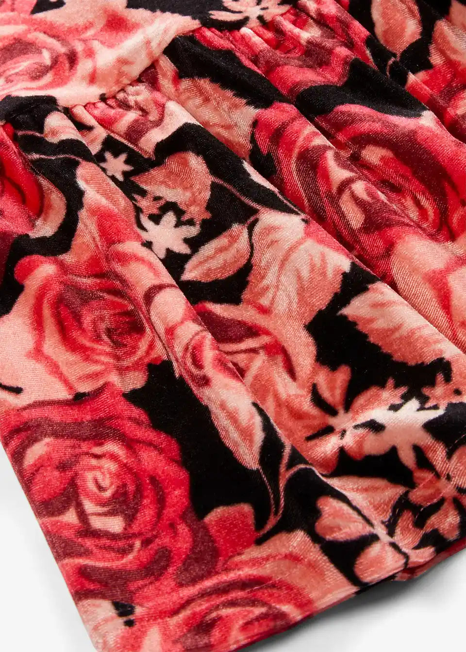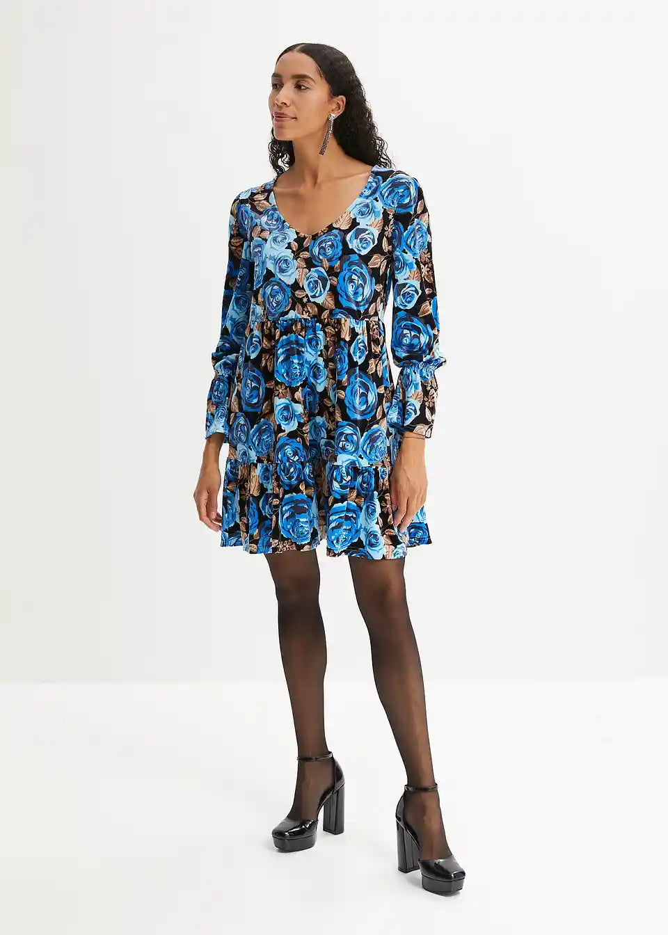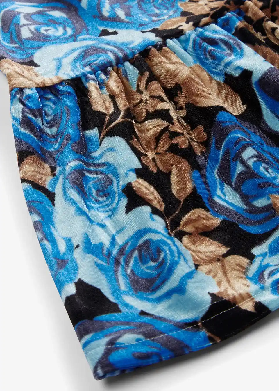 Žametna obleka s cvetličnim potiskom in dolgimi rokavi