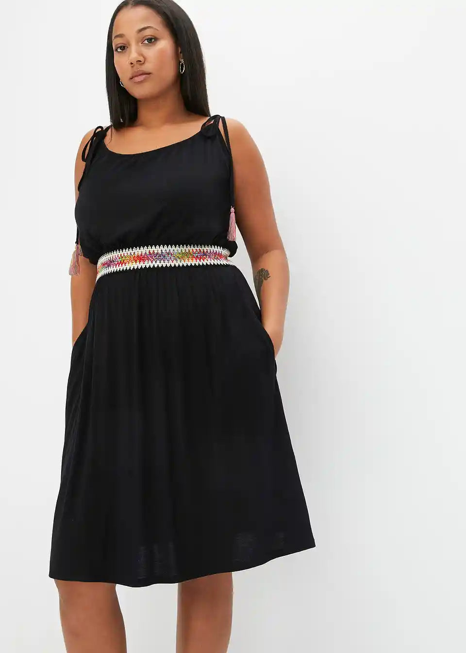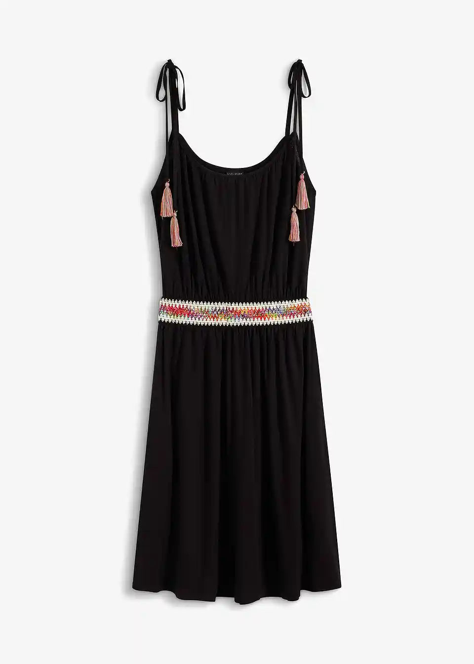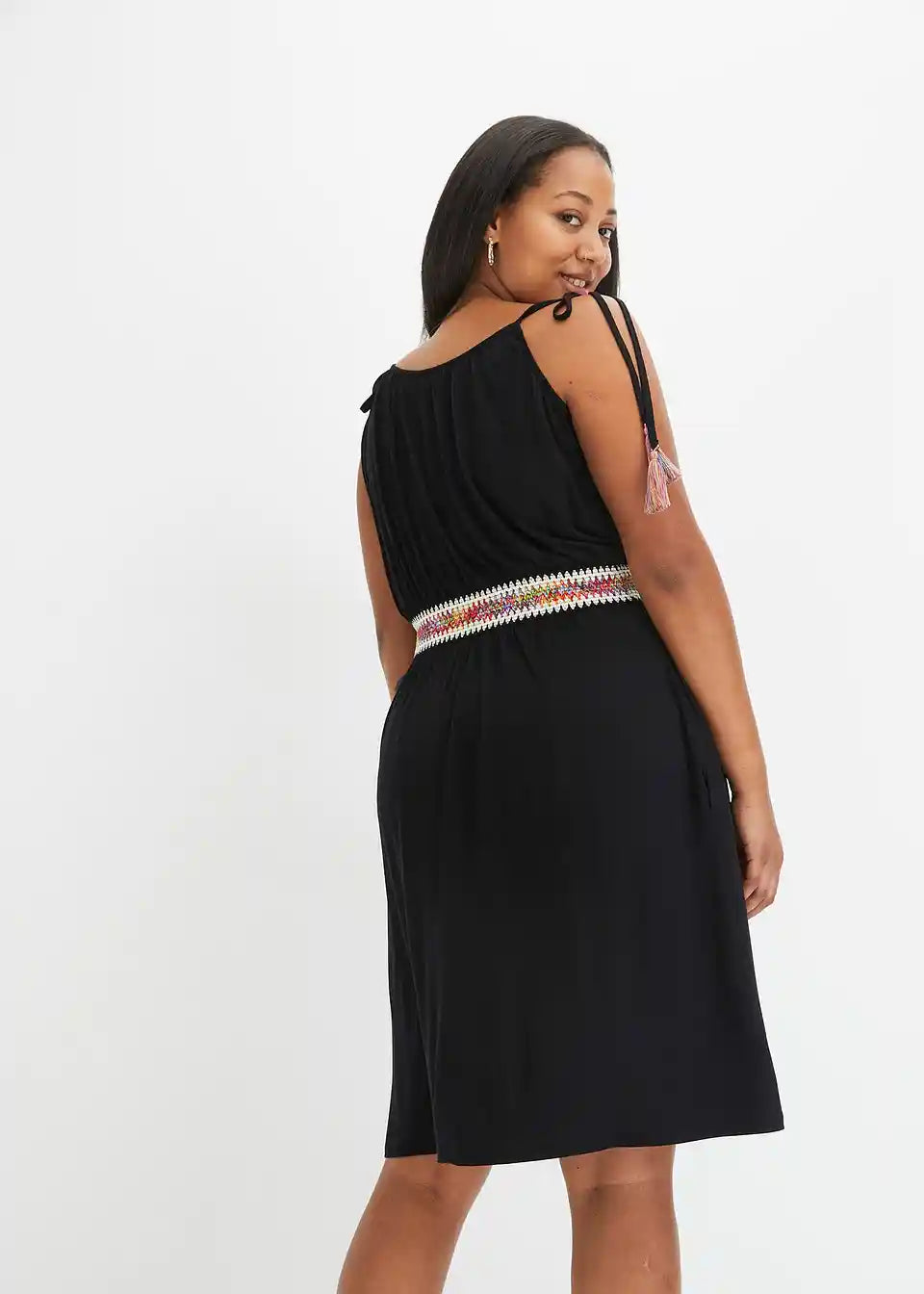 modna obleka z dekorativnim elastičnim delom v pasu in pisanimi cofki na koncih naramnic
