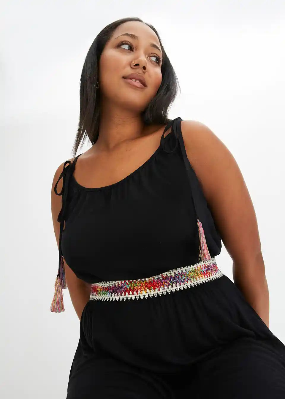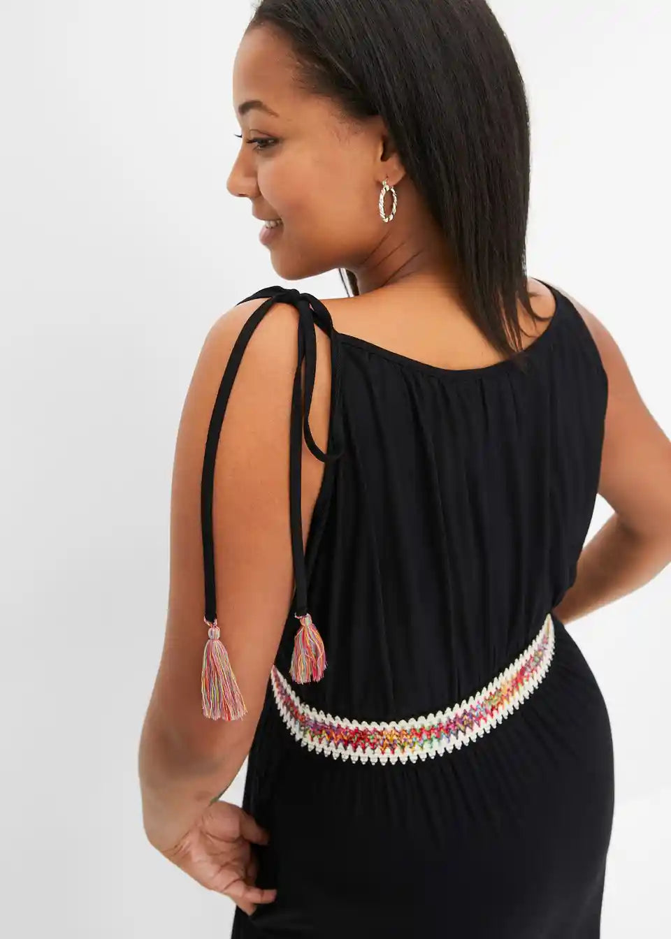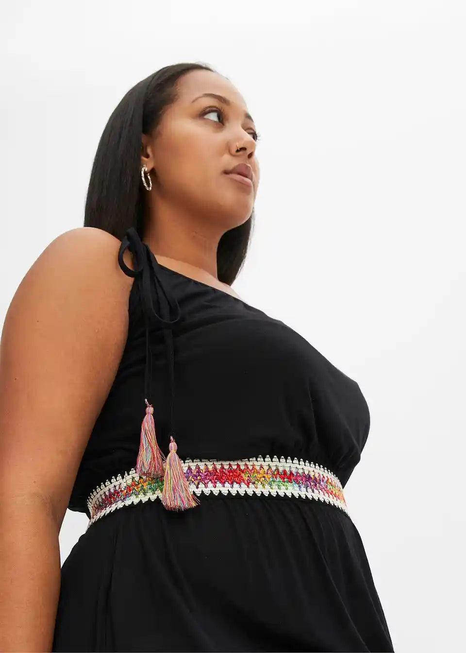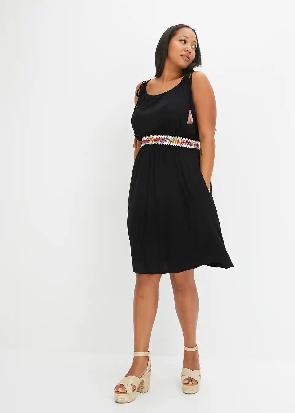 modna obleka z dekorativnim elastičnim delom v pasu in pisanimi cofki na koncih naramnic