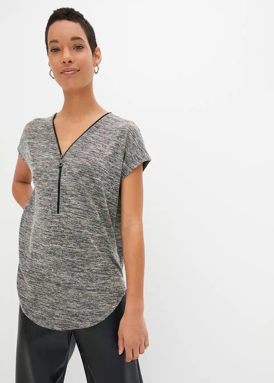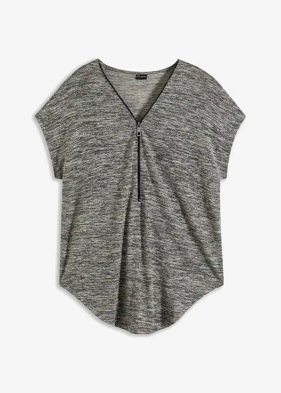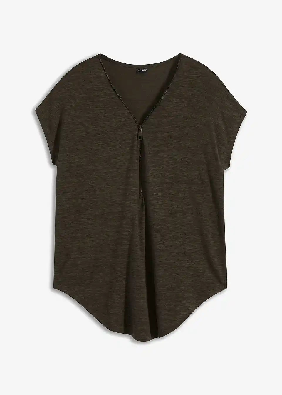 Ohlapen kroj naredi to oversize majico z zadrgo znamke BODYFLIRT sproščeno zgornje oblačilo, ki omogoča sestavljanje mnogih privlačnih outfitov. Model s kratkimi spuščeni rokavi je prijetno širok. Nastavljiva zadrga na V-izrezu omogoča prilagoditev globine izreza. Majica z zaobljenim robom je primerna za nošenje z oprijetimi hlačami, krili in legicami. S širšim spodnjim delom se ustvari izrazito ženstven videz.