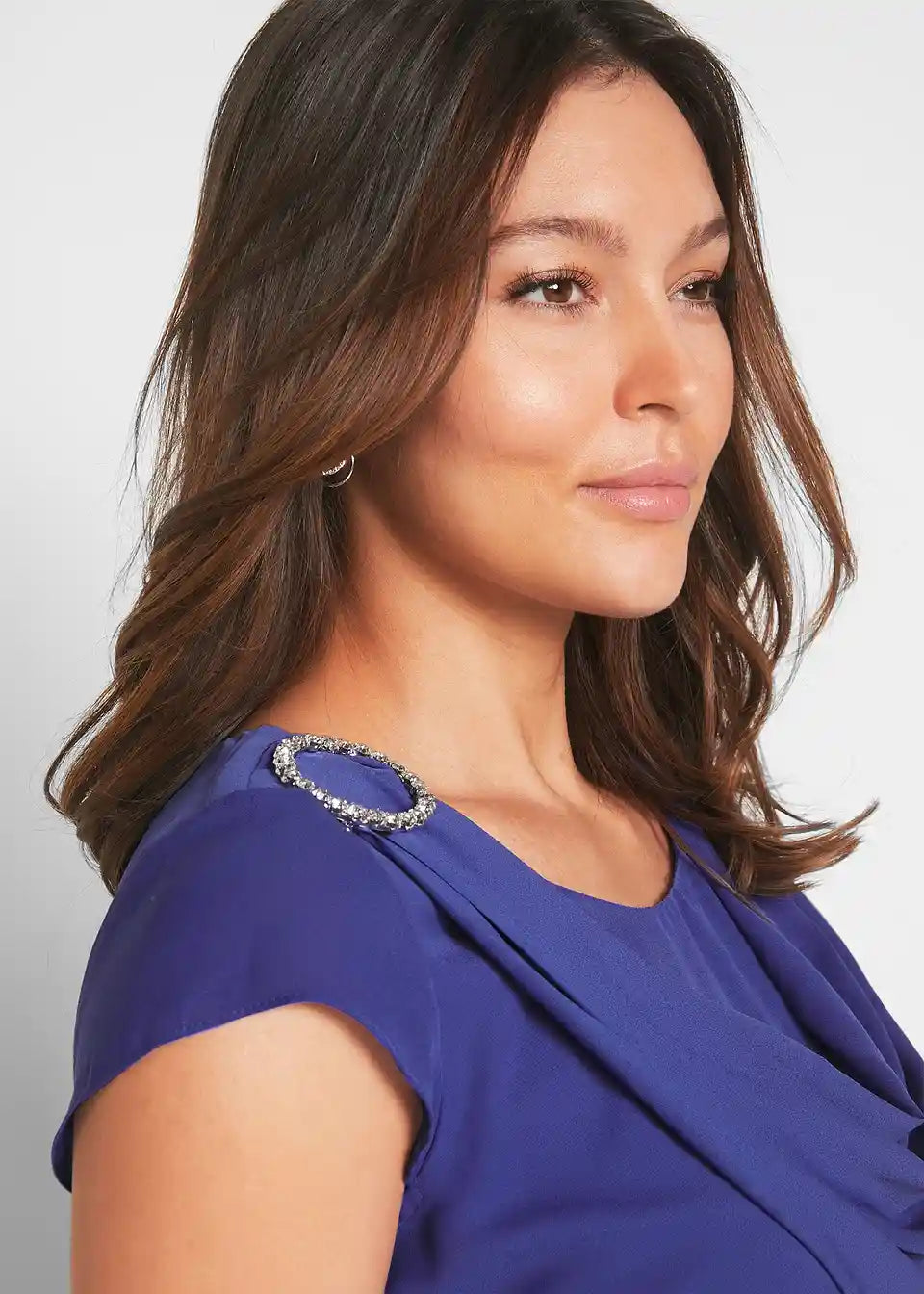 Sproščeno padajoča, oprijeta postave, z broško na desnem ramenu, dolžina približno 98 cm (velikost 36) do približno 104 cm (velikost 54), pralna v pralnem stroju,