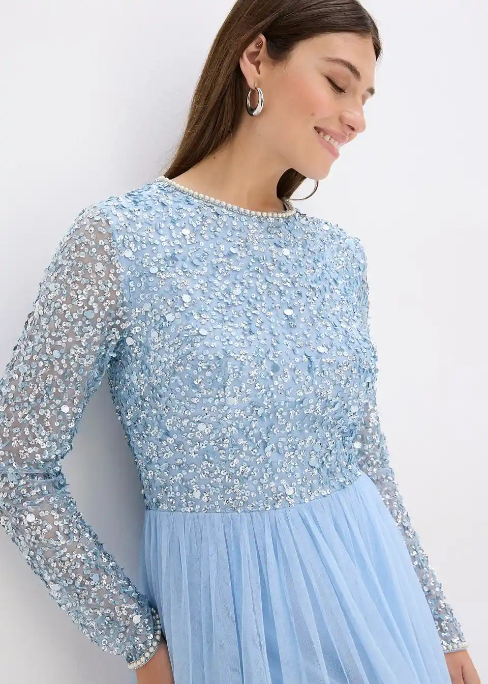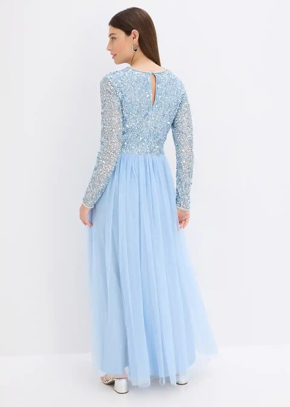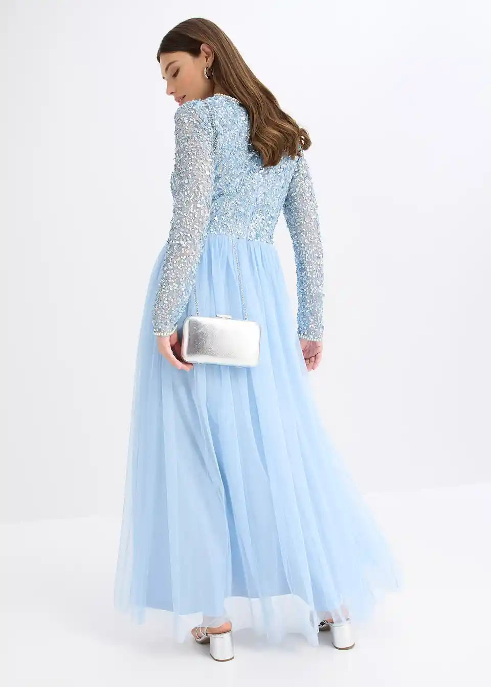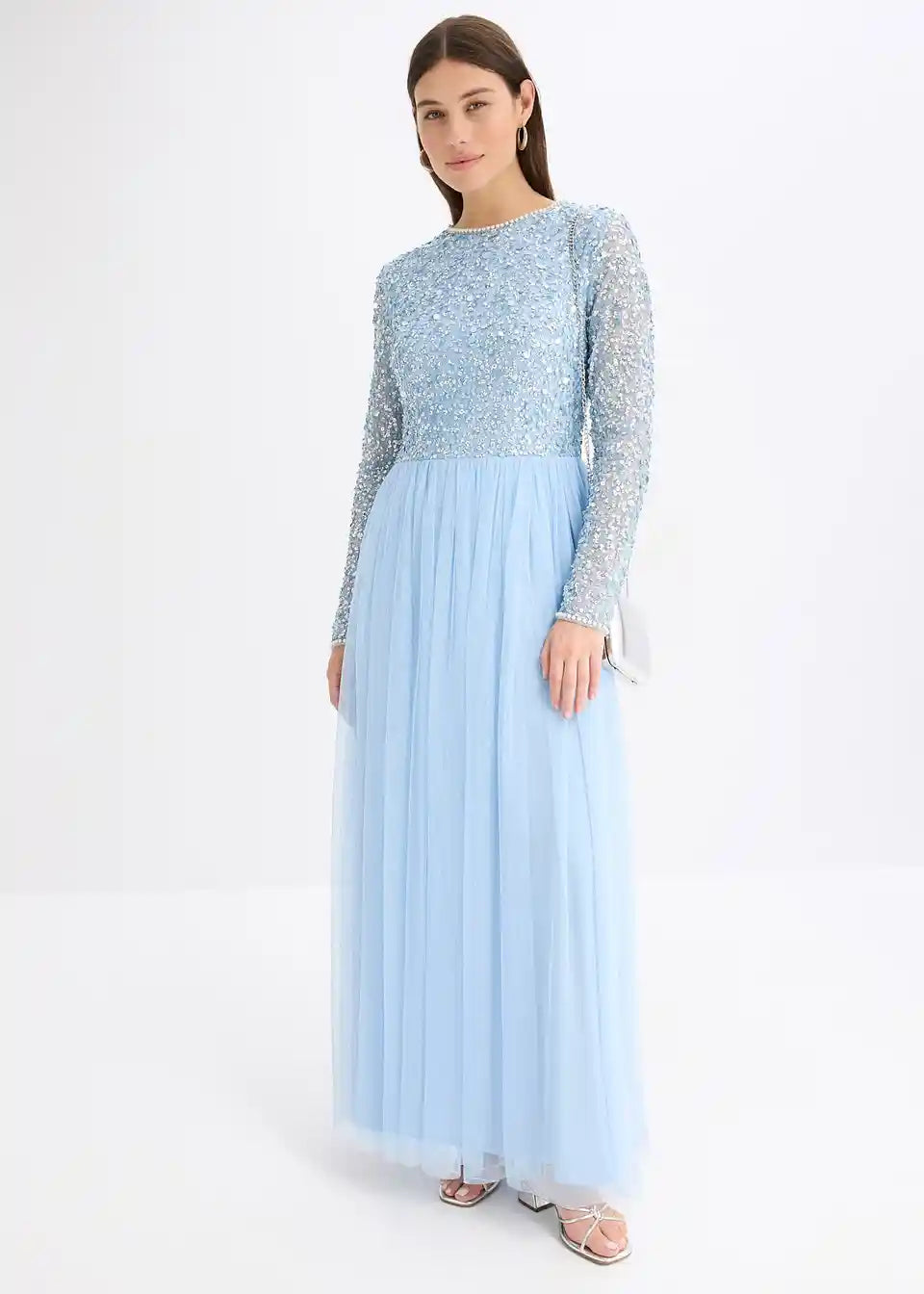 Moderna in ženstvena večerna obleka z vezenino iz bleščic in všitkom z biseri na rokavih ter na izrezu.