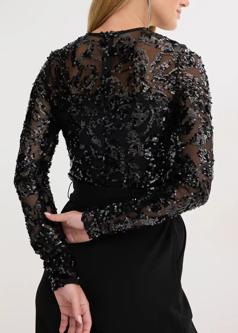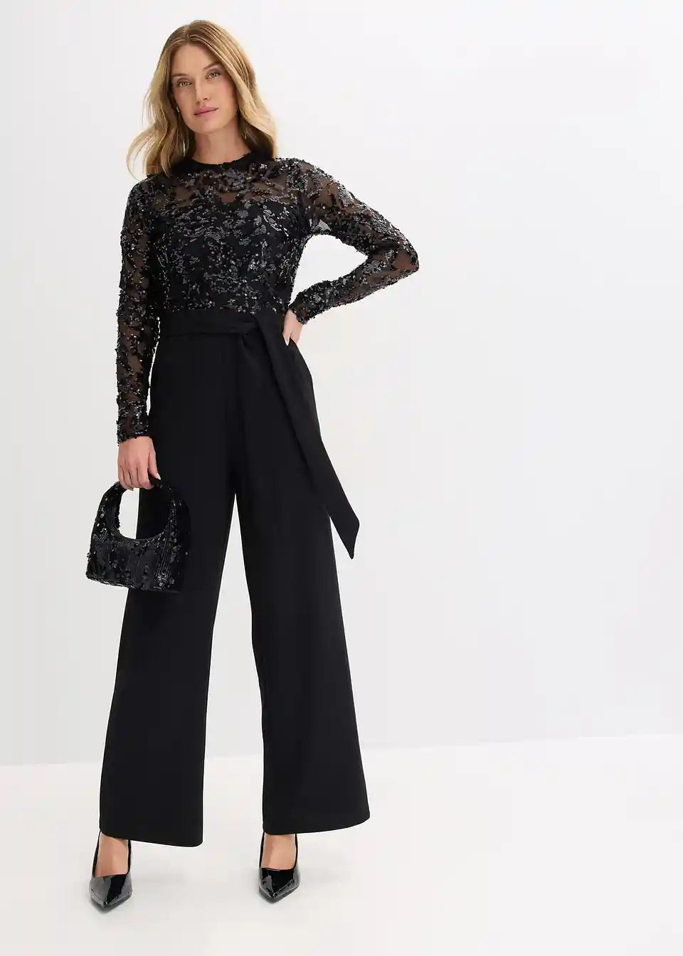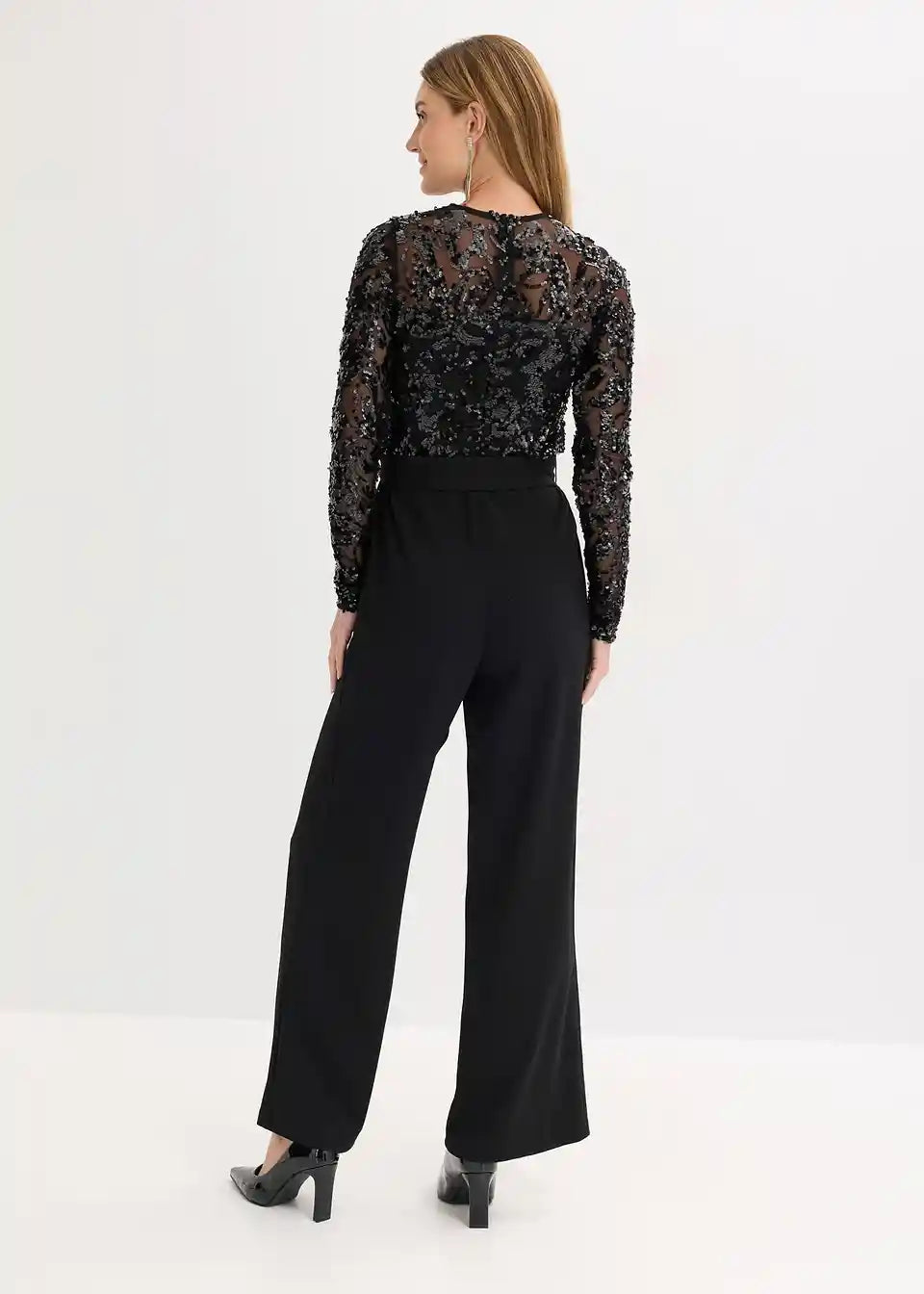 Moderen in ženstven kombinezon z vezenino iz bleščic in detajlom vozla v pasu