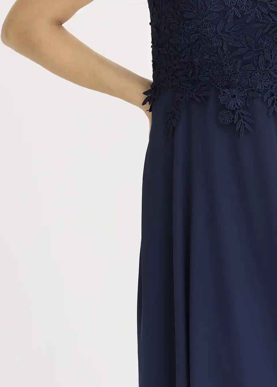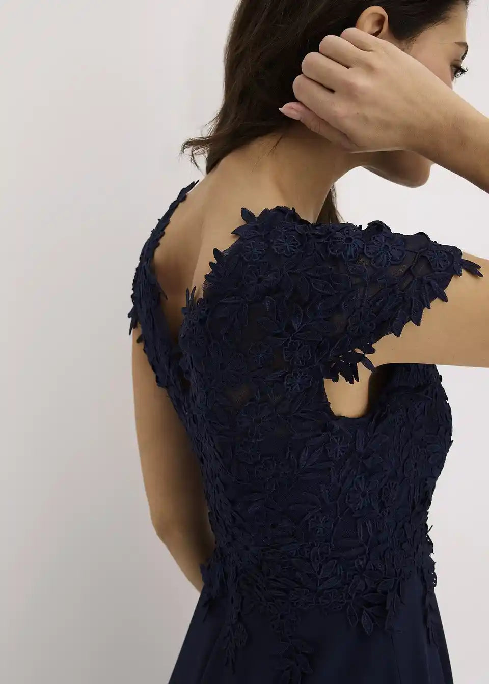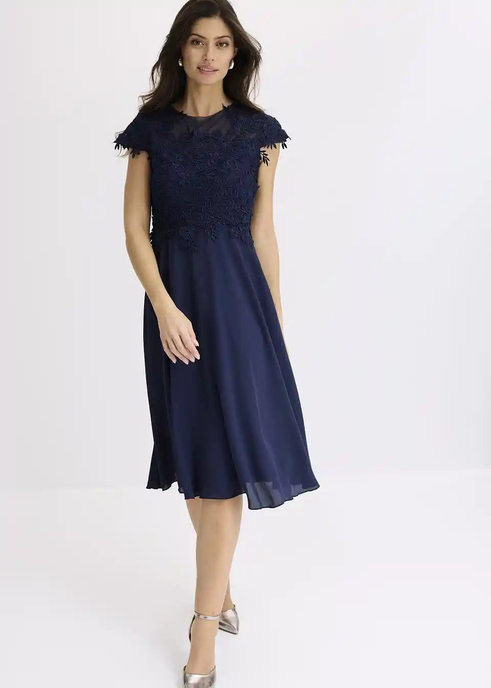 Romantična in ženstvena: koktajl obleka srednje dolžine iz nežnega tila s čipko