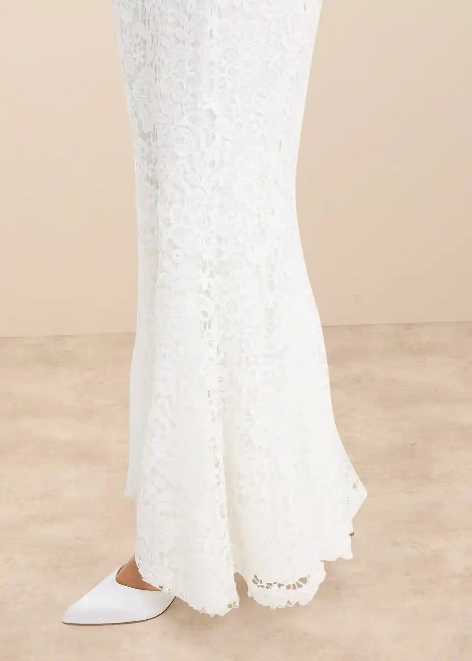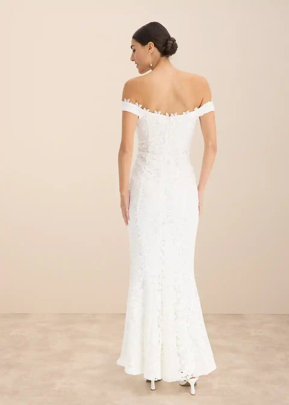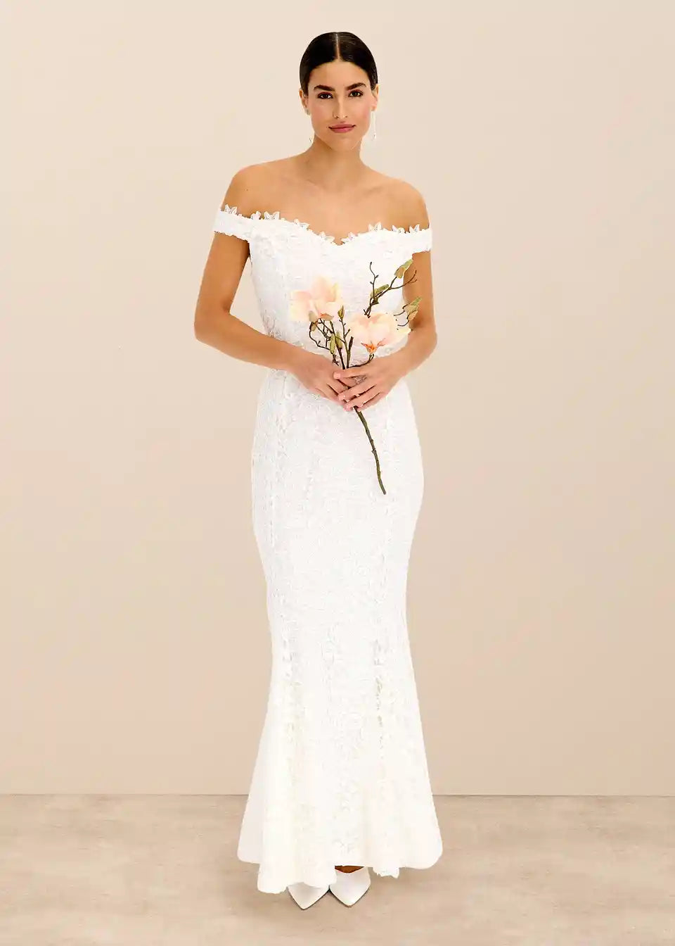Moderna in ženstvena: Oprijeta poročna obleka v kroju morske deklice z očarljivim čipkastim vzorcem in izrezom Carmen