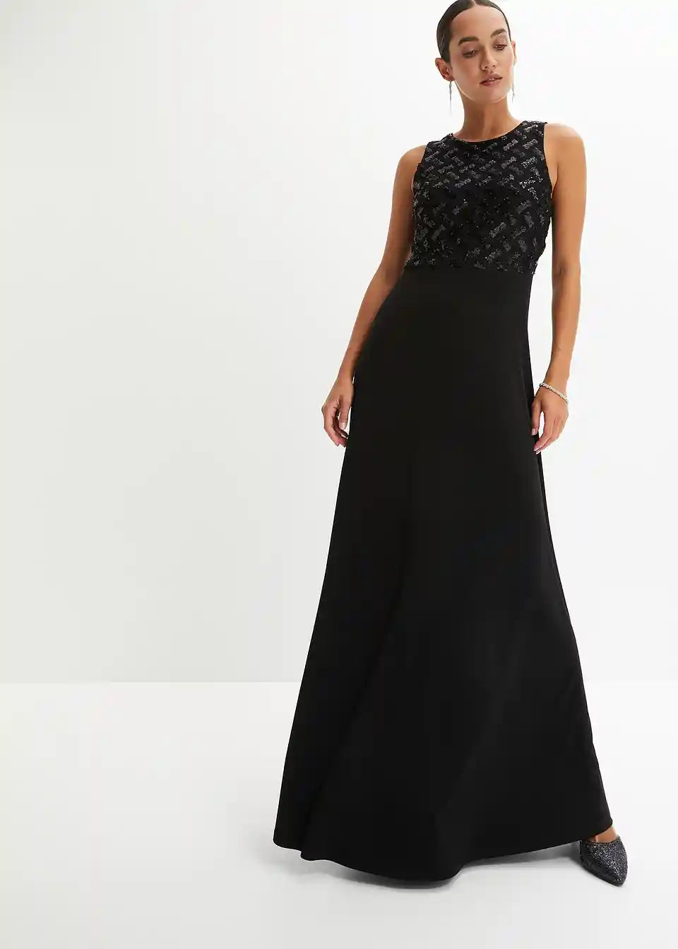 Elegantna večerna obleka s čudovitimi aplikacijami Pailletten na zgornjem delu
