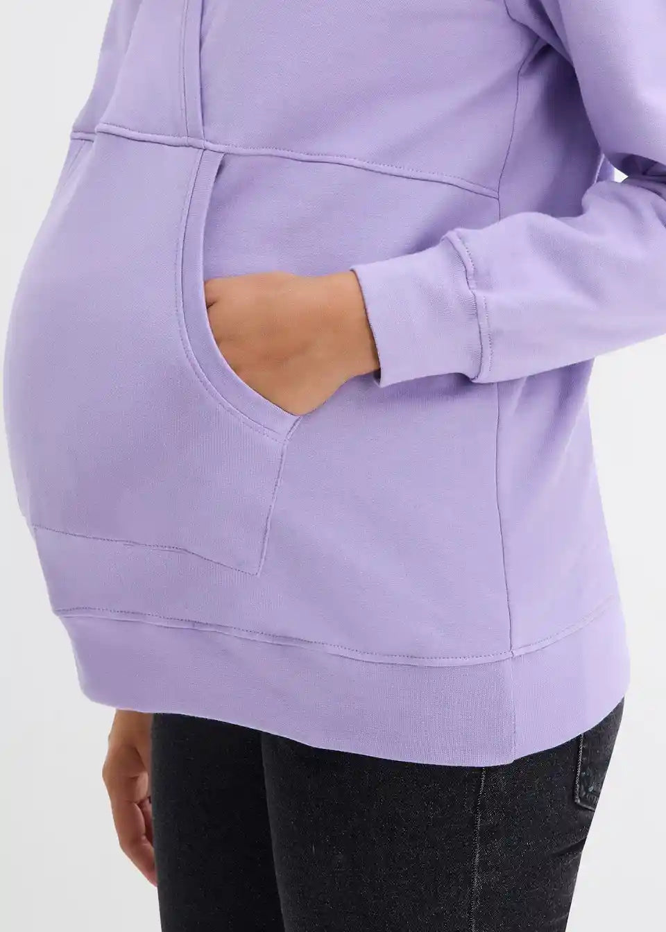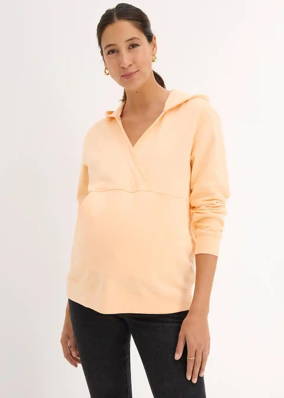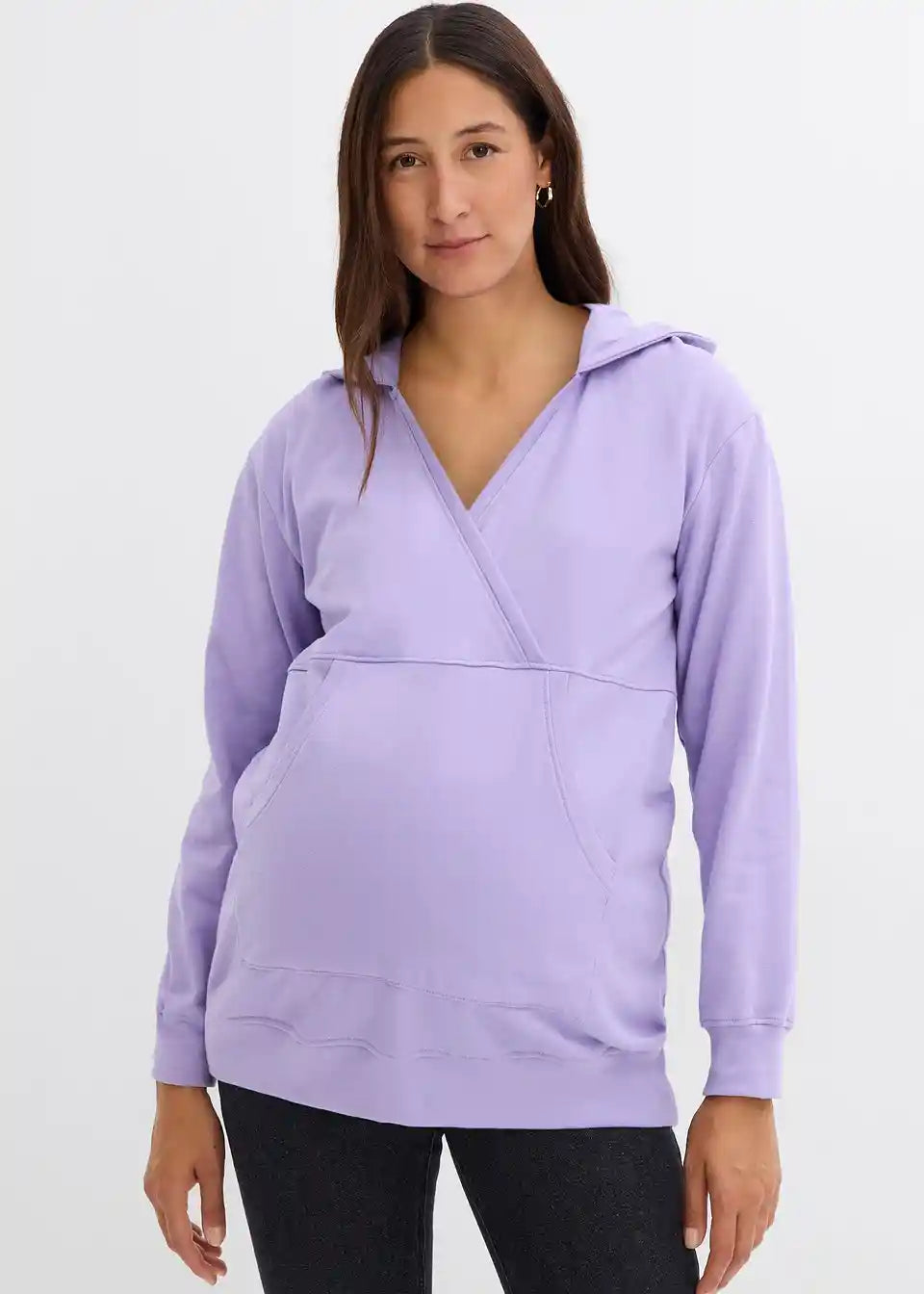 Hoodie za dojenje iz mehke tkanine v kakovosti sweat iz čistega organskega bombaža s kenguru žepom in kapuco. Dolgi rokavi in spodnji rob so opremljeni s prilagodljivimi rebrastimi manšetami. Prekrižani izrez omogoča dojenje.