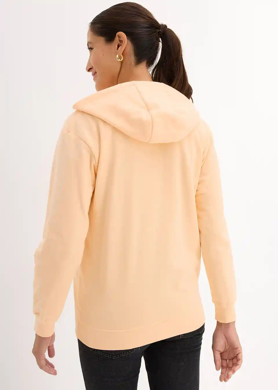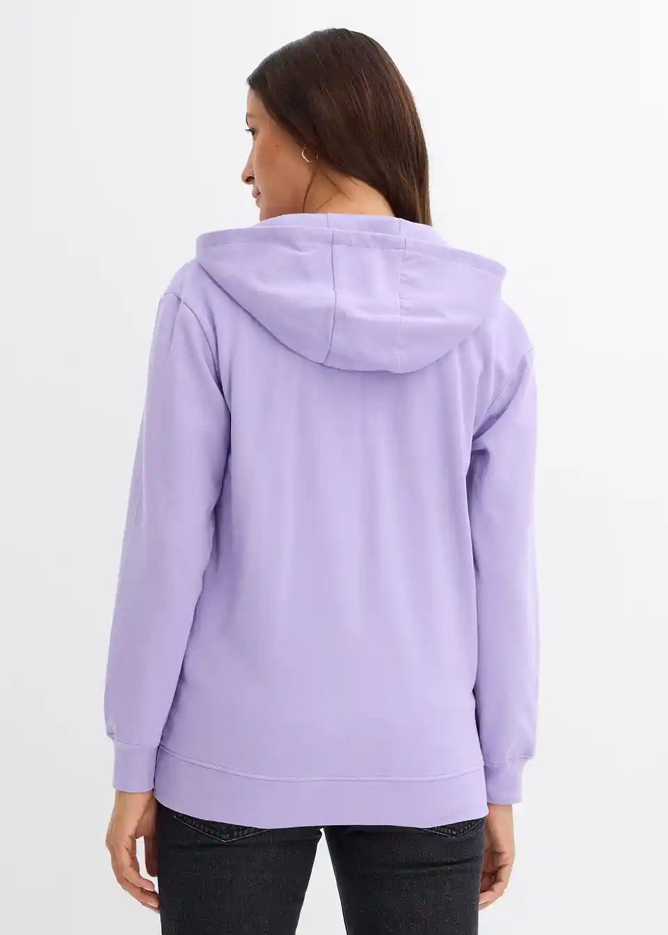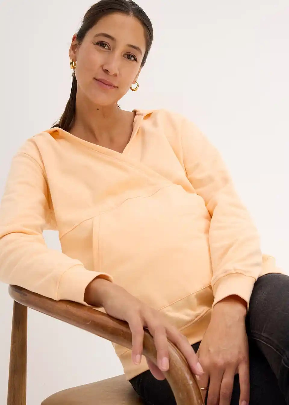 Hoodie za dojenje iz mehke tkanine v kakovosti sweat iz čistega organskega bombaža s kenguru žepom in kapuco. Dolgi rokavi in spodnji rob so opremljeni s prilagodljivimi rebrastimi manšetami. Prekrižani izrez omogoča dojenje.